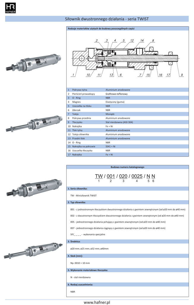Siłownik dwustronnego działania - seria TWIST Rodzaje materiałów użytych do budowy poszczególnych części 1 Pokrywa tylna 2 Pierścień prowadzący Aluminium anodowane 3 O - Ring NBR 4 Magnes Elastyczny (guma) 5 Uszczelka na tłoku NBR 6 Zderzak NBR 7 Tuleja Mosiądz 8 Pokrywa przednia Aluminium anodowane 9 Tłoczysko Stal nierdzewna (AISI 304) 10 Nakrętka Fe + Ni 11 Tłok tylny Aluminium anodowane 12 Tuleja siłownika Aluminium anodowane 13 Przedni tłok Aluminium anodowane 14 O - Ring NBR 15 Nakrętka na pokrywie SS41 + Ni 16 Uszczelka tłoczyska NBR 17 Nakrętka Fe + Ni Budowa numeru katalogowego TW / 001 / 020 / 0025 / N N 1 2 3 4 5 6 1. Seria siłownika: TW - Minisiłownik TWIST 2. Typ siłownika: 001 - z jednostronnym tłoczyskiem dwustronnego działania z gwintem zewnętrznym (od ø20 mm do ø40 mm) 002 - z dwustronnym tłoczyskiem dwustronnego działania z gwintem zewnętrznym (od ø20 mm do ø40 mm) 005 - jednostronnego działania pchający z gwintem zewnętrznym (od ø20 mm do ø40 mm) 007 - jednostronnego działania ciągnący z gwintem zewnętrznym (od ø20 mm do ø40 mm) SP/_ _ _ _ - wykonania specjalne 3. Średnica: ø20 mm; ø25 mm; ø32 mm; ø40mm 4. Skok [mm]: Np. 0010 = 10 mm 5. Wykonanie materiałowe tłoczyska: N - stal nierdzewna 6. Rodzaj uszczelnienia: NBR www.hafner.pl