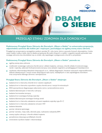 PRZEGLĄD STANU ZDROWIA DLA DOROSŁYCH Podstawowy Przegląd Stanu Zdrowia dla Dorosłych „Dbam o Siebie” to uniwersalna propozycja, odpowiednia zarówno dla kobiet jak i mężczyzn, pozwalająca na ogólną ocenę stanu zdrowia. Przegląd ten proponujemy szczególnie osobom poniżej 35. roku życia, które z powodu licznych obowiązków i braku czasu rzadko myślą o sobie. Jest to idealna propozycja dla osób chcących w szybki i wygodny sposób sprawdzić stan swojego zdrowia oraz dowiedzieć się co zrobić, aby zapobiegać występowaniu chorób w przyszłości. Podstawowy Przegląd Stanu Zdrowia dla Dorosłych „Dbam o Siebie” pozwala na: o gólną ocenę stanu zdrowia możliwość wczesnego wykrycia chorób serca i układu krążenia, cukrzycy, chorób układu krwiotwórczego, nerek i wątroby, zaburzeń funkcjonowania tarczycy oraz zakażeń organizmu przebiegających bezobjawowo u zyskanie rekomendacji lekarskich dotyczących m.in.: dalszej diagnostyki i leczenia wykrytych nieprawidłowości, zaleceń dietetycznych i innych zmian dotyczących stylu życia, niezbędnych w celu zapobiegania chorobom oraz utrzymania dobrego zdrowia i samopoczucia Przegląd Stanu Zdrowia dla Dorosłych „Dbam o Siebie” obejmuje: b adania krwi w kierunku chorób krwi i stanów zapalnych badania krwi w kierunku czynników ryzyka chorób serca i naczyń krwionośnych EKG spoczynkowe diagnozujące zaburzenia rytmu i przewodnictwa serca badanie laboratoryjne w kierunku cukrzycy b adanie hormonalne tarczycy b adania krwi oceniające funkcję wątroby b adania laboratoryjne oceniające funkcję nerek badanie krwi w kierunku zakażenia wirusami zapalenia wątroby typu B i C badanie krwi w kierunku zakażenia wirusem HIV badanie lekarskie p omiar ciśnienia tętniczego p omiar wzrostu, masy ciała, obwodu pasa, wyliczenie wskaźnika BMI o cenę ryzyka cukrzycy i chorób układu krążenia poradnictwo dotyczące profilaktyki chorób omówienie wyników badań i rekomendacje PRZEGLĄDY STANÓW ZDROWIA – PORÓWNANIE PROGRAMÓW Dbam o Siebie Świadoma Kobieta Świadomy Mężczyzna Zdrowy Uczeń Moc Zdrowia badania krwi w kierunku chorób krwi i stanów zapalnych ✓ ✓ ✓ ✓ ✓ badania krwi w kierunku czynników ryzyka chorób serca i naczyń ✓ ✓ ✓ ✓ ✓ EKG spoczynkowe diagnozujące zaburzenia rytmu i przewodnictwa serca ✓ ✓ ✓ Zakres usług Ocena układu krwiotwórczego Ocena układu sercowonaczyniowego Ocena metabolizmu USG tętnic szyjnych oceniające stopień zwężenia i zagrożenie udarem mózgu ✓ test wysiłkowy EKG diagnozujący niedokrwienie serca ✓ Echo serca wykrywające wady serca i nieprawidłowości w funkcji mięśnia sercowego ✓ tomografia komputerowa naczyń wieńcowych wykrywająca obecność zmian miażdżycowych ✓ badanie laboratoryjne w kierunku cukrzycy ✓ ✓ ✓ ✓ ✓ badania hormonalne tarczycy ✓ ✓ ✓ ✓ ✓ ✓ ✓ badanie USG tarczycy diagnozujące zapalenie, wole i nowotwory gruczołu tarczowego Ocena wątroby i funkcji nerek ✓ badania krwi oceniające funkcje wątroby ✓ ✓ ✓ badania laboratoryjne oceniające funkcje nerek ✓ ✓ ✓ ✓ ✓ badanie mikroalbuminurii w kierunku wczesnego uszkodzenia nerek Wykrywanie zakażeń bezobjawowych ✓ badanie krwi w kierunku zakażenia wirusami zapalenia wątroby typu B i C ✓ ✓ ✓ ✓ badanie krwi w kierunku zakażenia wirusem HIV ✓ ✓ ✓ ✓ badanie krwi w kierunku boreliozy Ocena narządów jamy brzusznej i układu moczowego Ocena narządów rozrodczych żeńskich i piersi ✓ badanie USG pozwalające rozpoznać nieprawidłowości w budowie i funkcji narządów wewnętrznych, w tym zmiany nowotworowe i torbiele ✓ ✓ ✓ badanie laboratoryjne w kierunku raka jelita grubego ✓ ✓ konsultacja i badanie ginekologiczne ✓ ✓ badanie cytologiczne w kierunku wczesnego wykrycia raka szyjki macicy ✓ ✓ badanie USG narządów rozrodczych żeńskich w kierunku nieprawidłowości budowy i funkcji oraz nowotworów ✓ ✓ ocena USG/mammograficzna sutka w kierunku wczesnego wykrywania raka ✓ ✓ badania laboratoryjne w kierunku predyspozycji do wystąpienia raka sutka, jajnika i szyjki macicy Ocena narządów rozrodczych męskich ✓ ✓ ocena USG gruczołu krokowego przez powłoki brzuszne w kierunku przerostu ✓ ✓ badania krwi w kierunku raka gruczołu krokowego ✓ ✓ badanie USG gruczołu krokowego i jąder w kierunku przerostu i nowotworów ✓ Diagnostyka przewlekłych chorób układu oddechowego spirometria w kierunku wykrycia m.in. astmy, przewlekłej obturacyjnej choroby płuc ✓ RTG klatki piersiowej w kierunku stanów zapalnych, nowotworów ✓ Ocena całego organizmu rezonans magnetyczny całego ciała wykrywający wady rozwojowe, nowotwory, procesy zapalne, zmiany niedokrwienne, degeneracyjne i pourazowe ✓ Konsultacja internisty lub pediatry lub lekarza medycyny rodzinnej badanie lekarskie ✓ ✓ ✓ ✓ ✓ pomiar ciśnienia tętniczego ✓ ✓ ✓ ✓ ✓ pomiar wzrostu, masy ciała, obwodu pasa, wyliczenie BMI ✓ ✓ ✓ ✓ ✓ ocena ryzyka cukrzycy i chorób układu krążenia ✓ ✓ ✓ ✓ ✓ poradnictwo dotyczące profilaktyki chorób ✓ ✓ ✓ ✓ ✓ omówienie wyników badań i rekomendacje ✓ ✓ ✓ ✓ ✓