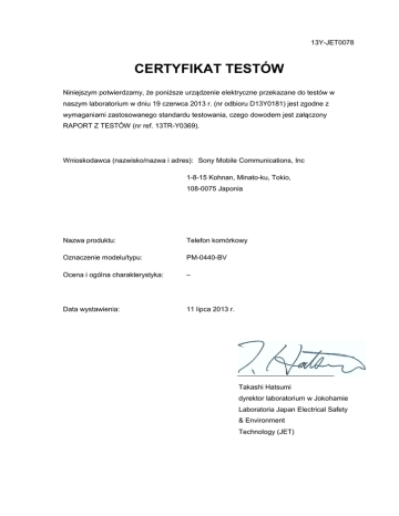 13Y-JET0078 CERTYFIKAT TESTÓW Niniejszym potwierdzamy, że poniższe urządzenie elektryczne przekazane do testów w naszym laboratorium w dniu 19 czerwca 2013 r. (nr odbioru D13Y0181) jest zgodne z wymaganiami zastosowanego standardu testowania, czego dowodem jest załączony RAPORT Z TESTÓW (nr ref. 13TR-Y0369). Wnioskodawca (nazwisko/nazwa i adres): Sony Mobile Communications, Inc 1-8-15 Kohnan, Minato-ku, Tokio, 108-0075 Japonia Nazwa produktu: Telefon komórkowy Oznaczenie modelu/typu: PM-0440-BV Ocena i ogólna charakterystyka: – Data wystawienia: 11 lipca 2013 r. Takashi Hatsumi dyrektor laboratorium w Jokohamie Laboratoria Japan Electrical Safety & Environment Technology (JET) Nr referencyjny raportu: 13TR-Y0219 RAPORT Z TESTÓW Nr referencyjny raportu: 13TR-Y0369 Data i nr odbioru: 19 czerwca 2013 r. (D13Y0181) Wnioskodawca (nazwisko/nazwa i adres): Sony Mobile Communications, Inc 1-8-15 Kohnan, Minato-ku, Tokio, 108-0075 Japonia Nazwa produktu: Telefon komórkowy Oznaczenie modelu/typu: PM-0440-BV Ocena i ogólna charakterystyka: – Standard testowania: JIS C 0920:2003 (IEC 60529:2001) Stopnie ochrony zapewnianej przez obudowy (kod IP) Wynik testów: Zaliczone Data wystawienia: 11 lipca 2013 r. Takashi Hatsumi dyrektor laboratorium w Jokohamie Laboratoria Japan Electrical Safety & Environment Technology (JET) Strona 1 z 15 Nr referencyjny raportu: 13TR-Y0219 Laboratorium testujące Laboratoria Japan Electrical Safety & Environment Technology Laboratorium JET w Tokio 5–14–12 Yoyogi, Shibuya–ku, Tokio, 151–8545 Japonia Laboratorium JET w Jokohamie 1–12–30 Motomiya, Tsurumi-ku, Jokohama, 230–0004 Japonia Laboratorium JET w Kansai 3–9–1 Nakouji, Amagasaki-shi, Hyogo, 661–0974 Japonia Data otrzymania próbek: 1 lipca 2013 r. Data przeprowadzenia testów: 3 lipca 2013 r. Osoba przeprowadzająca testy (+ podpis): lkuyo Kanai Osoba zatwierdzająca wyniki (+ podpis): Yoshikatsu Nakajima Możliwe oceny wyników poszczególnych testów: Nd (nie dotyczy) Element testu nie ma zastosowania do przedmiotu Z (zaliczone) — przedmiot testu spełnia wymagania Nz (niezaliczone) — przedmiot testu nie spełnia wymagań Uwagi ogólne Wyniki testów przedstawione w niniejszym raporcie odnoszą się tylko do przetestowanego przedmiotu. Niniejszego raportu nie należy rozpowszechniać we fragmentach bez uzyskania pisemnej zgody laboratorium JET. Strona 2 z 15 Nr referencyjny raportu: 13TR-Y0369 Wymagania techniczne, JIS C 0920:2003 (IEC 60529:2001) Punkt Wymagania — test 11 Ogólne wymagania dotyczące testów 11.1 Warunki atmosferyczne dla testów Wynik Z dotyczących wody lub kurzu Zakres temperatury: od 15°C do 35°C 25°C Wilgotność względna: od 25% do 75% 59% Ciśnienie atmosferyczne: od 86 kPa do 100,9 kPa 106 kPa Strona 3 z 15 Ocena Nr referencyjny raportu: 13TR-Y0369 Wymagania techniczne, JIS C 0920:2003 (IEC 60529:2001) Punkt 11.2 Wymagania — test Wynik Ocena Testowane urządzenia Testowane próbki – Nowy, czysty egzemplarz Nowy egzemplarz – Pełne wyposażenie Pełne wyposażenie – Reprezentatywne części – – Mniejszy sprzęt o konstrukcji identycznej z egzemplarzem w pełnej skali – – Liczba testowanych próbek 8 zestawów Test odporności na kurz: 00440254-081361-9 1 zestaw 00440254-081289-2 1 zestaw 00440254-081454-2 1 zestaw Test odporności na wodę: Test drugiej cyfry charakterystycznej 5 00440254-081421-1 1 zestaw 00440254-081477-3 1 zestaw Test drugiej cyfry charakterystycznej 5 00440254-081290-0 1 zestaw 00440254-081456-7 1 zestaw 00440254-081211-6 1 zestaw Powyższe numery są numerami identyfikacyjnymi testowanych próbek – Warunki montażu, składania i umiejscowienia próbek – – Warunki wstępne Brak Strona 4 z 15 Nr referencyjny raportu: 13TR-Y0369 Wymagania techniczne, JIS C 0920:2003 (IEC 60529:2001) Punkt 11.3 Wymagania — test Wynik – Test z włączonym zasilaniem lub bez Brak – Test z częściami będącymi w ruchu Brak Ocena Zastosowanie wymagań testu oraz interpretacja jego wyników Zastosowanie ogólnych wymagań testów i Bez otworów odpływowych i otworu akceptacja stanu sprzętu zawierającego wentylacyjnego otwory odpływowe lub otwór wentylacyjny „dany standard” zależy od „odpowiedniego Komitetu technicznego” lub „danego standardu” Standard zastosowany do interpretacji „dany standard” wyników testów zależy od „odpowiedniego Komitetu technicznego” lub „danego standardu” 11.4 Kombinacja warunków testowych dla pierwszej cyfry charakterystycznej Według tabeli 5 11.5 Pierwsza cyfra charakterystyczna 5 Puste obudowy (Obudowa przetestowana bez wewnętrznego wyposażenia) Z wyposażeniem wewnątrz lub bez Zmiana rozmieszczenia i wzajemnej separacji części w wyniku penetracji ciał obcych Strona 5 z 15 – – Nr referencyjny raportu: 13TR-Y0369 Wymagania techniczne, JIS C 0920:2003 (IEC 60529:2001) Punkt Wymagania — test Wynik 13 Testy ochrony przed stałymi ciałami obcymi oznaczonej pierwszą cyfrą charakterystyczną 13.4 Test dotyczący kurzu dla cyfr Ocena Z charakterystycznych 5 i 6 Użycie komory pyłowej pokazanej na rys. 2 Użycie testowej komory pyłowej Pierwsza cyfra charakterystyczna 5 13.4A Obudowy kategorii 1 – 2 godziny (tempo odsysania: 40–60 – objętości na godzinę) Kontynuacja do czasu odessania 80 objętości – lub upłynięcia 8 godzin (tempo odsysania: 40 objętości na godzinę). 13.4B Obudowy kategorii 2 Na żądanie wnioskodawcy Kontynuacja przez 8 godzin 8 godzin Strona 6 z 15 Nr referencyjny raportu: 13TR-Y0369 Wymagania techniczne, JIS C 0920:2003 (IEC 60529:2001) Punkt Wymagania — test Wynik Ocena Obudowy kategorii 1 i 2 Jeśli próbka testowa (obudowa) nie może być Pełne wyposażenie w całości poddana testom w komorze testowej, Ekrany dwóch próbek skierowane do należy zastosować następującą procedurę: góry, a ekran jednej próbki skierowany w dół – Testowanie poszczególnych części – zamkniętych obudowy. 13.4C –