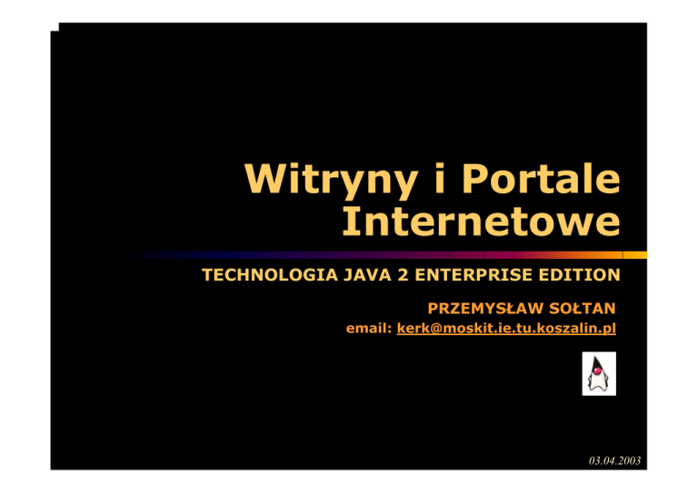 Witryny i Portale Internetowe TECHNOLOGIA JAVA 2 ENTERPRISE EDITION PRZEMYSŁAW SOŁTAN email: [email protected] 03.04.2003 Co powinieneś znać? • • • • Podstawy HTML Programowanie obiektowe Programowanie w Javie Bazy danych 2 Cel ! • Tworzenie stron WWW w oparciu o – Java Server Pages – servlety • Korzystanie z usług technologii J2EE • Wykorzystanie BAZ DANYCH • Instalowanie i obsługa aplikacji webowych na wzorcowych serwerach – Tomcat – J2EE server 3 Zagadnienia poruszane na zajęciach • • • • • • • • Serwery WWW i serwery aplikacji Technologia Java 2 Enterprise Edition JSP i serwlety JDBC i SQL Java Bean i Enterprise Java Bean Transakcje Bezpieczeństwo XML 4 Literatura • • • • • • • „Java Server Pages - Java Server Pages oraz inne komponenty JavaPlatform” Wojciech Romowicz, Helion 2001 „Java Server Pages - podręcznik z przykładami” James Goodwill, Helion 2001 „Java Server Pages od podstaw” Maneesh Sahu, Translator 2001 „Thinking in Java - edycja polska” Bruce Eckel, Helion 2001 „Java - aplikacje bazodanowe” Michał Grochala, Helion 2001 „Po prostu XML” Elizabeth Castro, Helion 2001 „Core - Servlets and JavaServer Pages” Marty Hall, Prentice Hall & Sun Microsystems - www.coreservlets.com • Sun Microsystems - www.java.sun.com 5 Systemy wielowarstwowe N-tier 6 Ewolucja systemów wielowarstwowych Systemy Systemy monolityczne monolityczne Client/server Client/server N-Tier N-Tier 7 Systemy monolityczne terminal terminal terminal terminal terminal terminal Aplikacja Aplikacja terminal terminal Dane MainFrame 8 Systemy monolityczne • Systemy zawierające całość logiki prezentacji, biznesu i dostępu do danych. Brak możliwości wymiany danych z innymi aplikacjami (integrowanie danych) • Niestandardowy dostęp do danych (uzależnienie od wybranego systemu baz danych) • Wielokrotne tworzenie (programowanie) tej samej funkcjonalności systemu • Duże koszty i słaba wydajność 9 Client/Server Aplikacja Aplikacja kliencka kliencka ODBC lub własny interfejs DBMS DBMS Dane Klient Serwer 10 Client/Server • Uproszczenie tworzenia i administracji złożonych aplikacji • Podział aplikacji na część klienta i serwer • Zapis danych w bazie z możliwością ich użycia przez inną aplikację • Rozproszenie zasad biznesowych (klient i procedury składowane DBMS) • Dostęp do danych przez wielu klientów 11 N-Tier Przeglądarka Przeglądarka internetowa internetowa Serwer Serwer webowy webowy Serwer Serwer aplikacji aplikacji Dane Warstwa prezentacji Warstwa logiki biznesowej Warstwa danych 12 N-Tier • Technologia obiektów rozproszonych: – rozbicie aplikacji na samozarządzalne komponenty – współdziałanie komponentów pomiędzy różnymi sieciami i systemami operacyjnymi • Integracja ze starszymi technologiami technologia konektorów 13 N-Tier • • • • Skalowalność, wydajność Niezawodność i spójność danych Scentralizowanie zarządzania i administracja Zmniejszenie kosztów utrzymania systemów klienckich (klient w postaci przeglądarki WWW) • Wielokrotne wykorzystanie kodu komponentów • Integracja systemów monitorujących pracę serwera aplikacji 14 N-Tier • Bezpieczeństwo - stosowanie firewall’i pomiędzy poszczególnymi warstwami aplikacji • Implementacja puli zasobów (resource pooling) mechanizmu zwiększającego wydajność aplikacji • Łatwiejsze wykrywanie punktów spowalniających działanie aplikacji. • Łatwiejsza lokalizacja błędów poszczególnych warstw 15 N-Tier • Zwiększenie obciażenia poprzez dodatkową komunikację pomiędzy warstwami • Skupienie się na realizacji rozwiązań stosowanych w aplikacji • Łatwość przenoszenia aplikacji do na inne serwery aplikacji 16 N-Tier - zadania • • • • Organizacja i rozdzielanie żądań Autoryzacja użytkowników Obsługa wielozadaniowości Kierowanie zadań do innych maszyn w przypadku awarii • Monitorowanie działania aplikacji 17 N-Tier - aplikacja Jak stworzyć aplikację? • niezawodną • bezpieczną • wydajną Należy dokonać logicznego podziału aplikacji na warstwy tak, aby każda z nich realizowała własne zadanie. 18 Podział na warstwy • warstwa prezentacji • warstwa logiki biznesowej • warstwa danych 19 Podział na warstwy Izolacja: • podział aplikacji na warstwy w ten sposób, aby zmiany w jednej z nich miały jak najmniejszy wpływ na drugą • podniesienie efektywności modyfikacji aplikacji (np. zastosowanie innego mechanizmu baz danych, czy też zmiana sposobu prezentacji danych u klienta) 20 Warstwa prezentacji • Komponenty odpowiedzialne za wygląd aplikacji po stronie klienta – strony JSP – serwlety – aplety Java – aplikacje 21 Warstwa prezentacji HTTP(s) JSP JSP Przeglądarka Przeglądarka internetowa internetowa Klient HT ML /XM L Servlet Servlet Serwer aplikacji 22 Oddzielenie logiki biznesowej od interfejsu użytkownika „To co się widzi” „To co się robi” Interfejs użytkownika Logika biznesowa • Uproszczenie zarządzania projektem (MVC) • Możliwość tworzenia wielu widoków dla określonej logiki biznesowej • Ułatwienie procesu ponownego wykorzystania kodu (komponentowość) 23 MVC Model View Controller KONTROLER Model - implemenacja logiki aplikacji i zarządzanie dostępem do danych View - prezentacja wyników aplikacji i interakcja z użytkownikiem WIDOK MODEL Controller - rozpoznawanie żądań i kontrola nawigacji DESIGN PATTERN - WZORCE PROJEKTOWE 24 Warstwa logiki biznesowej Logika biznesowa jest odpowiedzialna za wykonywanie głównych zadań aplikacji: • dostępu do źródeł danych • integracji systemu z nowymi funkcjami Odwzorowanie metod za pomocą komponentów biznesowych: session bean i wielu entity beans. Warstwa obsługiwana jest przez serwer aplikacji zgodny z architekturą J2EE 25 Komponenty biznesowe Kontakt z innymi komponentami biznesowymi Kontakt z klientem Komponenty Komponent