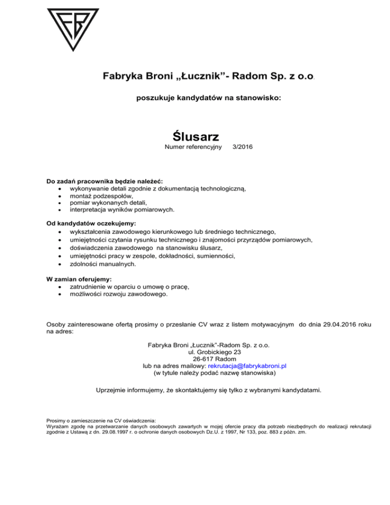 Fabryka Broni „Łucznik”- Radom Sp. z o.o. poszukuje kandydatów na stanowisko: Ślusarz Numer referencyjny 3/2016 Do zadań pracownika będzie należeć: wykonywanie detali zgodnie z dokumentacją technologiczną, montaż podzespołów, pomiar wykonanych detali, interpretacja wyników pomiarowych. Od kandydatów oczekujemy: wykształcenia zawodowego kierunkowego lub średniego technicznego, umiejętności czytania rysunku technicznego i znajomości przyrządów pomiarowych, doświadczenia zawodowego na stanowisku ślusarz, umiejętności pracy w zespole, dokładności, sumienności, zdolności manualnych. W zamian oferujemy: zatrudnienie w oparciu o umowę o pracę, możliwości rozwoju zawodowego. Osoby zainteresowane ofertą prosimy o przesłanie CV wraz z listem motywacyjnym do dnia 29.04.2016 roku na adres: Fabryka Broni „Łucznik”-Radom Sp. z o.o. ul. Grobickiego 23 26-617 Radom lub na adres mailowy: [email protected] (w tytule należy podać nazwę stanowiska) Uprzejmie informujemy, że skontaktujemy się tylko z wybranymi kandydatami. Prosimy o zamieszczenie na CV oświadczenia: Wyrażam zgodę na przetwarzanie danych osobowych zawartych w mojej ofercie pracy dla potrzeb niezbędnych do realizacji rekrutacji zgodnie z Ustawą z dn. 29.08.1997 r. o ochronie danych osobowych Dz.U. z 1997, Nr 133, poz. 883 z późn. zm.