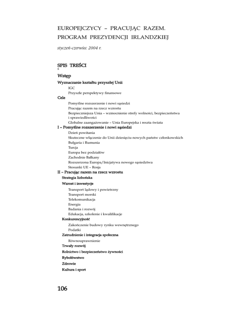 EUROPEJCZYCY – PRACUJĄC RAZEM. PROGRAM PREZYDENCJI IRLANDZKIEJ styczeń-czerwiec 2004 r. SPIS TREŚCI s Wstęp Wyznaczanie kształtu przyszłej Unii IGC Przyszłe perspektywy finansowe Cele Pomyślne rozszerzenie i nowi sąsiedzi Pracując razem na rzecz wzrostu Bezpieczniejsza Unia – wzmocnienie strefy wolności, bezpieczeństwa i sprawiedliwości Globalne zaangażowanie – Unia Europejska i reszta świata I – Pomyślne rozszerzenie i nowi sąsiedzi Dzień powitania Skuteczne włączenie do Unii dziesięciu nowych państw członkowskich Bułgaria i Rumunia Turcja Europa bez podziałów Zachodnie Bałkany Rozszerzona Europa/Inicjatywa nowego sąsiedztwa Stosunki UE – Rosja II – Pracując razem na rzecz wzrostu Strategia lizbońska Wzrost i inwestycje Transport lądowy i powietrzny Transport morski Telekomunikacja Energia Badania i rozwój Edukacja, szkolenie i kwalifikacje Konkurencyjność Zakończenie budowy rynku wewnętrznego Podatki Zatrudnienie i integracja społeczna Równouprawnienie Trwały rozwój Rolnictwo i bezpieczeństwo żywności Rybołówstwo Zdrowie Kultura i sport 106 Imigracja i azyl Azyl Imigracja Granice zewnętrzne i wizy Współpraca policyjna w sprawach karnych Przestępczość zorganizowana Narkotyki Współpraca celna Współpraca sądowa w sprawach karnych i cywilnych Prawo karne Prawo cywilne Schengen Ochrona cywilna Stosunki z państwami trzecimi IV – Globalne zaangażowanie – Unia Europejska i reszta świata Podstawowe kierunki działań Prezydencji irlandzkiej w zakresie stosunków zewnętrznych Organizacja Narodów Zjednoczonych Nierozprzestrzenianie broni masowej zagłady i rozbrojenie Zapobieganie konfliktom Stosunki transatlantyckie Afryka Bliski Wschód Prawa człowieka Azja Ameryka Łacińska i Karaiby Iran Irak Walka ze światowym terroryzmem Europejska Polityka Bezpieczeństwa i Obrony Wielostronna polityka handlowa Rozwój Europejczycy – pracując razem Prezydencja irlandzka, przypadająca na pierwszą połowę 2004 r., to czas nadziei i wyzwań dla Unii Europejskiej. 1 maja 2004 r. dziesięć nowych państw przystąpi do Unii. Prezydencja irlandzka zobowiązuje się sprawić, że dobra wola i oczekiwania wywołane historycznym zakończeniem powojennego podziału Europy zostaną spożytkowane w interesie mieszkańców Europy i świata. Pracując razem, Europejczycy mogą zostawić za sobą przeszłe podziały i zbudować lepszą Europę dla wszystkich. 107 Unia Europejska MONITOR INTEGRACJI EUROPEJSKIEJ • URZĄD KOMITETU INTEGRACJI EUROPEJSKIEJ III – Bezpieczniejsza Unia: wzmocnienie przestrzeni wolności, sprawiedliwości i bezpieczeństwa W kontekście rozszerzenia i zmian na scenie globalnej Unia musi się stać bardziej skuteczna i lepiej przygotowana do spełniania oczekiwań swoich obywateli i wspólnoty międzynarodowej. Prezydencja irlandzka uczyni wszystko, co w jej mocy, by posunąć naprzód prace nad nowym traktatem konstytucyjnym. Prezydencja irlandzka będzie działać na rzecz trwałego wzrostu gospodarczego i zatrudnienia w rozszerzonej Europie. Skupi się na kształtowaniu takiej polityki, która może przynieść bezpieczeństwo i wysoką jakość życia mieszkańcom Europy. Zapewni aktywne zaangażowanie UE wraz z resztą świata w agendę międzynarodową, w zgodzie ze swymi wartościami i zasadami. Irlandia zobowiązuje się wywiązywać z obowiązków wynikających z jej prezydencji w sposób skuteczny, sprawiedliwy i zrównoważony, w interesie Unii Europejskiej jako całości. Jednym z wyzwań, przed którymi stoi dzisiaj Unia Europejska, to zapewnienie pełnej informacji oraz zaangażowania obywateli w wydarzenia, które mają wpływ — w rozmaitym zakresie – na ich codzienne życie. Prezydencja irlandzka podejmie działania sprzyjające bliższym relacjom między instytucjami Unii Europejskiej i jej obywatelami. Jej działania będą przejrzyste, a informacje będą dostępne na stronie internetowej www.eu2004.ie Będzie to pierwsza prezydencja, podczas której zostaną w pełni wdrożone wnioski Rady Europejskiej z Sewilli w sprawie programowania działań Rady, co przyczyni się do zapewnienia spójnego i strategicznego podejścia w pracach Rady. Program Prezydencji irlandzkiej jest w pełni zgodny z Wieloletnim Programem Strategicznym Rady na lata 2004-2006 i programem operacyjnym Rady na rok 2004, który został przygotowany wspólnie przez Prezydencje irlandzką i holenderską. Realizując program, Prezydencja będzie ściśle współpracować z Parlamentem Europejskim i Komisją Europejską. Wyznaczanie kształtu przyszłej Unii IGC Od momentu swej inauguracji w październiku 2003 r. Konferencja Międzyrządowa, przyjmując za punkt wyjścia nadzwyczajną pracę wykonaną przez Konwent Europejski, osiągnęła istotny postęp na drodze wiodącej do porozumienia w sprawie nowego traktatu konstytucyjnego, który zapewni Unii większą skuteczności oraz lepsze przygotowanie do spełniania oczekiwań jej mieszkańców i potrzeb wynikających ze zmieniającej się, złożonej sytuacji międzynarodowej. Istnieje szerokie porozumienie w zdecydowanej większości kwestii. Niemniej dużo jest jeszcze dziedzin, w których różnice zdań wciąż istnieją. 108 Uzgodnienia finansowe i budżetowe, stanowiące podstawę Unii, mają zasadnicze znaczenie nie tylko dla Unii, lecz również dla jej obywateli. Uzgodnione perspektywy finansowe odzwierciedlają priorytety i cele Unii rozłożone na dłuższy czas i określają środki Unii, dzięki którym może ona sprostać wyzwaniom. Prezydencja irlandzka zainicjuje dyskusję w Radzie na temat przyszłego finansowania Unii począwszy od 2007 r., po otrzymaniu informacji Komisji, która jest spodziewana na początku 2004 r. Debaty na forum Rady posłużą do przygotowania, a następnie przedstawienia przez Komisję całościowych propozycji finansowych i legislacyjnych. Cele Prezydencja irlandzka skupi się na następujących celach priorytetowych. Pomyślne