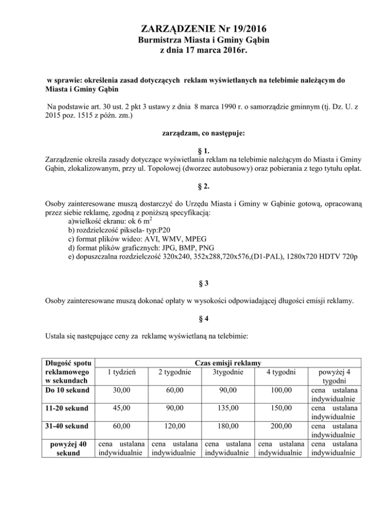 ZARZĄDZENIE Nr 19/2016 Burmistrza Miasta i Gminy Gąbin z dnia 17 marca 2016r. w sprawie: określenia zasad dotyczących reklam wyświetlanych na telebimie należącym do Miasta i Gminy Gąbin Na podstawie art. 30 ust. 2 pkt 3 ustawy z dnia 8 marca 1990 r. o samorządzie gminnym (tj. Dz. U. z 2015 poz. 1515 z późn. zm.) zarządzam, co następuje: § 1. Zarządzenie określa zasady dotyczące wyświetlania reklam na telebimie należącym do Miasta i Gminy Gąbin, zlokalizowanym, przy ul. Topolowej (dworzec autobusowy) oraz pobierania z tego tytułu opłat. § 2. Osoby zainteresowane muszą dostarczyć do Urzędu Miasta i Gminy w Gąbinie gotową, opracowaną przez siebie reklamę, zgodną z poniższą specyfikacją: a)wielkość ekranu: ok 6 m2 b) rozdzielczość piksela- typ:P20 c) format plików wideo: AVI, WMV, MPEG d) format plików graficznych: JPG, BMP, PNG e) dopuszczalna rozdzielczość 320x240, 352x288,720x576,(D1-PAL), 1280x720 HDTV 720p §3 Osoby zainteresowane muszą dokonać opłaty w wysokości odpowiadającej długości emisji reklamy. §4 Ustala się następujące ceny za reklamę wyświetlaną na telebimie: Długość spotu reklamowego w sekundach Do 10 sekund 11-20 sekund 31-40 sekund powyżej 40 sekund 1 tydzień Czas emisji reklamy 2 tygodnie 3tygodnie 4 tygodni powyżej 4 tygodni 30,00 60,00 90,00 100,00 cena ustalana indywidualnie 45,00 90,00 135,00 150,00 cena ustalana indywidualnie 60,00 120,00 180,00 200,00 cena ustalana indywidualnie cena ustalana cena ustalana cena ustalana cena ustalana cena ustalana indywidualnie indywidualnie indywidualnie indywidualnie indywidualnie § 5. Dodatkowe ustalenia: -właściciel reklamy odpowiada za treść wyświetlanej reklamy -zarządca zastrzega sobie prawo do nie przyjęcia reklamy bez podania jakichkolwiek przyczyn . §6 Zarządzenie wchodzi w życie z dniem podpisania.