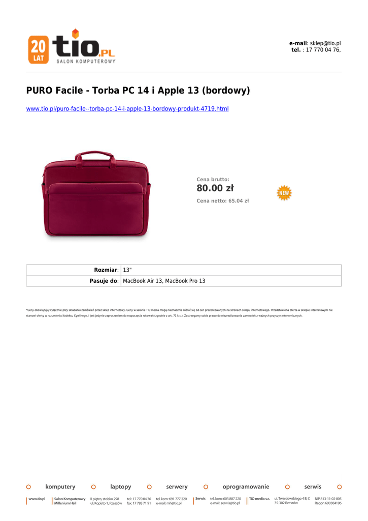 e-mail: [email protected] tel. : 17 770 04 76, PURO Facile - Torba PC 14 i Apple 13 (bordowy) www.tio.pl/puro-facile--torba-pc-14-i-apple-13-bordowy-produkt-4719.html Cena brutto: 80.00 zł Cena netto: 65.04 zł Rozmiar: 13" Pasuje do: MacBook Air 13, MacBook Pro 13 *Ceny obowiązują wyłącznie przy składaniu zamówień przez sklep internetowy. Ceny w salonie TiO media mogą nieznacznie różnić się od cen prezentowanych na stronach sklepu internetowego. Przedstawiona oferta w sklepie internetowym nie stanowi oferty w rozumieniu Kodeksu Cywilnego, i jest jedynie zaproszeniem do rozpoczęcia rokowań (zgodnie z art. 71 k.c.). Zastrzegamy sobie prawo do niezrealizowania zamówień z ważnych przyczyn ekonomicznych.
