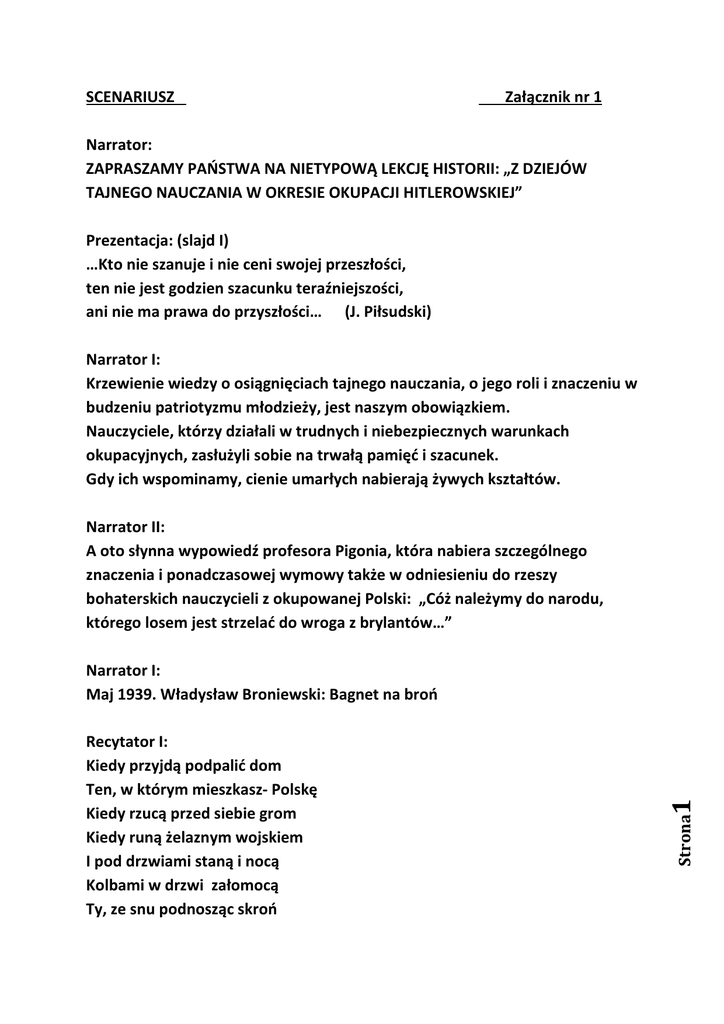 SCENARIUSZ Załącznik nr 1 Narrator: ZAPRASZAMY PAŃSTWA NA NIETYPOWĄ LEKCJĘ HISTORII: „Z DZIEJÓW TAJNEGO NAUCZANIA W OKRESIE OKUPACJI HITLEROWSKIEJ” Prezentacja: (slajd I) …Kto nie szanuje i nie ceni swojej przeszłości, ten nie jest godzien szacunku teraźniejszości, ani nie ma prawa do przyszłości… (J. Piłsudski) Narrator I: Krzewienie wiedzy o osiągnięciach tajnego nauczania, o jego roli i znaczeniu w budzeniu patriotyzmu młodzieży, jest naszym obowiązkiem. Nauczyciele, którzy działali w trudnych i niebezpiecznych warunkach okupacyjnych, zasłużyli sobie na trwałą pamięć i szacunek. Gdy ich wspominamy, cienie umarłych nabierają żywych kształtów. Narrator II: A oto słynna wypowiedź profesora Pigonia, która nabiera szczególnego znaczenia i ponadczasowej wymowy także w odniesieniu do rzeszy bohaterskich nauczycieli z okupowanej Polski: „Cóż należymy do narodu, którego losem jest strzelać do wroga z brylantów…” Recytator I: Kiedy przyjdą podpalić dom Ten, w którym mieszkasz- Polskę Kiedy rzucą przed siebie grom Kiedy runą żelaznym wojskiem I pod drzwiami staną i nocą Kolbami w drzwi załomocą Ty, ze snu podnosząc skroń Strona1 Narrator I: Maj 1939. Władysław Broniewski: Bagnet na broń Stań u drzwi… Narrator II: Wrzesień 1939. Krzysztof Kamil Baczyński: Z głową na karabinie Recytator II: Nocą słyszę , jak coraz bliżej drżąc i grając krąg się zaciska (Wycie syren, dalekie odgłosy bomb- prezentacja multimedialna) Krąg jak nożem z wolna rozcina przetnie światło, zanim dzień minie, a ja prześpię czas wielkiej rzeźby z głową ciężką na karabinie… Prezentacja: Filmik -Wojna obronna Polski Recytator I: Lecz zaklinam, niech żywi nie tracą nadziei. I przed narodem niosą oświaty kaganiec A kiedy trzeba, na śmierć idą po kolei, jak kamienie przez Boga rzucane na szaniec… Prezentacja- Krzyk duszy, L. Makowiecki Strona2 Narrator I: K. K. Baczyński należał do pokolenia Kolumbów. Poeta ten był uczestnikiem tajnych kompletów, zginął w czwartym dniu Powstania Warszawskiego, mając 23 lata. W walce z okupantem ginęła wspaniała młodzież, wśród której były jednostki wybitne, obdarzone talentem, inteligencją, pasją odkrywania świata. Z rąk hitlerowców poniosło śmierć bardzo wielu nauczycieli, ludzi odważnych, szlachetnych, bez reszty oddanych ojczyźnie i swojemu pedagogicznemu powołaniu. Narrator II: Restrykcje oświatowe narzucone Polakom przez okupanta: Dozwolone organizowanie tylko szkolnictwa powszechnego Nauka ważnych z narodowego punktu widzenia przedmiotów (geografia, historia, historia literatury, śpiew, gimnastyka- zostały przez okupanta surowo zabronione.) Likwidacja szkół średnich- z wyjątkiem szkół zawodowych Likwidacja wyższych uczelni Narrator: I Rozkaz Hansa Franka Generalnego Gubernatora: „Polakom należy pozostawić tylko takie możliwości kształcenia, które okażą im beznadziejność ich położenia narodowego”. „Żaden Polak nie uzyska więcej aniżeli rangę majstra”. Narrator II: Eksterminacyjna polityka Hitlera wobec narodu polskiego polegała na: - walce z polskością - niszczeniu inteligencji - niszczeniu dóbr kultury - aresztowaniach Polaków - tworzeniu obozów zagłady W województwie lubelskim straty wśród nauczycieli wynosiły 1320 osób w tym 769 zostało rozstrzelanych, 550 zginęło w niewyjaśnionych okolicznościach. Ponad 250 nauczycieli straciło życie na Zamku, Majdanku, Bełżcu, Sobiborze, Rotundzie Zamojskiej. Strona3 Narrator I: Rozkaz Heinricha Himmlera: „Szkoły dla polskich dzieci powinny uczyć przede wszystkim prostego liczenia do 500, napisania własnego nazwiska oraz wiedzy, iż boskim przykazaniem jest być posłusznym Niemcom. Czytania nie uważam za konieczne…” Chór: Biały krzyż(w wykonaniu uczniów Gimnazjum im. Jana Pawła II w Żyrzynie) Narrator I: W odpowiedzi na hitlerowski terror dotyczący oświaty w październiku 1939 roku powołano Tajną Organizację Nauczycielską (TON). Jej założycielami byli: Czesław Wycech, Zygmunt Nowicki, Kazimierz Maj, Wacław Tułodziecki i Teofil Wojeński. Prezentacja: Zdjęcia założycieli TON Głównym zadaniem TON była koordynacja nauczania w warunkach konspiracyjnych (wytyczenie podstawowych kierunków działania, podział kompetencji, rozbudowa różnych systemów tajnego nauczania, opracowanie instrukcji dydaktycznych oraz współpraca z AK i BCH, kontakty centrali z terenem). Narrator II: Liczba uczestników jednego „kompletu” zazwyczaj wynosiła 5-6 osób (choć bywały także większe grupy), liczbę godzin nauki danego przedmiotu zredukowano do połowy czasu obowiązującego przed wojną, a lekcje były dwugodzinne, w miarę możliwości prowadzone według programu przedwojennego. Ze względu na brak podręczników i podstawowych pomocy dydaktycznych zasadniczą metodą pracy był wykład nauczyciela i notatki robione przez uczniów. Strona4 Narrator: Organizacja ta zajmowała się także opieką nad nauczycielami przesiedlonymi z terenów polskich włączonych do Rzeszy i nad rodzinami nauczycieli poległych i zaginionych podczas kampanii wrześniowej 1939 roku, zamordowanych i aresztowanych przez Niemców w późniejszym okresie . TON starała się również o zapewnienie bezpieczeństwa nauczycielom poszukiwanym przez władze okupacyjne. Początkowo Tajna Organizacja Nauczycielska objęła swą pieczą szkolnictwo powszechne i gimnazjalne, by w następnej kolejności rozpocząć nauczanie na poziomie szkoły średniej oraz na poziomie uniwersyteckim. Scenka Tajne nauczanie: w wykonaniu uczniów gimnazjum Recytator: Ojczyzna moja- to te ciche pola, Które od wieków zdeptała niewola, To te kurhany, te smętne mogiłyCo je swobody Obrońców przykryły Ojczyzna moja- to ten duch narodu Co żyje cudem wśród głodu i chłodu, To ta nadzieja, co się w sercach kwieci, Pracą u ojców, a piosnką u dzieci! Fragmenty piosenek: Piosenka 