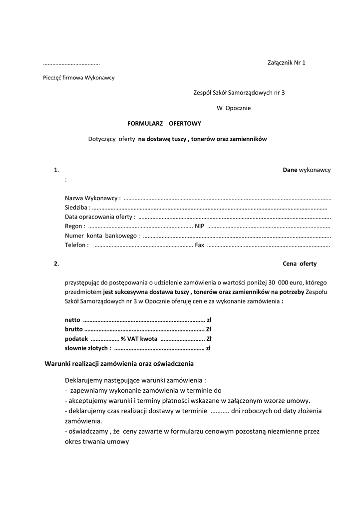………………………………. Załącznik Nr 1 Pieczęd firmowa Wykonawcy Zespół Szkół Samorządowych nr 3 W Opocznie FORMULARZ OFERTOWY Dotyczący oferty na dostawę tuszy , tonerów oraz zamienników 1. Dane wykonawcy : Nazwa Wykonawcy : ……………………………………………………………………………………………………………………… Siedziba : ……………………………………………………………………………………………………………………………………… Data opracowania oferty : …………………………………………………………………………………………………………….. Regon : ………………………………………………………….. NIP …………………………………………………………………….. Numer konta bankowego : ………………………………………………………………………………………………………….. Telefon : ………………………………………………………. Fax …………………………………………………………………….. 2. Cena oferty przystępując do postępowania o udzielenie zamówienia o wartości poniżej 30 000 euro, którego przedmiotem jest sukcesywna dostawa tuszy , tonerów oraz zamienników na potrzeby Zespołu Szkół Samorządowych nr 3 w Opocznie oferuję cen e za wykonanie zamówienia : netto ………………………………………………………………….. zł brutto …………………………………………………………………. Zł podatek ……………… % VAT kwota ………………………. Zł słownie złotych : ………………………………………………… zł Warunki realizacji zamówienia oraz oświadczenia Deklarujemy następujące warunki zamówienia : - zapewniamy wykonanie zamówienia w terminie do - akceptujemy warunki i terminy płatności wskazane w załączonym wzorze umowy. - deklarujemy czas realizacji dostawy w terminie ……….. dni roboczych od daty złożenia zamówienia. - oświadczamy , że ceny zawarte w formularzu cenowym pozostaną niezmienne przez okres trwania umowy ………………………………… , dnia ……………….. 2016 ………………………….. …………………………………………….. Pieczęd firmowa wykonawcy Zespół Szkół Samorządowych nr 3 W Opocznie FORMULARZ OFERTOWY 1. Dane wykonawcy Nazwa wykonawcy : ………………………………………………………………………………………………………………… Siedziba: …………………….. …………………………………………………………………………………………………………… Data opracowania oferty …………………………………………………………………………………………………………… Regon: ……………………………………………………………… NIP ………………………………………………………………… Numer konta bankowego: …………………………………………………………………………………………………………. Telefon: ……………………………………………………………..FAX ……………………………………………………………….. 2. Cena oferty Przystępując do postępowania o udzielenie zamówienia o wartości poniżej 30.000 euro, którego przedmiotem jest sukcesywna dostawa tonerów , tuszy, oraz zamienników dla Zespołu Szkół Samorządowych nr 3 w Opocznie oferuję cenę za wykonanie zamówienia: Netto …………………………………………………………………………………………. zł Podatek…………………………..% VAT kwota …………………………………… zł Brutto …………………………………………………………………………………………. zł Słownie złotych ………………………………………………………………………………………………………………………….. 3. Warunki realizacji zamówienia oraz oświadczenia Deklarujemy następujące warunki realizacji zamówienia : - zapewniamy wykonanie zamówienia w terminie do …………………………………… - akceptujemy warunki i terminy płatności wskazane w załączonym wzorze umowy - deklarujemy czas realizacji w terminie …………………. Dni roboczych od daty złożenia Zamówienia
