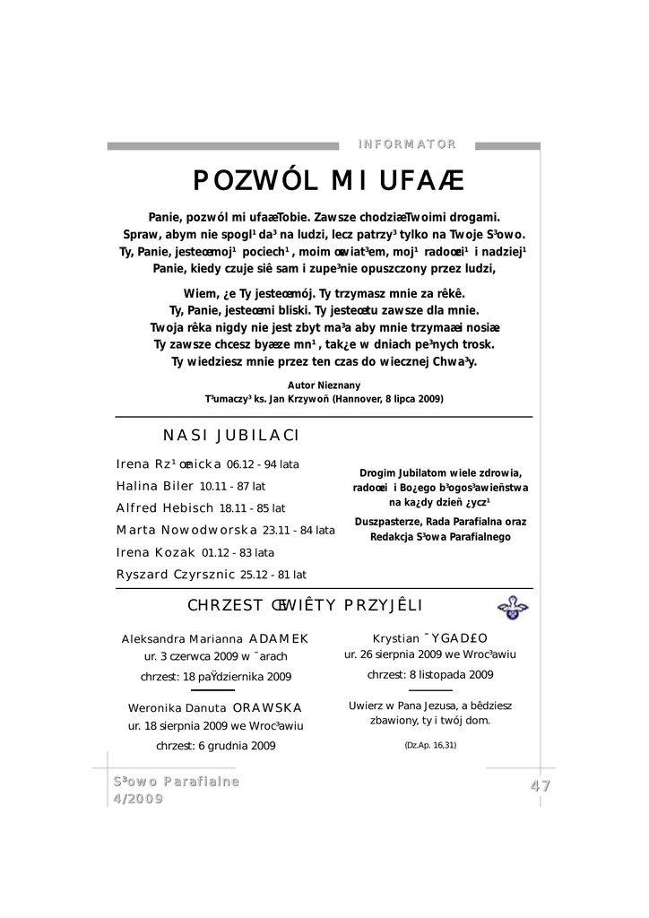 I N F O R M AT O R POZWÓL MI UFAÆ Panie, pozwól mi ufaæ Tobie. Zawsze chodziæ Twoimi drogami. Spraw, abym nie spogl¹da³ na ludzi, lecz patrzy³ tylko na Twoje S³owo. Ty, Panie, jesteœ moj¹ pociech¹, moim œwiat³em, moj¹ radoœci¹ i nadziej¹ Panie, kiedy czuje siê sam i zupe³nie opuszczony przez ludzi, Wiem, ¿e Ty jesteœ mój. Ty trzymasz mnie za rêkê. Ty, Panie, jesteœ mi bliski. Ty jesteœ tu zawsze dla mnie. Twoja rêka nigdy nie jest zbyt ma³a aby mnie trzymaæ i nosiæ. Ty zawsze chcesz byæ ze mn¹, tak¿e w dniach pe³nych trosk. Ty wiedziesz mnie przez ten czas do wiecznej Chwa³y. Autor Nieznany T³umaczy³ ks. Jan Krzywoñ (Hannover, 8 lipca 2009) NASI JUBILACI Irena Rz¹œnicka 06.12 - 94 lata Halina Biler 10.11 - 87 lat Alfred Hebisch 18.11 - 85 lat Marta Nowodworska 23.11 - 84 lata Drogim Jubilatom wiele zdrowia, radoœci i Bo¿ego b³ogos³awieñstwa na ka¿dy dzieñ ¿ycz¹ Duszpasterze, Rada Parafialna oraz Redakcja S³owa Parafialnego Irena Kozak 01.12 - 83 lata Ryszard Czyrsznic 25.12 - 81 lat CHRZEST ŒWIÊTY PRZYJÊLI ur. 3 czerwca 2009 w ¯arach Krystian ¯YGAD£O ur. 26 sierpnia 2009 we Wroc³awiu chrzest: 18 paŸdziernika 2009 chrzest: 8 listopada 2009 Weronika Danuta ORAWSKA Uwierz w Pana Jezusa, a bêdziesz zbawiony, ty i twój dom. Aleksandra Marianna ADAMEK ur. 18 sierpnia 2009 we Wroc³awiu chrzest: 6 grudnia 2009 S³owo Parafialne 4/2009 (Dz.Ap. 16,31) 47 N A R O D Z E N I E PA Ñ S K I E 2 0 0 9 Z ¯ A£OBNEJ K ARTY ŒP. Jerzy ŒP. Urszula GOLAŒ GMYZ ur. 25 lutego 1933 w Kaletach ur. 17 czerwca 1943 w Szczyrku zm. 23 paŸdziernika 2009 we Wroc³awiu zm. 23 paŸdziernika 2009 w Warszawie ŒP. Rita ŒWITALSKA-K KRAUSE ur. 18 lutego 1922 w Bydgoszczy zm. 29 listopada 2009 we Wroc³awiu Niechaj siê nie trwo¿y serce wasze; wierzcie w Boga i we mnie wierzcie! W domu Ojca mego wiele jest mieszkañ; gdyby by³o inaczej, by³bym wam powiedzia³. Idê przygotowaæ wam miejsce. (Jan 14, 1-2) S£OWO PARAFIALNE Parafii Ewangelicko-Augsburskiej we Wroc³awiu, ul. Kazimierza Wielkiego 29, 50-077 Wroc³aw tel.: (+71) 34 34 730, fax: (+71) 37 23 748 e-mail: [email protected] Redaktor: Marcin Orawski Redakcja techniczna i sk³ad: Marcin Orawski K¹cik dla Dzieci: Iwona Orawska Projekt i sk³ad ok³adki: Grzegorz Mieczkowski Korekta: Danuta Triska 48 S³owo Parafialne 4/2009