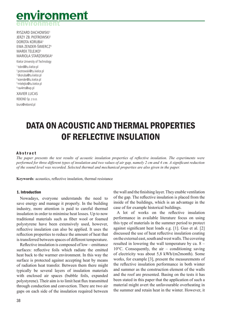 RYSZARD DACHOWSKI1 JERZY ZB. PIOTROWSKI2 DOROTA KORUBA3 EWA ZENDER-ŚWIERCZ4 MAREK TELEJKO5 MARIOLA STARZOMSKA6 Kielce University of Technology [email protected] [email protected] 3 [email protected] 4 [email protected] 5 [email protected] 6 [email protected] 1 2 XAVIER LUCAS REBOND Sp. z o.o. [email protected] DATA ON ACOUSTIC AND THERMAL PROPERTIES OF REFLECTIVE INSULATION Abstract The paper presents the test results of acoustic insulation properties of reflective insulation. The experiments were performed for three different types of insulation and two values of air gap, namely 2 cm and 4 cm. A significant reduction of the sound level was recorded. Selected thermal and mechanical properties are also given in the paper. Keywords: acoustics, reflective insulation, thermal resistance 1. Introduction Nowadays, everyone understands the need to save energy and manage it properly. In the building industry, more attention is paid to careful thermal insulation in order to minimise heat losses. Up to now traditional materials such as fiber wool or foamed polystyrene have been extensively used, however, reflective insulation can also be applied. It uses the reflection properties to reduce the amount of heat that is transferred between spaces of different temperature. Reflective insulation is composed of low – emittance surfaces: reflective foils which radiate the emitted heat back to the warmer environment. In this way the surface is protected against accepting heat by means of radiation heat transfer. Between them there might typically be several layers of insulation materials with enclosed air spaces (bubble foils, expanded polystyrene). Their aim is to limit heat flux transmitted through conduction and convection. There are two air gaps on each side of the insulation required between 38 the wall and the finishing layer. They enable ventilation of the gap. The reflective insulation is placed from the inside of the buildings, which is an advantage in the case of for example historical buildings. A lot of works on the reflective insulation performance in available literature focus on using this type of materials in the summer period to protect against significant heat loads e.g. [1]. Guo et al. [2] discussed the use of heat reflective insulation coating on the external east, south and west walls. The covering resulted in lowering the wall temperature by ca. 8 – 10°C. Consequently, the air – conditioning saving of electricity was about 5,8 kWh/(m2month). Some works, for example [3], present the measurements of the reflective insulation performance in both winter and summer as the construction element of the walls and the roof are presented. Basing on the tests it has been stated in this paper that the application of such a material might avert the unfavourable overheating in the summer and retain heat in the winter. However, it DATA ON ACOUSTIC AND THERMAL PROPERTIES OF REFLECTIVE INSULATION needs to be noted that there are discrepancies between results presented by different research institutes regarding reflective insulation. This has been pointed out by Tenpierik and Hasselaar [4]. That is the reason why tests in this field are needed. They can be efficiently done in climatic chambers. These devices are more and more common and tests are conducted on different materials, as in [5]. 2. Tests of acoustic insulation Three different samples of reflective insulation were tested. Sample 1 consisted of 2 layers of reinforced metalised polyester foil, 2 layers of polyester fiber insulation, 2 reflective layers and 1 polyester foam layer. Sample 2 had 2 layers of reinforced metalised polyester foil, 2 layers of polyester fiber insulation, 6 reflective layers and 5 polyester foam layers. While sample 3 composed of 2 layers of reinforced metalised polyester foil, 4 layers of polyester fiber insulation, 6 reflective layers and 5 polyester foam layers. The tests were conducted for two values of air gap between the tested material and the gypsum boards, namely 2 cm and 4 cm. The tests were performed on the experimental stand presented below (Fig. 1, 2), which is the acoustic tunnel. It has been patented [6]. Fig. 1. The acoustic tunnel and its elements. chamber (11). They are both sealed (4). The inside insulation is fiber wool (3). There are a sound level meter (6) and a sound generator (5) installed in the tunnel. The generator provides sound for comparison with the sound generated in the sending chamber. The sample has been sealed with foam acoustic insulation (7). Figures 3 – 5 present the pictures of the tunnel. Fig. 3. Inside of the acoustic tunnel with sound generator. Fig. 4. Inside of the acoustic tunnel with sound level meter. Fig. 2. Cross – section of the tunnel (1-1). The tunnel is rectangular and divided with the investigated element 1. On the left there is the receiving chamber (10) and on the right – the sending Fig. 5. Outsider view of the acoustic tunnel. 39 R. Dachowski, J. Zb. Piotrowski, D. Koruba, E.Zender-Świercz, M. Telejko, M. Starzomska The sound level meter SON-50 was used for the tests together with sound generator Z-10. The mean value of frequency was in the range of 20 – 20000 Hz. The investigated element is placed in the tunnel. Before it the source of the sound is located, which generates sound of high frequency and its intensity is measured at the end of the chamber. Afterwards, in the sending chamber (behind the analysed element) the sound is generated of identical intensity as before in the receiving chamber and measures are taken in the receiving chamber. A difference in values describes the acoustic insulation of the investigated element. The detailed experimental data are given in Table 1. Tab. 1. Experimental results. Air gap [cm] Sample Sample 1 Sample 2 Sample 3 Sound level in the Sound level in the receiving chamber empty tunnel [dB] [dB] Sound level reduction [dB] 70.9 106.8 35.9 References: 2x4 73.2 106.8 33.6 2x2 68.8 106.8 38.0 2x4 70.6 106.8 36.
