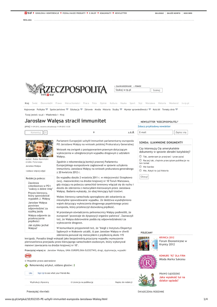 SZKOLENIA I KONFERENCJE POZNAJ NASZE PRODUKTY E-SKLEP KOMUNIKATY NEW SLETTER ZA LO GUJ ZA ŁÓ Ż KO NT O KO D SM S REKLAMA + ZAAW ANSOW ANE + POMOC Szukaj w rp.pl Kraj Świat Ekonomia24 Najnowsze Polityka Prawo Nieruchomości Społeczeństwo Edukacja Praca Foto Opinie Kultura Zdrowie M edia Historia Służby Nauka Sport Szukaj Styl Warszawa Wymiar sprawiedliwości Historia Weekend tv.rp.pl Kościół Tematy dnia Tutaj jesteś: rp.pl » Wiadomości » Kraj Jarosław Wałęsa stracił immunitet NEWSLETTER "RZECZPOSPOLITEJ" pmaj 11-09-2012, ostatnia aktualizacja 11-09-2012 13:30 Komentuj Zobacz przykładowy newsletter 0 AAA 0 Parlament Europejski uchylił immunitet parlamentarny europosła PO Jarosława Wałęsy na wniosek polskiej Prokuratury Generalnej autor: Kuba Kamiński źródło: Fotorzepa Jarosław Wałęsa +zobacz więcej zdjęć Redakcja poleca: Zawiesza członkostwo w PO i "walczy o dobre imię" Proces kierowcy, który spowodował wypadek J. Wałęsy Jarosław Wałęsa powinien odpowiedzieć za szybką jazdę Wałęsa odpowie za przekroczenie prędkości Jak szybko jechał Wałęsa? Wniosek ma związek z postępowaniem prawnym dotyczącym wykroczenia w ubiegłorocznym wypadku drogowym z udziałem Wałęsy. Zgodnie z rekomendacją komisji prawnej Parlamentu Europejskiego europosłowie zagłosowali w sprawie uchylenia immunitetu Jarosława Wałęsy na wniosek prokuratora generalnego z 20 kwietnia 2012 r. Do wypadku doszło 2 września 2011 r. w miejscowości Stropkowo (woj. mazowieckie) na drodze krajowej nr 10 Toruń-Warszawa, gdy stojący na poboczu samochód terenowy włączał się do ruchu i doszło do zderzenia z motocyklem kierowanym przez Jarosława Wałęsę. Badania wykazały, że obaj kierujący byli trzeźwi. E-mail Zapisz się SONDA: UJAWNIONE DOKUMENTY Czy interesują Cię amerykańskie dokumenty w sprawie zbrodni katyńskiej? Tak, zamierzam je przejrzeć i przeczytać Raczej tak, chętnie przeczytam publikacje na ten temat Nie bardzo Nie, Katyń to już historia Głosuj! Wobec kierowcy samochodu sporządzono akt oskarżenia za nieumyślne spowodowanie wypadku. Ze śledztwa wyodrębniono wątek dotyczący wykroczenia drogowego popełnionego przez europosła, który przekroczył dozwoloną prędkość. W przesłanym oświadczeniu pełnomocnicy Wałęsy podkreślili, że europoseł "pozostaje do dyspozycji organów państwa". Zaznaczyli też, że Wałęsa dobrowolnie podda się odpowiedzialności za wykroczenie drogowe. W komunikacie przypomnieli też, że "biegli z Instytutu Ekspertyz Sądowych w Krakowie ustalili, iż pan Jarosław Wałęsa w chwili zderzenia poruszał się motocyklem z prędkością około 115 km/godz. Ponadto biegli wskazali jako bezpośrednią przyczynę wypadku wymuszenie pierwszeństwa przejazdu przez kierującego samochodem osobowym, który wykonywał manewr zawracania na drodze krajowej nr 10". POLECAMY KRYNICA 2012 Forum Ekonomiczne w Krynicy 2012 Przeczytaj więcej o: Jarosław Wałęsa, UNIA EUROPEJSKA-ŚLEDZTWO, drogi, dyplomacja, wypadki KONKURS "RZ" DLA FIRM Młoda Marka Sukcesu © Wszystkie prawa zastrzeżone Rekomenduj artykuł, oddano głosów: 2 Like Sign Up to see what your friends like. Wydrukuj z Kyocerą PRAWO SĄSIEDZKIE © Licencja na publikację Przeczytaj również: www.rp.pl/artykul/10,932335-PE-uchylil-immunitet-europosla-Jaroslawa-Walesy.html Napisz do redakcji Jaka wysokość tui na działce sąsiada? ŚWIADCZENIA RODZINNE 1/4