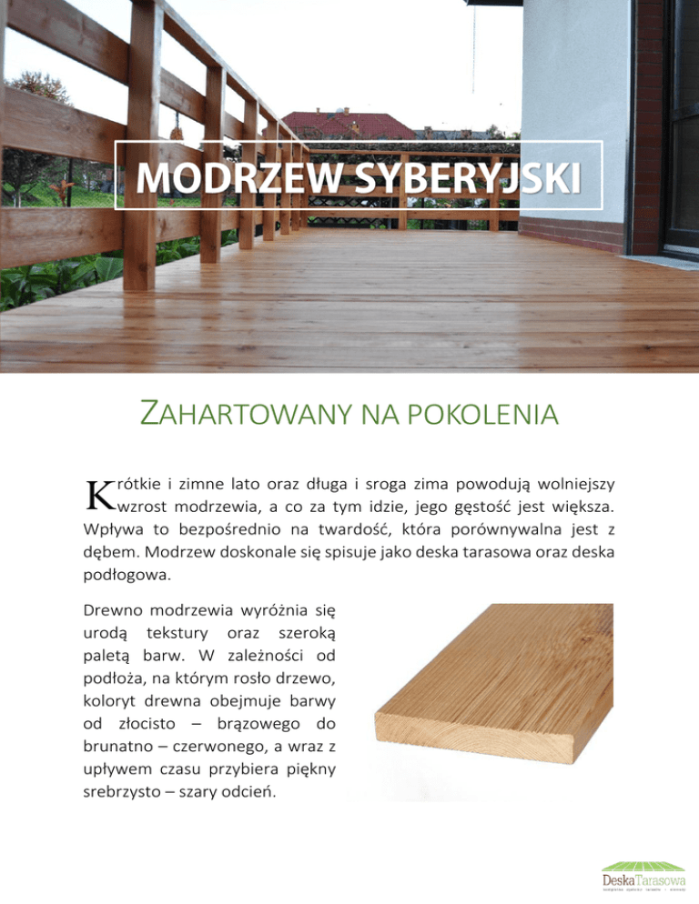 ZAHARTOWANY NA POKOLENIA K rótkie i zimne lato oraz długa i sroga zima powodują wolniejszy wzrost modrzewia, a co za tym idzie, jego gęstość jest większa. Wpływa to bezpośrednio na twardość, która porównywalna jest z dębem. Modrzew doskonale się spisuje jako deska tarasowa oraz deska podłogowa. Drewno modrzewia wyróżnia się urodą tekstury oraz szeroką paletą barw. W zależności od podłoża, na którym rosło drzewo, koloryt drewna obejmuje barwy od złocisto – brązowego do brunatno – czerwonego, a wraz z upływem czasu przybiera piękny srebrzysto – szary odcień. DESKI TARASOWE WYMIAR JAKOŚĆ PAKOWANIE ILOŚĆ SZT./PAL 24X140MM A/B 4 140 24X140MM C 4 140 28X140MM A/B 4 112 28X140MM C 4 112 34X140MM A/B 3 105 34X140MM C 3 105 42X140MM A/B 3 105 42X140MM C 3 105 ŁATY, KANTÓWKI WYMIAR JAKOŚĆ PAKOWANIE ILOŚĆ SZT./PAL 45x70mm A/B 4 192 PROFILE 24X140 mm 28x140 mm, 34x140 mm WWW.DESKATARASOWA.COM 40x140 mm CHARAKTERYSTYKA MODRZEW SYBERYJSKI A DĄB – PORÓWNANIE Modrzew Syberyjski Dąb Odporność na ściskanie 47 – 55 N/mm2 51 – 61 N/mm2 Odporność na zginanie 93 – 99 N/mm2 74 – 105 N/mm2 Waga Modrzewia syberyjskiego – 790kg. 1m3 Żywica i ekstrakty antyseptyczne zawarte w Modrzewiu Syberyjskim powodują naturalną, wysoką odporność na rozkład i gnicie oraz chroni go przed atakami insektów, co pozwala na wykorzystywanie drewna bez specjalnej obróbki. Duża zawartość żywicy pod wpływem temperatury i słońca wpływa impregnująco na powierzchnię. Drewno modrzewiowe charakteryzuje się wysoką ognioodpornością (dwukrotnie większą niż sosna) oraz ma kojący wpływ na organizm ludzki ( w drewnie modrzewia syberyjskiego zawarte są antyutleniacze spowalniające proces starzenia i występowanie różnych schorzeń, szczególnie migreny). KLASY MODRZEWIA KLASA A/B Przynajmniej 40% desek elewacyjnych lub podłogowych odpowiada swoimi cechami wymogom klasy A a maksymalnie 60% dostawy odpowiada, swoimi cechami, wymogom klasy B. Maksymalnie 5% dostawy może nie spełniać wymogów klasy B, musi jednak spełniać wymogi klasy C. W przypadku tych produktów dopuszczalna jest niezgodność wyłącznie w przypadku jednej cechy. KLASA C Klasa C zawiera deski, które nie spełniają wymogów klasy B. Muszą jednak spełniać wymagania dla ich ostatecznego zastosowania. WWW.DESKATARASOWA.COM