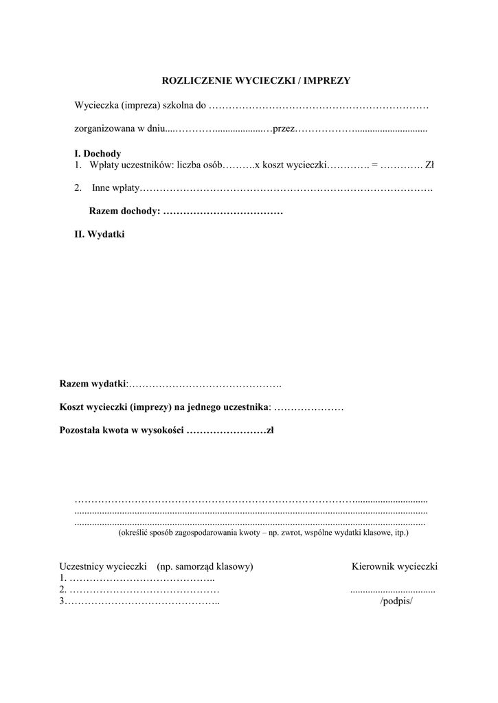 ROZLICZENIE WYCIECZKI / IMPREZY Wycieczka (impreza) szkolna do ………………………………………………………… zorganizowana w dniu....…………...................…przez………………............................. I. Dochody 1. Wpłaty uczestników: liczba osób……….x koszt wycieczki…………. = …………. Zł 2. Inne wpłaty……………………………………………………………………………. Razem dochody: ……………………………… II. Wydatki Razem wydatki:………………………………………. Koszt wycieczki (imprezy) na jednego uczestnika: ………………… Pozostała kwota w wysokości ……………………zł …………………………………………………………………………............................. ............................................................................................................................................. ............................................................................................................................................ (określić sposób zagospodarowania kwoty – np. zwrot, wspólne wydatki klasowe, itp.) Uczestnicy wycieczki (np. samorząd klasowy) 1. …………………………………….. 2. ……………………………………… 3……………………………………….. Kierownik wycieczki .................................. /podpis/