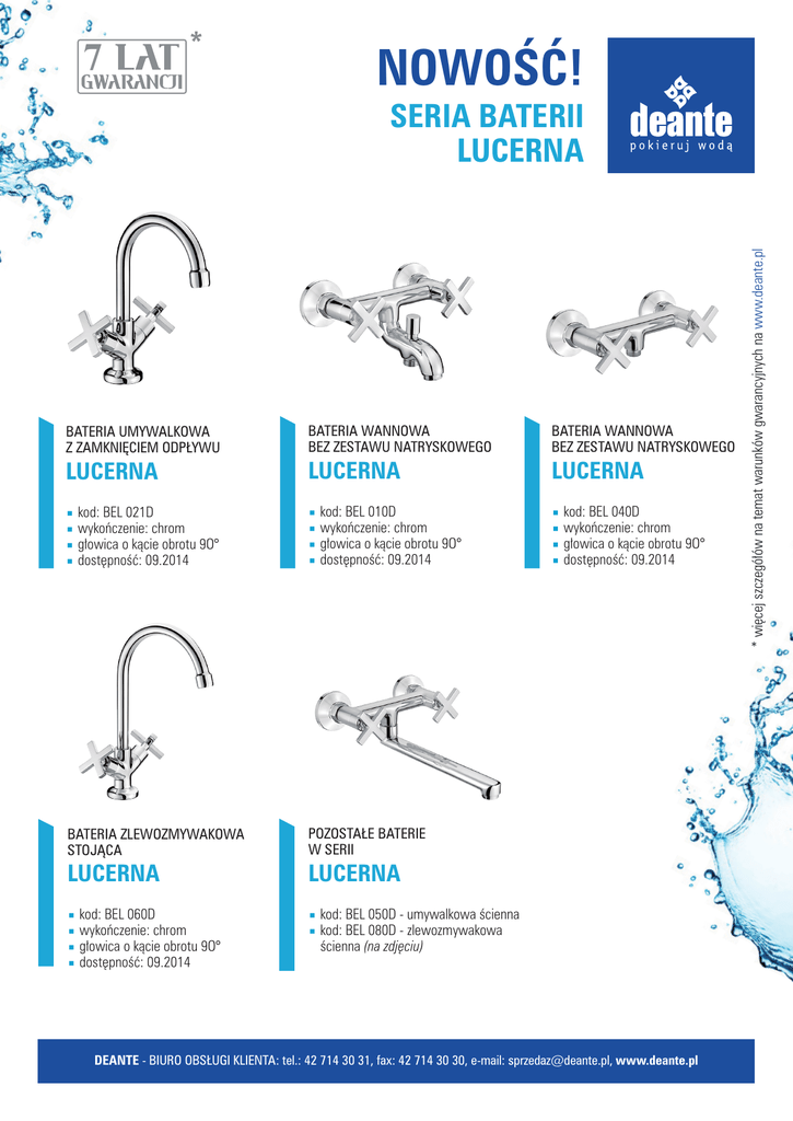 7 NOWOŚĆ! BATERIA UMYWALKOWA Z ZAMKNIĘCIEM ODPŁYWU LUCERNA < < < < kod: BEL 021D wykończenie: chrom głowica o kącie obrotu 9O° dostępność: 09.2014 BATERIA WANNOWA BEZ ZESTAWU NATRYSKOWEGO BATERIA WANNOWA BEZ ZESTAWU NATRYSKOWEGO LUCERNA LUCERNA < < < < kod: BEL 010D wykończenie: chrom głowica o kącie obrotu 9O° dostępność: 09.2014 BATERIA ZLEWOZMYWAKOWA STOJĄCA POZOSTAŁE BATERIE W SERII LUCERNA LUCERNA < < < < kod: BEL 060D wykończenie: chrom głowica o kącie obrotu 9O° dostępność: 09.2014 < < < < kod: BEL 040D wykończenie: chrom głowica o kącie obrotu 9O° dostępność: 09.2014 kod: BEL 050D - umywalkowa ścienna kod: BEL 080D - zlewozmywakowa ścienna (na zdjęciu) < < DEANTE - BIURO OBSŁUGI KLIENTA: tel.: 42 714 30 31, fax: 42 714 30 30, e-mail: [email protected], www.deante.pl * więcej szczegółów na temat warunków gwarancyjnych na www.deante.pl SERIA BATERII LUCERNA