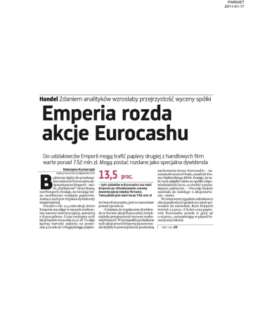 PARKIET 2011-01-17 Handel Zdaniem analityków wzrosłaby przejrzystość wyceny spółki Emperia rozda akcje Eurocashu Do udziałowców Emperii mogą trafić papiery drugiej z handlowych firm warte ponad 732 mln zł. Mogą zostać rozdane jako specjalna dywidenda Katarzyna Kucharczyk katarzyna.kucharczyklgiparkiet.com ędziemy dążyć do przekaza nia walorów Eurocashu ak cjonariuszom Emperii - mó wi „Parkietowi" Artur Kawa, szef Emperii. Dodaje, że istnieją róż ne możliwości wydania papierów. Jedną z nich jest wyplata dywidendy niepieniężnej. Chodzi o ok. 21,3 mln akcji, które Emperia ma objąć w ramach rozlicze nia umowy inwestycyjnej, zawartej z Eurocashem. Cena emisyjna tych akcji będzie wynosiła 22,21 zł. To daje łączną wartość pakietu na pozio mie 472 mln zl. Uwzględniając piątko- 13,5 proc. - tyle udziałów w Eurocashu ma mieć Emperia po sfinalizowaniu umowy inwestycyjnej między firmami. Taki pakiet jest wart teraz 732 mln zł wy kurs Eurocashu, jest to natomiast ponad 732 mln zł. - Uważam, że wypłacenie dywiden dy w formie akcji Eurocashu zwięk szyłoby przejrzystość wyceny rynko wej Emperii. W przypadku posiadania tych akcji przez Emperię jej notowa nia byłyby w pewnej mierze pochodną zachowania kursu Eurocashu - za uważa Krzysztof Pado, analityk Do mu Maklerskiego BDM. Dodaje, że ta ki ruch zdjąłby także ze spółki odpo wiedzialność za to, co zrobić z posia danym pakietem. - Decyzja będzie należała do każdego z akcjonariu szy-mówi. W minionym tygodniu udziałowcy obu handlowych spółek nie mieli po wodów do narzekań. Kurs Emperii wzrósł o 5 proc. Z kolei cena papie rów Eurocashu poszła w górę aż 0 16 proc, ustanawiając w piątek hi storyczny rekord. 1 TEMAT DNIA . 0 3