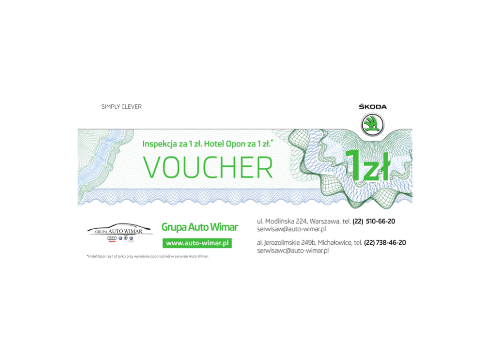 SIMPLY CLEVER Inspekcja za 1 zł. Hotel Opon za 1 zł.* VOUCHER Grupa Auto Wimar 1zł ul. Modlińska 224, Warszawa, tel. (22) 510-66-20 [email protected] al. Jerozolimskie 249b, Michałowice, tel. (22) 738-46-20 [email protected] *Hotel Opon za 1 zł tylko przy wymianie opon lub kół w serwisie Auto Wimar.