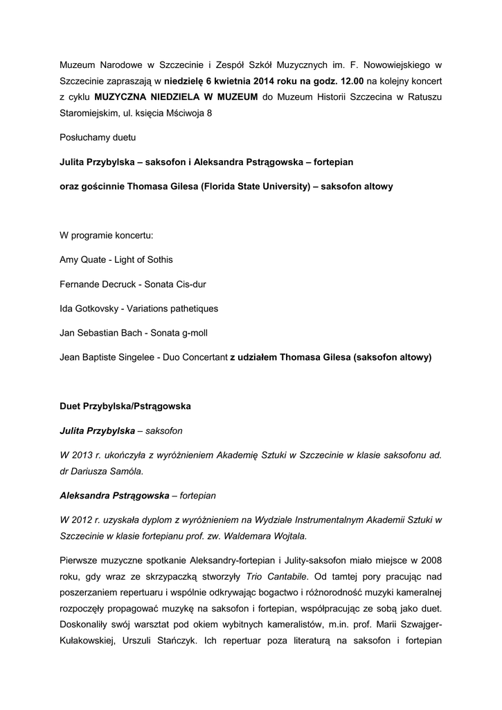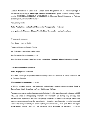 Muzeum Narodowe w Szczecinie i Zespół Szkół Muzycznych im. F. Nowowiejskiego w Szczecinie zapraszają w niedzielę 6 kwietnia 2014 roku na godz. 12.00 na kolejny koncert z cyklu MUZYCZNA NIEDZIELA W MUZEUM do Muzeum Historii Szczecina w Ratuszu Staromiejskim, ul. księcia Mściwoja 8 Posłuchamy duetu Julita Przybylska – saksofon i Aleksandra Pstrągowska – fortepian oraz gościnnie Thomasa Gilesa (Florida State University) – saksofon altowy W programie koncertu: Amy Quate - Light of Sothis Fernande Decruck - Sonata Cis-dur Ida Gotkovsky - Variations pathetiques Jan Sebastian Bach - Sonata g-moll Jean Baptiste Singelee - Duo Concertant z udziałem Thomasa Gilesa (saksofon altowy) Duet Przybylska/Pstrągowska Julita Przybylska – saksofon W 2013 r. ukończyła z wyróżnieniem Akademię Sztuki w Szczecinie w klasie saksofonu ad. dr Dariusza Samóla. Aleksandra Pstrągowska – fortepian W 2012 r. uzyskała dyplom z wyróżnieniem na Wydziale Instrumentalnym Akademii Sztuki w Szczecinie w klasie fortepianu prof. zw. Waldemara Wojtala. Pierwsze muzyczne spotkanie Aleksandry-fortepian i Julity-saksofon miało miejsce w 2008 roku, gdy wraz ze skrzypaczką stworzyły Trio Cantabile. Od tamtej pory pracując nad poszerzaniem repertuaru i wspólnie odkrywając bogactwo i różnorodność muzyki kameralnej rozpoczęły propagować muzykę na saksofon i fortepian, współpracując ze sobą jako duet. Doskonaliły swój warsztat pod okiem wybitnych kameralistów, m.in. prof. Marii SzwajgerKułakowskiej, Urszuli Stańczyk. Ich repertuar poza literaturą na saksofon i fortepian obejmuje transkrypcje i własne aranżacje. Laureatki krajowych i zagranicznych konkursów muzyki solowej i kameralnej, m. in. Concorso Internazionale del Bicentenario Premio di Musica da Camera w Mediolanie, Concorso Musicale Europeo CITTA' DI FILADELFIA oraz Międzynarodowego Przeglądu Zespołów Kameralnych w Jaworze. Stypendystki Prezydenta Miasta Szczecina. Duet prowadzi ożywioną działalność koncertową. Ma na swoim koncie koncerty na festiwalach muzycznych w Polsce (Festiwal Saksofonowy w Szczecinie 2010 r., Saxmania 2013 w Miastku i Szczecinie). Jest także głęboko zaangażowany w życie artystyczne miasta i regionu. W Szczecinie wielokrotnie występował na scenach Zamku Książąt Pomorskich, Filharmonii Szczecińskiej i Akademii Sztuki w Szczecinie.