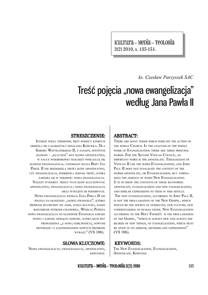 Kultura – Media – Teologia 2(2) 2010, s. 135-151. ks. Czesław Parzyszek SAC Treść pojęcia „nowa ewangelizacja” według Jana Pawła II STRESZCZENIE: ISTNIEJE WIELE TERMINÓW, PRZY POMOCY KTÓRYCH OKREŚLA SIĘ CAŁOKSZTAŁT DZIAŁANIA KOŚCIOŁA. DLA SOBORU WATYKAŃSKIEGO II, Z ZASADY, ISTOTNYM SŁOWEM – „KLUCZEM” JEST SŁOWO APOSTOLSTWO, W NAUCE POSOBOROWEJ TEOLODZY POSŁUGUJĄ SIĘ SŁOWEM EWANGELIZACJA, NATOMIAST SŁUGA BOśY JAN PAWEŁ II NIE PRZEKREŚLA TREŚCI SŁÓW APOSTOLSTWO, CZY EWANGELIZACJA, PODKREŚLA JEDNAK TREŚĆ, KTÓRA ZAWIERA SIĘ W TERMINIE: NOWA EWANGELIZACJA. NALEśY WYDOBYĆ TREŚCI TYCH SŁÓW KLUCZOWYCH: APOSTOLSTWO, EWANGELIZACJA I NOWA EWANGELIZACJA ORAZ WYRAśEŃ IM PODOBNYCH. NOWA EWANGELIZACJA WEDŁUG JANA PAWŁA II NIE POLEGA NA GŁOSZENIU „NOWEJ EWANGELII”, KTÓREJ ŹRÓDŁEM BYLIBYŚMY MY SAMI, NASZA KULTURA, NASZE ROZUMIENIE POTRZEB CZŁOWIEKA. WEDŁUG PAPIEśA NOWA EWANGELIZACJA TO GŁOSZENIE EWANGELII ZAWSZE NOWEJ I ZAWSZE NIOSĄCEJ NOWOŚĆ, KTÓRA MUSI BYĆ PROWADZONA „Z NOWĄ GORLIWOŚCIĄ, NOWYMI METODAMI I Z ZASTOSOWANIEM NOWYCH ŚRODKÓW WYRAZU” (VS 106). SŁOWA KLUCZOWE: NOWA EWANGELIZACJA; EWANGELIZACJA, APOSTOLSTWO, KERYGMAT. ABSTRACT: THERE ARE MANY TERMS WHICH INDICATE THE ACTION OF CHURCH. IN THE ANALYSIS OF THE WHOLE WORK OF EVANGELIZATION THERE ARE THREE PRINCIPAL WORDS. FOR THE SECOND VATICAN COUNCIL, AN IMPORTANT WORD IS THE APOSTOLATE. THEOLOGIANS OF VATICAN II USE THE WORD EVANGELIZATION, AND JOHN PAUL II DOES NOT INVALIDATE THE CONTENT OF THE WORDS APOSTOLATE, OR EVANGELIZATION, BUT EMPHASIZES THE ESSENCE OF WORD NEW EVANGELIZATION. IT IS TO SHOW THE CONTENTS OF THESE KEYWORDS: APOSTOLATE, EVANGELIZATION AND NEW EVANGELIZATION, AND SIMILAR EXPRESSIONS TO THEM IN THIS ARTICLE. THE NEW EVANGELIZATION, ACCORDING TO JOHN PAUL II, IS NOT THE PROCLAMATION OF THE NEW GOSPEL, WHICH WOULD BE THE SOURCE OF OURSELVES, OUR CULTURE, OUR UNDERSTANDING OF HUMAN NEEDS. NEW EVANGELIZATION ACCORDING TO THE HOLY FATHER'S IS THE PROCLAMATION OF THE GOSPEL, “WHICH IS ALWAYS NEW AND ALWAYS THE BEARER OF NEW THINGS, AN EVANGELIZATION, WHICH MUST BE »NEW IN ITS ARDOUR, METHODS AND EXPRESSION«" (VS 106). THE WHOLE KEYWORDS: THE NEW EVANGELIZATION, EVANGELIZATION, APOSTOLATE, KERYGMA Kultura – Media – Teologia 2(2) 2010 135 IMPLIKACJE TEOLOGICZNE E wangelizacja jest tak dawna, jak dawna jest Ewangelia. Dziś, podobnie jak przed wiekami, aktualne są słowa Chrystusa: „Idźcie na cały świat i głoście Ewangelię wszelkiemu stworzeniu” (Mk 16, 15). Jednak ta sama Ewangelia głoszona jest wciąŜ nowym ludziom, w nowych sytuacjach i nowych warunkach Ŝycia. Ewangelia się nie zmienia, ale zmienia się świat, któremu ma być głoszona. Inny był świat pierwszych wieków chrześcijaństwa, inny – świat wieków średnich, a jeszcze inny jest świat współczesny i współczesny człowiek1. Ludzie Kościoła stawiają pytanie, jak skutecznie dotrzeć z Ewangelią do współczesnego człowieka? Istnieją trzy terminy, za pomocą których określa się całokształt działania Kościoła2 i formułuje odpowiedź na postawione wyŜej pytanie. Dla Soboru Watykańskiego II istotnym słowem-kluczem jest termin apostolstwo3, a w nauce posoborowej Paweł VI i teolodzy posługują się słowem ewangelizacja4. Natomiast Sługa BoŜy Jan Paweł II nie przekreślał treści słów apostolstwo czy ewangelizacja, lecz podkreślał treść, która kryje się w pojęciu nowa ewangelizacja. Rodzi się zatem słuszne pytanie o relacje, jakie zachodzą pomiędzy terminami: apostolstwo, ewangelizacja i nowa ewangelizacja. Niniejszy artykuł jest próbą doprecyzowania treści pojęcia „nowa ewangelizacja”, tak często uŜywanego przez Jana Pawła II. Apostolstwo Apostolstwem (gr. apostèllo – posyłać) w znaczeniu ogólnym jest to wszystko, przez co Kościół w konkretnych warunkach urzeczywistnia i dzięki czemu wzrasta, ogarniając coraz to nowych ludzi i nowe dziedziny Ŝycia5. W sensie ściślejszym jest ono realizacją przez wiernych (indywidualnie lub zespołowo) powinności przepowiadania i świadczenia swym Ŝyciem o Chrystusie, wypływającej z ich uczestnictwa w potrójnym urzędzie i z nakazu misyjnego, wypowiedzianego przez Zbawiciela do apostołów (Mt 28, 18-20). Inaczej mówiąc, jest głoszeniem Chrystusa i Jego orędzia mesjańskiego słowami i czyna1 2 3 4 5 136 Por. Cz. Parzyszek, „Współczesny świat” i „współczesny człowiek” – wyzwanie dla formacji, w: Formacja dzisiaj do Ŝycia konsekrowanego jutra, Biblioteka „śycia Konsekrowanego” t. II, Warszawa-Wrocław 2002, s. 19-51. Por. W. Przyczyna, Teologia nowej ewangelizacji, Kraków 1992, s. 16. Sobór Watykański II mówi o ewangelizacji w czterech dokumentach: dokumentach konstytucji Lumen gentium i Gaudium et spes, oraz w dekrecie Apostolicam actuositatem i Ad gentes. Termin ewangelizacja pojawił się w teologii protestanckiej. Zaczęto go uŜywać w XIX wieku na określenie działalności protestanckich kaznodziejów wędrownych lub popularyzujących teksty Biblii celem pozyskania nowych wyznawców. Por. J. Krucina, Wprowadzenie, w: Ewangelizacja, J. Krucina (red.), Wrocław 1980, s. 5. Z czasem zaczęto uŜywać tego terminu w Kościele katolickim, choć ciągle w znaczeniu misyjnym, dla określenia przepowiadania Ewangelii tym, którzy jej nie znają. Por. K. JeŜyna, Moralne przesłanie nowej ewangelizacji. Wezwanie do odnowy Kościoła i świata, Lublin 2002, s. 24. Natomiast w krajach chrześcijańskich systematyczne głoszenie Ewangelii było nazywane kaznodziejstwem lub katechezą. Por. A. Lewek, Nowa ewangelizacja w duchu Soboru Watykańskiego II, t. I, Katowice 1995, s. 25. Por. W. Seremak, Apostolstwo, w: Leksykon duchowości katolickiej, M. Chmielewski (red.), Lublin-Kraków 2002, s. 59. Kultura – Media – Teologia 2(2) 2010 Cz. Parzyszek, Treść pojęcia „nowa ewangelizacja” według Jana Pawła II Istnieją trzy terminy,