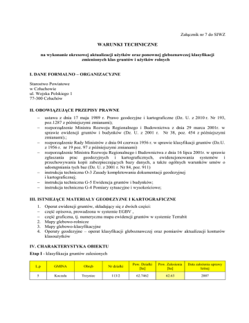 Załącznik nr 7 do SIWZ WARUNKI TECHNICZNE na wykonanie okresowej aktualizacji użytków oraz ponownej gleboznawczej klasyfikacji zmienionych klas gruntów i użytków rolnych I. DANE FORMALNO – ORGANIZACYJNE Starostwo Powiatowe w Człuchowie ul. Wojska Polskiego 1 77-300 Człuchów II. OBOWIĄZUJĄCE PRZEPISY PRAWNE − − − − − − − ustawa z dnia 17 maja 1989 r. Prawo geodezyjne i kartograficzne (Dz. U. z 2010 r. Nr 193, poz.1287 z późniejszymi zmianami); rozporządzenie Ministra Rozwoju Regionalnego i Budownictwa z dnia 29 marca 2001r. w sprawie ewidencji gruntów i budynków (Dz. U. z 2001 r. Nr 38, poz. 454 z późniejszymi zmianami).; rozporządzenie Rady Ministrów z dnia 04 czerwca 1956 r. w sprawie klasyfikacji gruntów (Dz.U. z 1956 r. nr 19 poz. 97 z późniejszymi zmianami) rozporządzenie Ministra Rozwoju Regionalnego i Budownictwa z dnia 16 lipca 2001r. w sprawie zgłaszania prac geodezyjnych i kartograficznych, ewidencjonowania systemów i przechowywania kopii zabezpieczających bazy danych, a także ogólnych warunków umów o udostępniania tych baz (Dz. U. z 2001 r. Nr 84, poz. 911) instrukcja techniczna O-3 Zasady kompletowania dokumentacji geodezyjnej i kartograficznej; instrukcja techniczna G-5 Ewidencja gruntów i budynków; instrukcja techniczna G-4 Pomiary sytuacyjne i wysokościowe; III. ISTNIEJĄCE MATERIAŁY GEODEZYJNE I KARTOGRAFICZNE 1. − − 2. 3. 4. Operat ewidencji gruntów, składający się z dwóch części: część opisowa, prowadzona w systemie EGBV , część graficzna, tj. numeryczna mapa ewidencji gruntów w systemie Terrabit Mapy glebowo-rolnicze Mapy glebowo-klasyfikacyjne Operaty geodezyjne – operat klasyfikacji gleboznawczej oraz pomiarów aktualizacji konturów klasoużytków IV. CHARAKTERYSTYKA OBIEKTU Etap I - klasyfikacja gruntów zalesionych L.p GMINA Obręb Nr działki Pow. Działki [ha] Pow. Zalesienia [ha] Data założenia uprawy leśnej 5 Koczała Trzyniec 113/2 62.7462 62.63 2007 Etap II - aktualizacja użytków i klas gruntów Część opisowa Obręb Lisewo Garbek Pakatulsko Numer GUS 220306_2.0003 220306_2.0002 220306_2.0006 Jednostka ewidencyjna Przechlewo Przechlewo Przechlewo Część graficzna Pow [ha] Ile działek Pow [ha] Ile działek 254.48 250.06 5.24 128 93 6 254.48 250.06 5.24 128 93 6 Jedn. rej. grunt.(ilość) 47 25 5 V. ZAKRES PRAC wykonanie ponownej gleboznawczej klasyfikacji zmienionych klas gruntów i użytków rolnych 1. Analiza i ocena materiałów wyjściowych. 2. Porównanie treści mapy ewidencyjnej z rejestrem gruntów. 3. Weryfikacja (porównanie) treści mapy ewidencyjnej ze stanem faktycznym w terenie w zakresie: − konturów użytków gruntowych, − linii brzegowej wód powierzchniowych, − dróg publicznych, gruntów leśnych, zadrzewionych i zakrzewionych z uwzględnieniem zgodności dotychczasowych oznaczeń z obecnie obowiązującymi przepisami prawa(Ls na gruntach prywatnych winien być oznaczony klasą np. Ls V, Lz IV – grunty zakrzewione powinny posiadać zapis opis użytku np. Lz – ŁIV) − klasyfikację gruntów zalesionych wykonać zgodnie z decyzją udatności wydaną przez Starostę Człuchowskiego. 4. Pomiar stwierdzonych zmian w zakresie treści danych ewidencyjnych. W przypadku pomiaru zalesień z etapu I oraz pomiar użytków etap II - pomiar należy wykonać na osnowę poziomą. Pomiarem należy również objąć miejsce położenia odkrywek charakteryzujących kontur klasyfikacyjny oraz rodzaj użytku. 5. Wywiad terenowy i przeprowadzenie badań gleboznawczych, ustalenie użytków i klas gruntów oraz sporządzenie protokołu klasyfikacyjnego. W protokole klasyfikacyjnym należy wpisać uzasadnienie proponowanych zmian. Protokół z przeprowadzenia klasyfikacji gruntów stanowi załącznik nr 2. 6. Opis odkrywek charakteryzujących kontur klasyfikacyjny oraz rodzaj użytku – należy wypełnić wszystkie pola – załącznik nr 1 do warunków technicznych (np. rodzaj drzewostanu, roślinność i inne charakterystyczne cechy przy opisie użytków zielonych, położenie i stosunki wodne, charakterystyka nieużytku). 7. Opracowanie mapy uzupełniającej klasyfikacji gruntów, obliczenie powierzchni zmienionych użytków, rozliczenie użytków gruntowych w działce, sporządzenie wykazu zmian gruntowych 8. Poinformowanie zainteresowane osoby o wynikach klasyfikacji gruntów. W protokole klasyfikacyjnym oraz mapie klasyfikacyjnej winny się znaleźć podpisy wszystkich właścicieli działek. 9. Sporządzenie mapy z projektem zmian przebiegu granic użytków i konturów klasyfikacyjnych. Na mapie klasyfikacyjnej winny być wskazane miejsca wykonania odkrywek. 10. Skompletowanie dokumentów powstałych w wyniku klasyfikacji i przekazanie ich celem wydania decyzji zatwierdzającej zmiany klasyfikacji. 11. Opracowanie numeryczne i kartograficzne stwierdzonych zmian (obliczenie współrzędnych punktów załamań granic użytków i konturów klasyfikacyjnych, obliczenie powierzchni zmienionych użytków, sporządzenie wykazu zmian danych ewidencyjnych – osobno dla każdej jednostki rejestrowej). 12. Skompletowanie dokumentów i przekazanie operatu technicznego sporządzonego zgodnie z przepisami prawa do Powiatowego Ośrodka Dokumentacji Geodezyjnej i Kartograficznej w Człuchowie w celu wydania decyzji klasyfikacyjnych do 15.11.2012 r. 13. Po uprawomocnieniu się decyzji – skompletowany operat należy przekazać do PODGIK w Człuchowie. 14. Dokumentacja winna być opracowana zgodnie z odnośnymi przepisami (również w celu wydania decyzji administracyjnej), winna zawierać protokoły z okazania zainteresowanym stwierdzonych zmian (łącznie z podpisami) oraz mapy zmian i wykazy zmian gruntowych Wyniki odliczeń współrzędnych załamań granic użytków i konturów klasyfikacyjnych oraz punktów przecięcia tychże granic z zgranicami działek winny być opracowane w postaci numerycznej, umożliwiającej wprowadzenie ich do systemu Terrabit (np. TXT lub DXF). 15.