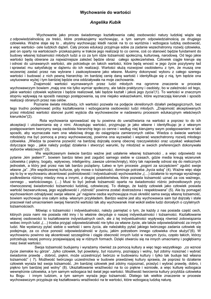 Wychowanie do wartości Angelika Kubik Wychowanie jako proces świadomego kształtowania całej osobowości natury ludzkiej wiąże się z odpowiedzialnością za treści, które przekazujemy wychowując, a tym samym odpowiedzialnością za drugiego człowieka. Ważne staje się to , abyśmy wychowując kładli nacisk na to co wyróżnia i wzbogaca ludzką osobowość, a więc wartości- cele ludzkich dążeń. Cały proces edukacji przyjmuje sobie za zadanie wszechstronny rozwój człowieka, jest on oparty na wartościach- przekazujemy w trakcie jego realizacji to co cenne, coś co stanowić będzie fundament do budowy własnej tożsamości młodych ludzi a co za tym idzie tożsamość społeczną, kulturową, narodową. Od tego jakie wartości będą obierane za najważniejsze zależeć będzie obraz całego społeczeństwa. Człowiek ciągle kieruje się i odnosi do uznawanych wartości, ale potrzebuje on takich wartości, które będą wnosić w jego życie pozytywny ład i sprawiać mu satysfakcję w dążeniu do ich realizacji. Wartości służą rozwojowi osobistemu z tym, że muszą one wczesniej zastać przez nas wybrane i zaakceptowane jako własne. Musimy dokonywać wyboru z całego szeregu wartości i budować z nich pewną hierarchię- im bardziej cenię daną wartość i identyfikuje się z nią, tym będzie ona usytuowana wyżej i tym bardziej będzie ona oddziaływała na moje zachowanie. Znajomość wartości wyznawanych przez ludzi młodych ma ogromne znaczenie w procesie wychowawczym bowiem „mają one nie tylko wymiar społeczny, ale także praktyczny i osobisty, bo w zależności od tego, jakie wartości człowiek wybierze i będzie realizował, taki będzie kształt i jakoś jego życia”(1). To wartości w znacznym stopniu wpływają na sposób naszego postępowania, są one niejako wskazówkami, które wyznaczają kierunek i sposób realizacji obranych przez nas celów. Poznanie świata młodzieży, ich wartości pozwala na podjęcie określonych działań pedagogicznych, bez tego trudno podejmować próby kształtowania i wzbogacania osobowości ludzi młodych. „Znajomość akceptowanych przez młodzież wartości stanowi punkt wyjścia dla wychowawców w nadawaniu procesom edukacyjnym właściwych kierunków”(2). Rola wychowania sprowadzać się tu powinna do uwrażliwiania na wartości a poprzez to do ich akceptacji i utożsamiania się z nimi. Akceptując wartości, przyjmując je jako własne i identyfikując je z własnym postępowaniem tworzymy swoją osobista hierarchię tego co cenne i według niej kierujemy swym postępowaniem w taki sposób, aby wyznaczała nam ona właściwą drogę do osiągnięcia zamierzonych celów. Wiedza o świecie wartości młodzieży ma być pomocą a pracy wychowawczej, powinna ona wyzwalać i wspierać wszechstronny rozwój młodego człowieka. „Wiedza ta powinna pozwolić na bardziej dojrzałą ocenę obecnej rzeczywistości oraz uzyskać wskazówki dotyczące tego , jakie należy podjąć działania i stworzyć warunki, by młodzież w swoich preferencjach dokonywała wyborów właściwych” (3). We współczesnym świecie bardzo ważne jest ustalenie własnej tożsamości , a więc odpowiedz na pytanie „kim jestem?”, bowiem bardzo łatwo jest zagubić samego siebie w czasach, gdzie media kreują wizerunek człowieka ( piękny, bogaty, wpływowy, inteligentny, zawsze uśmiechnięty), który tak naprawdę odnosi się do nielicznych jednostek, a który jest przez nas tak bardzo pożądany. Łatwo w tym procesie „pogoni za szczęściem” zgubić swoje własne „ja”. „We współczesnej kulturze, gdy mowa o tożsamości, dominuje potrzeba „bycia sobą” (4). Ważne więc staje się to by w wychowaniu akcentować podmiotowość i indywidualność wychowanków „(…) działanie to wymaga wyraźnego podkreślenia różnicy miedzy mną a innymi, z drugiej podobieństwa, które pozwala tożsamość uznać za cos ważnego, cennego , wartościowego. (…) Musi to być jednak tożsamość oparta na świadomości różnic jednostkowych przy równoczesnej świadomości tożsamości ludzkiej, człowieczej. To dlatego, że każdy człowiek jako człowiek posiada wartość bezwarunkową, jego wyjątkowość i „różność” powinna zostać dostrzeżona i respektowana” (5). Ale by pomagać wychowankom odnajdywać swoje własne „ja” najpierw osoba wychowująca musi określić sama swoją własną tożsamość, bowiem wychowuje ona całym sobą- własnym przykładem. Bardzo ważne jest aby wychowawca sam był dojrzały i stale pracował nad umacnianiem swojej hierarchii wartości tak aby wychowanek miał wokół siebie ludzi dorosłych o czytelnych tożsamościach. Mówiąc o tożsamości i indywidualności, należy pamiętać o tym, że każdy z nas posiada część cech, których poza nami nie posiada nikt inny i to właśnie decyduje o naszej indywidualności i tożsamości. Kształtowanie własnej osobowości to kształtowanie indywidualnych cech, ale z tej indywidualności wypływają również zobowiązania wobec innych ludzi „(…) trzeba przyjąć odpowiedzialność nie tylko za własne życie, ale także odpowiedzialność za innych ludzi. Nie wystarczy pytać siebie o wartość i sens życia, ale należałoby pytać jakiego twórczego zadania człowiek się podejmuje, za co chce ponosić odpowiedzialność w życiu, jakim potrzebom innego człowieka chce służyć”(6). W wychowaniu powinno się akcentować szczególnie i ciągle obecność innych ludzi w naszym życiu, często takich, którzy potrzebują naszej pomocy przejawiającej się w różnych formach. Dzięki otwarciu się na innych umacniamy i pogłębiamy nasz świat wartości. Swoja tożsamość budujemy i wyrażamy również za pomocą kultury a więc tego wszystkiego „co wznosi życie ziemskie ku górze”. „tylko człowiek, byt powołany, byt rozumny, poznający i wolny, byt zdolny rozeznać i wybrać świadomie prawdę , dobro