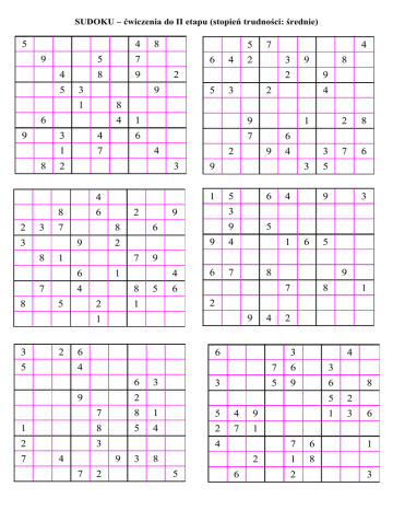 SUDOKU – ćwiczenia do II etapu (stopień trudności: średnie) 5 4 9 4 5 5 7 8 9 3 6 4 3 4 1 7 3 6 7 2 8 2 5 2 5 5 9 4 9 6 7 1 6 5 9 7 8 4 3 3 3 7 8 1 5 4 9 1 8 5 4 2 7 1 2 3 2 1 2 4 7 6 3 5 9 6 2 4 3 3 8 4 7 5 5 6 9 6 2 6 4 7 3 9 9 3 4 6 1 6 7 4 6 9 4 8 8 9 1 4 2 6 9 1 3 4 3 6 7 5 9 9 9 2 6 8 8 1 2 1 1 7 9 2 9 4 6 9 8 3 3 1 3 7 3 2 2 5 4 2 4 2 2 8 4 7 8 6 8 5 9 1 9 8 8 2 5 6 7 6 1 8 2 8 5 2 1 3 6 1 3