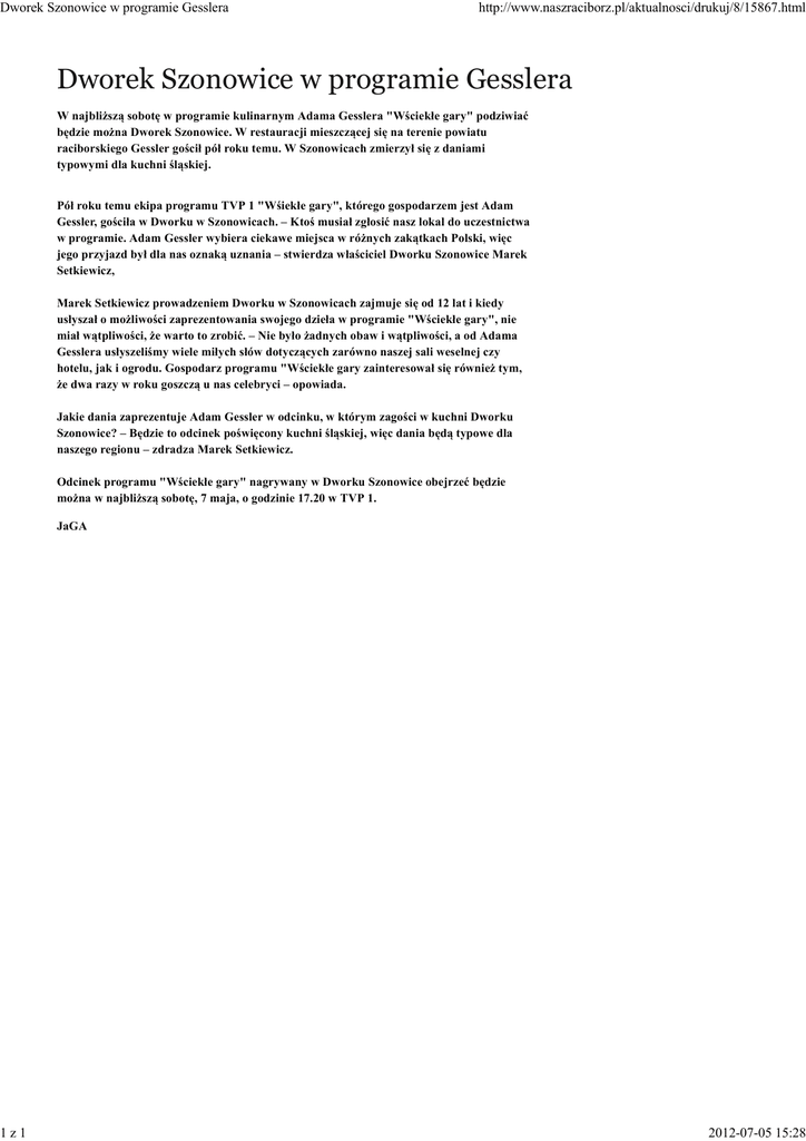 Dworek Szonowice w programie Gesslera 1z1 http://www.naszraciborz.pl/aktualnosci/drukuj/8/15867.html Dworek Szonowice w programie Gesslera W najbliższą sobotę w programie kulinarnym Adama Gesslera "Wściekłe gary" podziwiać będzie można Dworek Szonowice. W restauracji mieszczącej się na terenie powiatu raciborskiego Gessler gościł pół roku temu. W Szonowicach zmierzył się z daniami typowymi dla kuchni śląskiej. Pół roku temu ekipa programu TVP 1 "Wśiekłe gary", którego gospodarzem jest Adam Gessler, gościła w Dworku w Szonowicach. – Ktoś musiał zgłosić nasz lokal do uczestnictwa w programie. Adam Gessler wybiera ciekawe miejsca w różnych zakątkach Polski, więc jego przyjazd był dla nas oznaką uznania – stwierdza właściciel Dworku Szonowice Marek Setkiewicz, Marek Setkiewicz prowadzeniem Dworku w Szonowicach zajmuje się od 12 lat i kiedy usłyszał o możliwości zaprezentowania swojego dzieła w programie "Wściekłe gary", nie miał wątpliwości, że warto to zrobić. – Nie było żadnych obaw i wątpliwości, a od Adama Gesslera usłyszeliśmy wiele miłych słów dotyczących zarówno naszej sali weselnej czy hotelu, jak i ogrodu. Gospodarz programu "Wściekłe gary zainteresował się również tym, że dwa razy w roku goszczą u nas celebryci – opowiada. Jakie dania zaprezentuje Adam Gessler w odcinku, w którym zagości w kuchni Dworku Szonowice? – Będzie to odcinek poświęcony kuchni śląskiej, więc dania będą typowe dla naszego regionu – zdradza Marek Setkiewicz. Odcinek programu "Wściekłe gary" nagrywany w Dworku Szonowice obejrzeć będzie można w najbliższą sobotę, 7 maja, o godzinie 17.20 w TVP 1. JaGA 2012-07-05 15:28