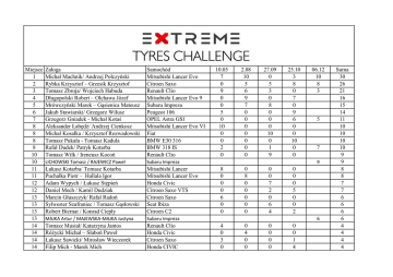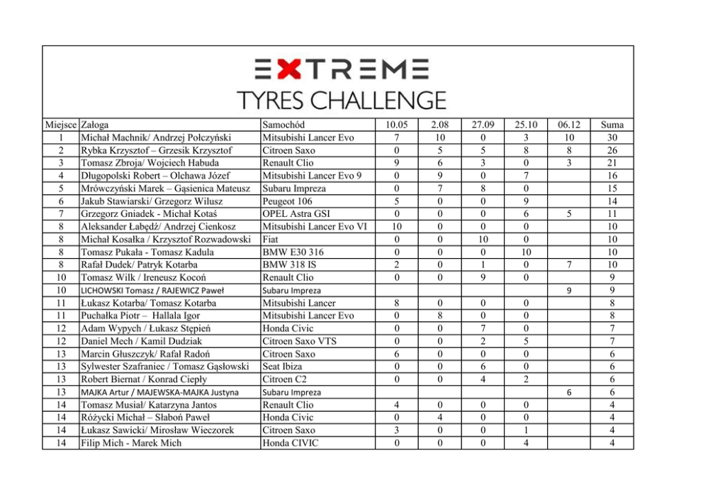 Miejsce 1 2 3 4 5 6 7 8 8 8 8 10 10 11 11 12 12 13 13 13 13 14 14 14 14 Załoga Michał Machnik/ Andrzej Połczyński Rybka Krzysztof – Grzesik Krzysztof Tomasz Zbroja/ Wojciech Habuda Długopolski Robert – Olchawa Józef Mrówczyński Marek – Gąsienica Mateusz Jakub Stawiarski/ Grzegorz Wilusz Grzegorz Gniadek - Michał Kotaś Aleksander Łabędź/ Andrzej Cienkosz Michał Kosałka / Krzysztof Rozwadowski Tomasz Pukała - Tomasz Kadula Rafał Dudek/ Patryk Kotarba Tomasz Wilk / Ireneusz Kocoń Samochód Mitsubishi Lancer Evo Citroen Saxo Renault Clio Mitsubishi Lancer Evo 9 Subaru Impreza Peugeot 106 OPEL Astra GSI Mitsubishi Lancer Evo VI Fiat BMW E30 316 BMW 318 IS Renault Clio LICHOWSKI Tomasz / RAJEWICZ Paweł Subaru Impreza Łukasz Kotarba/ Tomasz Kotarba Puchałka Piotr – Hallala Igor Adam Wypych / Łukasz Stępień Daniel Mech / Kamil Dudziak Marcin Głuszczyk/ Rafał Radoń Sylwester Szafraniec / Tomasz Gąsłowski Robert Biernat / Konrad Ciepły Mitsubishi Lancer Mitsubishi Lancer Evo Honda Civic Citroen Saxo VTS Citroen Saxo Seat Ibiza Citroen C2 MAJKA Artur / MAJEWSKA-MAJKA Justyna Subaru Impreza Tomasz Musiał/ Katarzyna Jantos Różycki Michał – Słaboń Paweł Łukasz Sawicki/ Mirosław Wieczorek Filip Mich - Marek Mich Renault Clio Honda Civic Citroen Saxo Honda CIVIC 10.05 7 0 9 0 0 5 0 10 0 0 2 0 2.08 10 5 6 9 7 0 0 0 0 0 0 0 27.09 0 5 3 0 8 0 0 0 10 0 1 9 25.10 3 8 0 7 0 9 6 0 0 10 0 0 06.12 10 8 3 5 7 9 8 0 0 0 6 0 0 0 8 0 0 0 0 0 0 0 7 2 0 6 4 0 0 0 5 0 0 2 6 4 0 3 0 0 4 0 0 0 0 0 0 0 0 1 4 Suma 30 26 21 16 15 14 11 10 10 10 10 9 9 8 8 7 7 6 6 6 6 4 4 4 4 14 15 16 16 17 17 17 GRZELAK Marek / LETNIOWSKI Dominik BMW 330 Karolczak Kazimierz – Paciej Michał Wróbel Janusz – Majerski Mateusz Subaru Impreza Renault Clio BRODOWSKI Miłosz / GŁOWACKI Tomasz Mitsubishi Lance Tomasz Knapik/ Krzysztof Suchanek Wilk Wojciech – Rudnik Marek Suzuki Swift Renault Clio KRAM Jarosław / INGRAM Wiesław Subaru Impreza 4 0 0 3 2 0 0 0 0 2 1 0 0 1 0 0 0 0 1 4 3 2 2 1 1 1