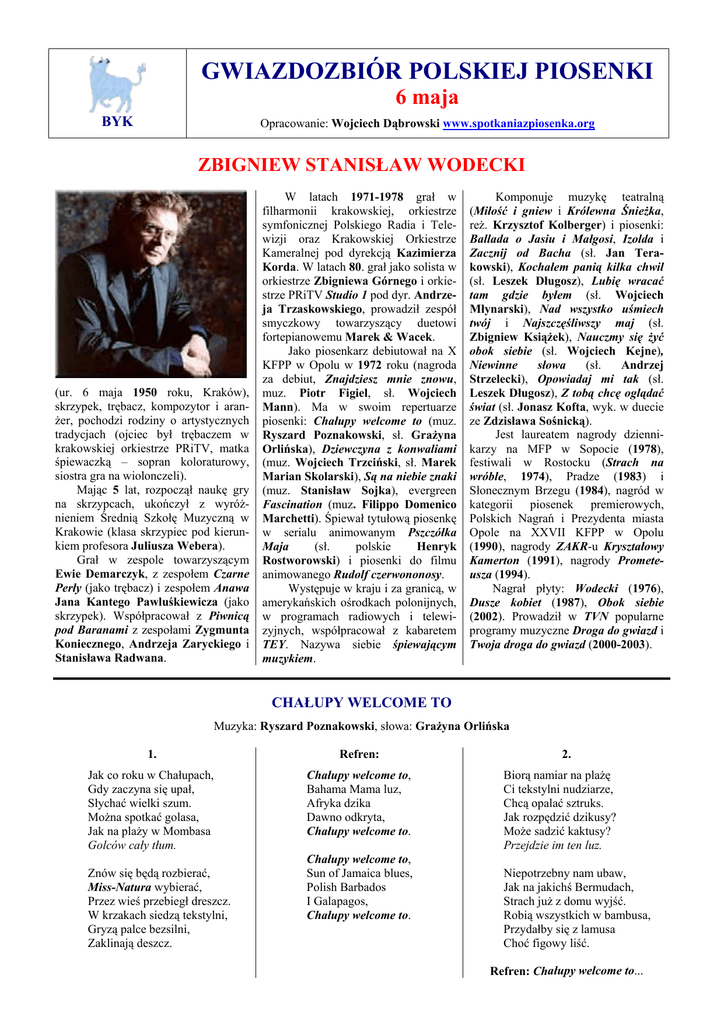 GWIAZDOZBIÓR POLSKIEJ PIOSENKI 6 maja BYK Opracowanie: Wojciech Dąbrowski www.spotkaniazpiosenka.org ZBIGNIEW STANISŁAW WODECKI (ur. 6 maja 1950 roku, Kraków), skrzypek, trębacz, kompozytor i aranżer, pochodzi rodziny o artystycznych tradycjach (ojciec był trębaczem w krakowskiej orkiestrze PRiTV, matka śpiewaczką – sopran koloraturowy, siostra gra na wiolonczeli). Mając 5 lat, rozpoczął naukę gry na skrzypcach, ukończył z wyróżnieniem Średnią Szkołę Muzyczną w Krakowie (klasa skrzypiec pod kierunkiem profesora Juliusza Webera). Grał w zespole towarzyszącym Ewie Demarczyk, z zespołem Czarne Perły (jako trębacz) i zespołem Anawa Jana Kantego Pawluśkiewicza (jako skrzypek). Współpracował z Piwnicą pod Baranami z zespołami Zygmunta Koniecznego, Andrzeja Zaryckiego i Stanisława Radwana. W latach 1971-1978 grał w filharmonii krakowskiej, orkiestrze symfonicznej Polskiego Radia i Telewizji oraz Krakowskiej Orkiestrze Kameralnej pod dyrekcją Kazimierza Korda. W latach 80. grał jako solista w orkiestrze Zbigniewa Górnego i orkiestrze PRiTV Studio 1 pod dyr. Andrzeja Trzaskowskiego, prowadził zespół smyczkowy towarzyszący duetowi fortepianowemu Marek & Wacek. Jako piosenkarz debiutował na X KFPP w Opolu w 1972 roku (nagroda za debiut, Znajdziesz mnie znowu, muz. Piotr Figiel, sł. Wojciech Mann). Ma w swoim repertuarze piosenki: Chałupy welcome to (muz. Ryszard Poznakowski, sł. Grażyna Orlińska), Dziewczyna z konwaliami (muz. Wojciech Trzciński, sł. Marek Marian Skolarski), Są na niebie znaki (muz. Stanisław Sojka), evergreen Fascination (muz. Filippo Domenico Marchetti). Śpiewał tytułową piosenkę w serialu animowanym Pszczółka Maja (sł. polskie Henryk Rostworowski) i piosenki do filmu animowanego Rudolf czerwononosy. Występuje w kraju i za granicą, w amerykańskich ośrodkach polonijnych, w programach radiowych i telewizyjnych, współpracował z kabaretem TEY. Nazywa siebie śpiewającym muzykiem. Komponuje muzykę teatralną (Miłość i gniew i Królewna Śnieżka, reż. Krzysztof Kolberger) i piosenki: Ballada o Jasiu i Małgosi, Izolda i Zacznij od Bacha (sł. Jan Terakowski), Kochałem panią kilka chwil (sł. Leszek Długosz), Lubię wracać tam gdzie byłem (sł. Wojciech Młynarski), Nad wszystko uśmiech twój i Najszczęśliwszy maj (sł. Zbigniew Książek), Nauczmy się żyć obok siebie (sł. Wojciech Kejne), Niewinne słowa (sł. Andrzej Strzelecki), Opowiadaj mi tak (sł. Leszek Długosz), Z tobą chcę oglądać świat (sł. Jonasz Kofta, wyk. w duecie ze Zdzisława Sośnicką). Jest laureatem nagrody dziennikarzy na MFP w Sopocie (1978), festiwali w Rostocku (Strach na wróble, 1974), Pradze (1983) i Słonecznym Brzegu (1984), nagród w kategorii piosenek premierowych, Polskich Nagrań i Prezydenta miasta Opole na XXVII KFPP w Opolu (1990), nagrody ZAKR-u Kryształowy Kamerton (1991), nagrody Prometeusza (1994). Nagrał płyty: Wodecki (1976), Dusze kobiet (1987), Obok siebie (2002). Prowadził w TVN popularne programy muzyczne Droga do gwiazd i Twoja droga do gwiazd (2000-2003). CHAŁUPY WELCOME TO Muzyka: Ryszard Poznakowski, słowa: Grażyna Orlińska 1. Refren: Jak co roku w Chałupach, Gdy zaczyna się upał, Słychać wielki szum. Można spotkać golasa, Jak na plaży w Mombasa Golców cały tłum. Chałupy welcome to, Bahama Mama luz, Afryka dzika Dawno odkryta, Chałupy welcome to. Znów się będą rozbierać, Miss-Natura wybierać, Przez wieś przebiegł dreszcz. W krzakach siedzą tekstylni, Gryzą palce bezsilni, Zaklinają deszcz. Chałupy welcome to, Sun of Jamaica blues, Polish Barbados I Galapagos, Chałupy welcome to. 2. Biorą namiar na plażę Ci tekstylni nudziarze, Chcą opalać sztruks. Jak rozpędzić dzikusy? Może sadzić kaktusy? Przejdzie im ten luz. Niepotrzebny nam ubaw, Jak na jakichś Bermudach, Strach już z domu wyjść. Robią wszystkich w bambusa, Przydałby się z lamusa Choć figowy liść. Refren: Chałupy welcome to...
