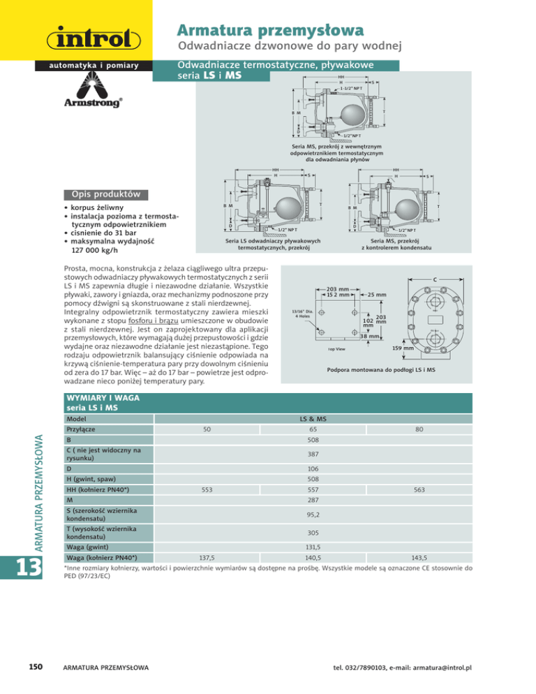 Armatura przemysłowa Odwadniacze dzwonowe do pary wodnej Odwadniacze termostatyczne, pływakowe )) seria LS i MS ) 4 /1 5 5 # . % /1 5 4FSJB.4QS[FLSÌK[XFXOÃUS[OZN PEQPXJFUS[OJLJFNUFSNPTUBUZD[OZN EMBPEXBEOJBOJBQZOÌX )) )) ) 4 ) 4 Opis produktów 5 # . • korpus żeliwny • instalacja pozioma z termostatycznym odpowietrznikiem • cisnienie do 31 bar • maksymalna wydajność 127 000 kg/h % % /1 5 4FSJB-4PEXBEOJBD[ZQZXBLPXZDI UFSNPTUBUZD[OZDIQS[FLSÌK Prosta, mocna, konstrukcja z żelaza ciągliwego ultra przepustowych odwadniaczy pływakowych termostatycznych z serii LS i MS zapewnia długie i niezawodne działanie. Wszystkie pływaki, zawory i gniazda, oraz mechanizmy podnoszone przy pomocy dźwigni są skonstruowane z stali nierdzewnej. Integralny odpowietrznik termostatyczny zawiera mieszki wykonane z stopu fosforu i brązu umieszczone w obudowie z stali nierdzewnej. Jest on zaprojektowany dla aplikacji przemysłowych, które wymagają dużej przepustowości i gdzie wydajne oraz niezawodne działanie jest niezastąpione. Tego rodzaju odpowietrznik balansujący ciśnienie odpowiada na krzywą ciśnienie-temperatura pary przy dowolnym ciśnieniu od zera do 17 bar. Więc – aż do 17 bar – powietrze jest odprowadzane nieco poniżej temperatury pary. 5 # . /1 5 4FSJB.4QS[FLSÌK [LPOUSPMFSFNLPOEFOTBUV $ NN NN NN */-&5 - %JB )PMFT NN NN 06 5-&5 5 NN 5PQ7JFX NN 1PEQPSBNPOUPXBOBEPQPEPHJ-4J.4 WYMIARY I WAGA seria LS i MS Model ARMATURA PRZEMYSŁOWA Przyłącze 13 150 LS & MS 50 65 B 508 C ( nie jest widoczny na rysunku) 387 D 106 508 H (gwint, spaw) HH (kołnierz PN40*) 553 557 M 287 S (szerokość wziernika kondensatu) 95,2 T (wysokość wziernika kondensatu) 305 563 131,5 Waga (gwint) Waga (kołnierz PN40*) 80 137,5 140,5 143,5 *Inne rozmiary kołnierzy, wartości i powierzchnie wymiarów są dostępne na prośbę. Wszystkie modele są oznaczone CE stosownie do PED (97/23/EC) ARMATURA PRZEMYSŁOWA tel. 032/7890103, e-mail: [email protected] Armatura przemysłowa Odwadniacze dzwonowe do pary wodnej Maksymalne warunki pracy* Maksymalne ciśnienie dopuszczalne (konstrukcja naczyniowa) Maksymalne warunki pracy model LS: 31 bar @ 338°C model MS: 31 bar @ 338°C model 30-LS: 2 bar pary nasyconej model 100-LS: 7 bar pary nasyconej model 150-LS: 10 bar pary nasyconej model 250-LS: 17 bar pary nasyconej model 250-MS: 17 bar pary nasyconej model 450-LS: 31 bar pary nasyconej model 450-MS: 31 bar pary nasyconej Maksymalne ciśnienie zwrotne 99% ciśnienia wlotowego Maksymalna temperatura pracy mieszków 217°C gwintowane BSPT i NPT Przyłącza spawany czołowo kołnierz DIN lub ANSI (spawany) Materiały Obudowa i pokrywa ASTM A216 WCB Wnętrze wszystko z stali nierdzewnej – 304 Zawór(y) i gniazdo(/a) stal nierdzewna Zaślepka odwadniająca stal węglowa Termostatyczny odpowietrznik stal nierdzewna i brąz z mieszkami z stopu brązu i fosforu?, zamknięte w stali nierdzewnej * Dla ciśnień powyżej 17 bar, odpowietrznik termostatyczny powinien być usunięty, a używać powinno się tylko wersji CC lub LD. Opcje Wewnętrzny łamacz próżni maksymalnie 10 bar. Należy dodać przedrostek VB do numeru modelu Brak wewnętrznego odpowietrznika termostatycznego dla odwadniania płynów. Należy dodać przedrostek LD do numeru modelu Integralne usuwanie pary zwrotnej do syfonu odwadniającego. Należy dodać przedrostek CC do numeru modelu Szkło zbrojone dla wskaźnika 17 bar @ 218°C Seria LS i MS jest dostępna z podporą, którą można zamocować w podłodze. Należy skonsultować się z fabryką. Seria LS i MS odwadniaczy pływakowych termostatycznych o dużej wydajności Staliwo dla instalacji poziomych z odpowietrznikiem termostatycznym Dla ciśnień do 31 bar... Wydajności do 127 000 kg/h WYKRESY WYDAJNOŚCI KONDENSATU W TEMPERATURZE PARY Model LS Model MS 8ZEBKOPw¿<LHI> 8ZEBKOPw¿<LHI> 3ÌOJDBDJwOJFÊ<CBS> e-mail: [email protected], tel. 032/7890103 ARMATURA PRZEMYSŁOWA Specyfikacja Pływakowy odwadniacz termostatyczny, model... z staliwa, wraz z odpowietrznikiem termostatycznym. Maksymalne dopuszczalne ciśnienie zwrotne 99% ciśnienia wlotowego. 13 3ÌOJDBDJwOJFÊ<CBS> ARMATURA PRZEMYSŁOWA 151 Armatura przemysłowa Odwadniacze dzwonowe do pary wodnej Specjalna konfiguracja Kontrolery kondensatu wraz z odwadniającym syfonem zwrotnym i/lub kaskadowym układem?. Konfiguracja kontrolera kondensatu (CC) została rozwinięta po to by sprostać bardzo dużym potrzebom wydajnościowym w aplikacjach gdzie kondensat musi być podniesiony z poziomu odwadniania do odwadniacza. W tego rodzaju warunkach – często określanych odwadnianiem syfonowym – redukcja w ciśnieniu, która następuje kiedy kondensat jest podnoszony powoduje że pewna ilość kondensatu zmienia się w parę. Zwyczajne odwadniacze, niezdolne do rozróżnienia pomiędzy parą zwrotną a parą żywą, zamykają się i utrudniają odwadnianie. Seria LS i MS kontrolerów kondensatu (CC) jest wyposażona w stały, ograniczony zawór umieszczony niedaleko górnej części obudowy, który uwalnia parę zwrotną (i całe obecne powietrze). Pozwala to odwadniaczowi odpowiednio funkcjonować kiedy obecny jest kondensat. Odwadniacze o dużej wydajności z odpowietrznikiem umieszczonym przy wlocie kondensatu przeznaczone są do odprowadzania powietrza i innych gazów pod ciśnieniem. Konfiguracja liquid drainer (LD) została rozwinięta po to by sprostać bardzo dużym potrzebom i odwadnianiu wody i innych płynów z powietrza lub innych gazów pod ciśnieniem. Aby zapobiec wiązaniu powietrza lub gazów, dostępny otwór przelotowy umieszczony na górze odwadniacza pracuje jako przyłączony tylny otwór wentylacyjny dla wyposażenia które odwadnia. Aby zobaczyć dane na temat wydajności należy przejść do stron LD-439 i LD-462 lub skonsultować się z reprezentantem firmy Armstrong. Jak zamawiać Ciśnienie Model Wielkość przyłącza Opcje 100 LS 10 VB LS 8 = DN50 10 = DN65 MS 12 = DN80 30 = 2bar 100 = 7 bar 150 = 10,5 b