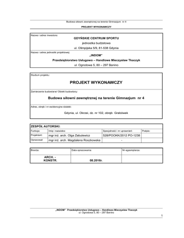 Budowa siłowni zewnętrznej na terenie Gimnazjum nr 4 PROJEKT WYKONAWCZY Nazwa i adres inwestora: GDYŃSKIE CENTRUM SPORTU jednostka budżetowa ul. Olimpijska 5/9, 81-538 Gdynia Nazwa i adres jednostki projektowej: „INDOM” Przedsiębiorstwo Usługowo – Handlowe Mieczysław Tkaczyk ul. Ogrodowa 5, 80 – 297 Banino Studium projektu: PROJEKT WYKONAWCZY Zamierzenie budowlane/ Obiekt budowlany: Budowa siłowni zewnętrznej na terenie Gimnazjum nr 4 Adres, obręb i nr ewidencyjne działek: Gdynia, ul. Okrzei, dz. nr 102, obręb Grabówek ZESPÓŁ AUTORSKI: Funkcja: Imię i nazwisko: Specjalność i nr uprawnień: Projektant: mgr inż. arch. Olga Zabulewicz 528/POOKK/2012 PO-1238 Opracował: mgr inż. arch. Magdalena Roszkowska Branża: Data opracowania: ARCH. KONSTR. Podpis: - Nr egzemplarza: 08.2016r. „INDOM” Przedsiębiorstwo Usługowo – Handlowe Mieczysław Tkaczyk ul. Ogrodowa 5, 80 – 297 Banino 1 Budowa siłowni zewnętrznej na terenie Gimnazjum nr 4 PROJEKT WYKONAWCZY 2. ZAWARTOŚĆ OPRACOWANIA 1. Strona tytułowa 1 2. Zawartość opracowania 2 3. Oświadczenia projektantów 3 4. Zaświadczenia projektantów – uprawnienia i przynależność do izby 4 5. Projekt Wykonawczy 6 Opis techniczny 6 5.1 Podstawa Opracowania 6 5.2 Cel i zakres opracowania 6 5.3 Materiały wyjściowe do opracowania 6 5.4 Rodzaj i skala przedsięwzięcia 7 5.5 Lokalizacja 7 5.6 Stan istniejący 7 5.7 Istniejące warunki gruntowe 7 5.8 Dojazd na plac budowy 7 5.9 Opis prac rozbiórkowych i demontażowych 8 5.10 Opis robót ziemnych 8 5.11 Opis stanu projektowanego 8 5.11.1 Lokalizacja 8 5.11.2 Dane liczbowe zakresu ilości prac 9 5.11.3 Układ przestrzenno-funkcjonalny 9 5.11.4 Rozwiązania techniczne 9 5.11.5 Opis zadania A. Siłownia zewnętrzna 12 B. Odwodnienie 13 5.11.6 Rozwiązania materiałowe 14 A. Nawierzchnia siłowni 14 B. Beton 14 C. Pozostałe rozwiązania materiałowe 14 D. Zabezpieczenie elementów 15 E. Wykończenie/kolorystyka 15 F. Uwagi wykonawcze 15 5.11.7 Wykaz zbrojenia fundamentów Karty techniczne Część Rysunkowa „INDOM” Przedsiębiorstwo Usługowo – Handlowe Mieczysław Tkaczyk ul. Ogrodowa 5, 80 – 297 Banino 2 12 16 Budowa siłowni zewnętrznej na terenie Gimnazjum nr 4 PROJEKT WYKONAWCZY 3. Oświadczenia projektantów Po zapoznaniu się z przepisami ustawy z dnia 7 lipca 1994 - Prawo budowlane (Dz. U. z 2016 r., poz. 290) zgodnie z art. 20 ust. 4 pkt 2 tej ustawy oświadczam, że projekt: Budowa siłowni zewnętrznej na terenie Gimnazjum nr 4 Gdynia, ul. Okrzei, dz. nr 102, obręb Grabówek został wykonany zgodnie z obowiązującymi przepisami oraz zasadami wiedzy technicznej. …...................................................... podpis 10.08.2016 Projektant: mgr inż. arch. Olga Zabulewicz Nr uprawnień: 528/POOKK/2012 PO-1238 „INDOM” Przedsiębiorstwo Usługowo – Handlowe Mieczysław Tkaczyk ul. Ogrodowa 5, 80 – 297 Banino 3 Budowa siłowni zewnętrznej na terenie Gimnazjum nr 4 PROJEKT WYKONAWCZY 4. Zaświadczenia projektantów – uprawnienia i przynależność do izby „INDOM” Przedsiębiorstwo Usługowo – Handlowe Mieczysław Tkaczyk ul. Ogrodowa 5, 80 – 297 Banino 4 Budowa siłowni zewnętrznej na terenie Gimnazjum nr 4 PROJEKT WYKONAWCZY „INDOM” Przedsiębiorstwo Usługowo – Handlowe Mieczysław Tkaczyk ul. Ogrodowa 5, 80 – 297 Banino 5 Budowa siłowni zewnętrznej na terenie Gimnazjum nr 4 PROJEKT WYKONAWCZY 5. Projekt Wykonawczy OPIS TECHNICZNY 5.1 PODSTAWA OPRACOWANIA Podstawą opracowania jest umowa nr 329/JB/2016 zawarta w dniu 24.06.2016r. pomiędzy Gdyńskim Centrum Sportu, ul. Olimpijska 5/9, 81-538 Gdynia, a INDOM Przedsiębiorstwo Usługowo-Handlowe Mieczysław Tkaczyk, ul. Ogrodowa 5, 80-297 Banino. 5.2 CEL I ZAKRES OPRACOWANIA Przedmiotem opracowania jest projekt siłowni zewnętrznej na terenie Gimnazjum nr 4 przy ul. Okrzei obręb Grabówek w Gdyni. Celem niniejszego opracowania jest przedstawienie projektowanego zagospodarowania i układu przestrzenno-funkcjonalnego działki, na której projektowana jest siłownia zewnętrzna oraz rozwiązań techniczno-materiałowych związanych z budową siłowni. W zakres prac wchodzą następujące roboty budowlane: • wykonanie robót ziemnych • dostawa i montaż urządzeń siłowni zewnętrznej • wykonanie nawierzchni z kostki betonowej • wykonanie robót wykończeniowych i uporządkowanie terenu Szczegółowy opis prac oraz zastosowane materiały wykończeniowe i wyposażenie według załączonej dokumentacji fotograficznej, dokumentacji rysunkowej oraz specyfikacji technicznych. 5.3 MATERIAŁY WYJŚCIOWE DO OPRACOWANIA • Uzgodnienia z Inwestorem. • Inwentaryzacja oraz dokumentacja fotograficzna z wizji w terenie. • Mapa do celów informacyjnych z dnia 01.04.2016r. Skala 1:500. Miejski Ośrodek Dokumentacji Geodezyjnej i Kartograficznej w Gdyni. • Wypisy z rejestru gruntów z dnia 28.04.2016r. • Opinia geotechniczna. • Przepisy i normy związane. „INDOM” Przedsiębiorstwo Usługowo – Handlowe Mieczysław Tkaczyk ul. Ogrodowa 5, 80 – 297 Banino 6 Budowa siłowni zewnętrznej na terenie Gimnazjum nr 4 PROJEKT WYKONAWCZY 5.4 RODZAJ I SKALA PRZEDSIĘWZIĘCIA Projekt będący przedmiotem opracowania polega na budowie siłowni zewnętrznej z montażem kompletu urządzeń na terenie Gimnazjum nr 4 przy ul. Okrzei w Gdyni. Projekt nie wpływa negatywnie na sąsiednie budynki, nie ogranicza możliwości użytkowania i rozbudowy, nie stwarza zacienienia, nie narusza interesów osób trzecich. Zagospodarowanie działki nie tworzy zagrożeń dla środowiska naturalnego oraz higieny i zdrowia użytkowników . Projektowane obiekty nie zostały zaliczone do inwestycji mogących pogorszyć ၰ stan środowiska naturalnego i nie wymaga sporządzenia raportu oddziaływania na środowisko. Obszar działania inwestycji nie wykracza poza działkę inwestora ze względu na prace, które mają uzupełnić funkcję istniejącego terenu rekreacyjnego. 5.5 LOKALIZACJA T