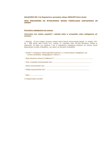 ZAŁĄCZNIK NR 2 do Regulaminu sprzedaży sklepu NESCAFÉ Dolce Gusto OPIS WSKAZÓWEK DO WYPEŁNIENIA WZORU FORMULARZA ODSTĄPIENIA OD UMOWY Formularz odstąpienia od umowy (formularz ten należy wypełnić i odesłać tylko w przypadku chęci odstąpienia od umowy) - Adresat: W tym miejscu prosimy wpisać adres Serwis Konsumenta Nestle, ul. Łódzka 153, 62 – 800 Kalisz albo Cursor S.A., Łubna, ul. Łubińska 10a; 05-532 Baniocha, Polska w zależności od tego, czy zgodnie z par 6 regulaminu odstępują Państwo od umowy przed dokonaniem zwrotu Produktów, czy razem ze zwrotem Produktów - Ja/My(*) niniejszym informuję/informujemy(*) o moim/naszym odstąpieniu od: - umowy sprzedaży następujących rzeczy(*) - Data zawarcia umowy(*)/odbioru(*) : ……………………………………………………………………………… - Imię i nazwisko konsumenta(-ów) : ……………………………………………………………………………… - Adres konsumenta(-ów) : ………………………………………………………………………………………… - Podpis konsumenta(-ów) : ……………………………………………………………………………………….. - Data : ……………………….. (*)niepotrzebne skreślić