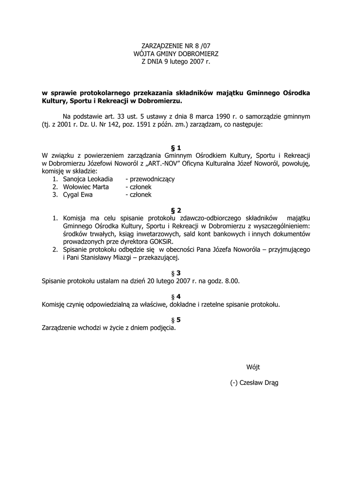 ZARZĄDZENIE NR 8 /07 WÓJTA GMINY DOBROMIERZ Z DNIA 9 lutego 2007 r. w sprawie protokolarnego przekazania składników majątku Gminnego Ośrodka Kultury, Sportu i Rekreacji w Dobromierzu. Na podstawie art. 33 ust. 5 ustawy z dnia 8 marca 1990 r. o samorządzie gminnym (tj. z 2001 r. Dz. U. Nr 142, poz. 1591 z późn. zm.) zarządzam, co następuje: §1 W związku z powierzeniem zarządzania Gminnym Ośrodkiem Kultury, Sportu i Rekreacji w Dobromierzu Józefowi Noworól z „ART.-NOV” Oficyna Kulturalna Józef Noworól, powołuję, komisję w składzie: 1. Sanojca Leokadia - przewodniczący 2. Wołowiec Marta - członek 3. Cygal Ewa - członek §2 1. Komisja ma celu spisanie protokołu zdawczo-odbiorczego składników majątku Gminnego Ośrodka Kultury, Sportu i Rekreacji w Dobromierzu z wyszczególnieniem: środków trwałych, ksiąg inwetarzowych, sald kont bankowych i innych dokumentów prowadzonych prze dyrektora GOKSiR. 2. Spisanie protokołu odbędzie się w obecności Pana Józefa Noworóla – przyjmującego i Pani Stanisławy Miazgi – przekazującej. §3 Spisanie protokołu ustalam na dzień 20 lutego 2007 r. na godz. 8.00. §4 Komisję czynię odpowiedzialną za właściwe, dokładne i rzetelne spisanie protokołu. §5 Zarządzenie wchodzi w życie z dniem podjęcia. Wójt (-) Czesław Drąg