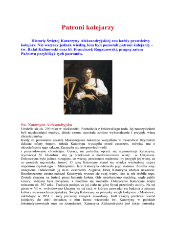 Patroni kolejarzy Historię Świętej Katarzyny Aleksandryjskiej zna kaŜdy prawdziwy kolejarz. Nie wszyscy jednak wiedzą, kim byli pozostali patroni kolejarzy – św. Rafał Kalinowski oraz bł. Franciszek Rogaczewski, pragnę zatem Państwu przybliŜyć tych patronów. Św. Katarzyna Aleksandryjska Urodziła się ok. 290 roku w Aleksandrii. Pochodziła z królewskiego rodu. Jej nauczycielami byli najsławniejsi mędrcy, dzięki czemu uzyskała solidne wykształcenie i przyjęła wiarę chrześcijańską. Kiedy za panowania cesarza Maksencjusza nakazano wszystkim w Cesarstwie Rzymskim składać ofiary bogom, młoda Katarzyna wystąpiła przed cesarzem, mówiąc mu o okrucieństwie tego nakazu. Zarzuciła mu niesprawiedliwość i prześladowanie chrześcijan. Cesarz, nie potrafiąc oprzeć się argumentacji Katarzyny, wyznaczył 50 filozofów, aby ją przekonali o niedorzeczności wiary w Chrystusa. Dziewczyna była jednak nieugięta, co więcej, przekonała mędrców, by przyjęli jej wiarę, za co ponieśli męczeńską śmierć. O rękę Katarzyny starał się władca wschodniej części imperium rzymskiego – Maksymian, lecz Katarzyna odrzuciła jego starania. Została więc uwięziona. Odwiedzała ją m.in. cesarzowa Augusta, którą Katarzyna zdołała nawrócić. Rozzłoszczony cesarz nakazał Katarzynie wyrzec się swej wiary, lecz ta nie zrobiła tego. Została skazana na śmierć przez łamanie kołem. Gdy uruchamiano machinę, nagle pękły sznury, którymi była związana, a machina się rozpadła. Ostatecznie Katarzynę ścięto mieczem ok. 307 roku. Tradycja podaje, Ŝe jej ciało na górę Synaj przeniosły anioły. Na tej górze w VI w. wybudowano klasztor ku jej czci, w którym prowadzi się badania z zakresu kultury wczesnochrześcijańskiej. Świętą Katarzynę za patronkę wzięli kolejarze z Mysłowic, zakładając w 1851 r. swój pierwszy związek zawodowy. Kult świętej przetrwał wśród kolejarzy do dziś: świadczą o nim liczne wizerunki św. Katarzyny w polskich lokomotywowniach oraz na sztandarach. Katarzyna Aleksandryjska jest takŜe patronką: adwokatów, filozofów, kołodziejów, młynarzy, modystek, mówców, literatów, przewoźników, prządek, stowarzyszeń literackich, studentów, szwaczek, uczonych, woźniców, zecerów i prostego ludu. W ikonografii przedstawiana jest jako dziewczyna z koroną na głowie, mieczem, ksiąŜką, palmą albo podtrzymująca koło z ostrymi hakami, słuŜące do torturowania. Jej święto patronalne przypada 25 listopada, wtedy teŜ – od 1991 r. – kolejarze mają swój dzień. W tym roku przypada 1700-lecie śmierci patronki kolejarzy. W związku z tym jej relikwie są obwoŜone po miejscach kultu św. Katarzyny, m.in. w Polsce. ……………………………………………………………………………………. Św. Rafał Kalinowski Rafał (a właściwie Józef, bo takie imię otrzymał na chrzcie) Kalinowski urodził się w Wilnie 1 września 1835 roku. Studiował w Instytucie Szlacheckim w Wilnie, a później na Akademii InŜynierii Wojskowej w Petersburgu, gdzie uzyskał tytuł inŜyniera i stopień porucznika. Po ukończeniu studiów mianowano go asystentem matematyki w tejŜe Akademii. W 1859 r. współpracował w projektowaniu linii kolejowej Kursk – Kijów – Odessa. W 1863 r., po wybuchu powstania styczniowego, zwolnił się z wojska rosyjskiego i pełnił funkcję ministra wojny w rejonie Wilna. Aresztowany 24 marca 1864 r., został skazany na karę śmierci, którą zamieniono na 10 lat przymusowych prac na Syberii. W Usolu Syberyjskim przeŜył nawrócenie. Tu zrodziło się jego powołanie kapłańskie i zakonne. Z wygnania powrócił w 1874 r. i został wychowawcą Augusta Czartoryskiego w ParyŜu. Trzy lata później wstąpił do zakonu karmelitów bosych w Grazu w Austrii i przyjął imię zakonne brata Rafała od św. Józefa. Po złoŜeniu ślubów zakonnych studiował teologię na Węgrzech, a święcenia kapłańskie otrzymał w Czernej koło Krakowa 15 stycznia 1882 roku. Zmarł 15 listopada 1907 r., w klasztorze w Wadowicach, który załoŜył i którego był wtedy przeorem. Został pochowany na cmentarzu klasztornym w Czernej. Za Ŝycia i po śmierci cieszył się sławą świętości, zarówno wśród zwykłych ludzi, jak i kardynałów. PapieŜ 22 czerwca 1983 r. w Krakowie beatyfikował Rafała Kalinowskiego, a 17 listopada 1991 r. w Rzymie zaliczył go w poczet świętych. Święto patronalne św. Rafała Kalinowskiego obchodzone jest 20 listopada. ……………………………………………………………………………………. Bł. Franciszek Rogaczewski Franciszek Rogaczewski urodził się 23 grudnia 1892 r. w Lipinkach w licznej rodzinie mistrza rzeźnickiego Leonarda i Anny z Laskowskich. Od 1894 r. wychowywał się w Lubichowie, dokąd rodzina wyprowadziła się. Kształcił się w Collegium Marianum w Pelplinie oraz w gimnazjum w Chełmnie. Po studiach w Seminarium Duchownym w Pelplinie 16 marca 1918 r. otrzymał święcenia kapłańskie. Był proboszczem polskiej parafii pw. Chrystusa Króla w Gdańsku i wyjątkowym spowiednikiem, a jednocześnie kapelanem kolejarzy w Wolnym Mieście Gdańsk i diecezji toruńskiej. 1 września 1939 r. został aresztowany, po długich torturach rozstrzelano go 11 stycznia 1940 r. w pobliŜu Gdańska. 13 czerwca 1999 roku w Warszawie Jan Paweł II dokonał beatyfikacji 108 polskich męczenników z czasów II wojny światowej, jednym z nich był sługa boŜy ks. Franciszek Rogaczewski. KURIER PKP 47/25.11.2007 ŚWIĘTO KOLEJARZA W Święto Kolejarza warto pamiętać o tradycji tej słuŜby, ale to teŜ dobry czas, by zastanowić się nad przyszłością kolejarskiego fachu. Kogo dziś potrzebuje polska kolej? 0 Opracowała: mgr Zdzisława Małkiewicz ZM ZZA PKP w Katowicach