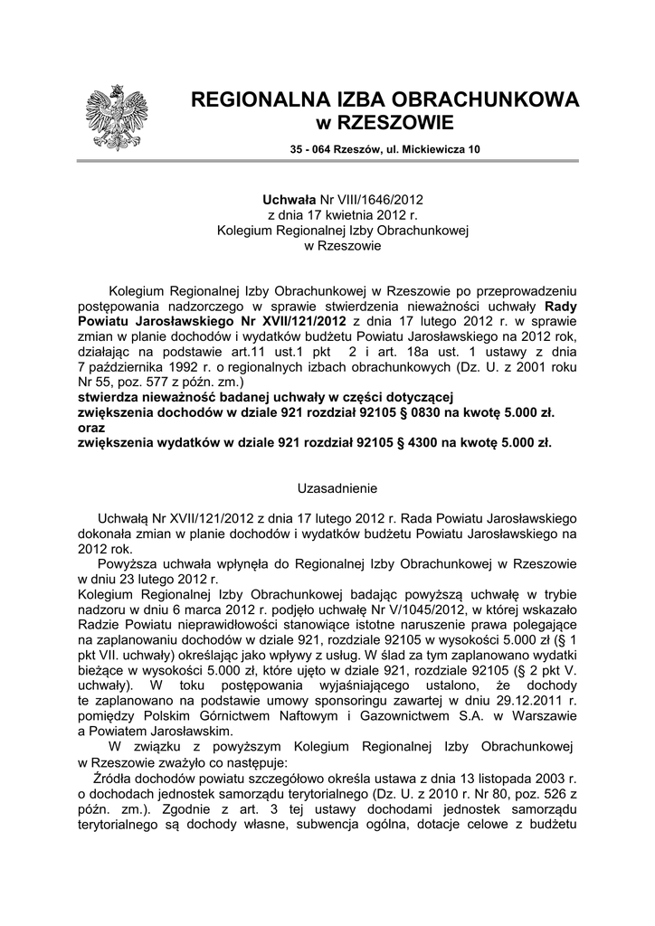 Uchwała nr VIII/1646/2012 - Regionalna Izba Obrachunkowa w