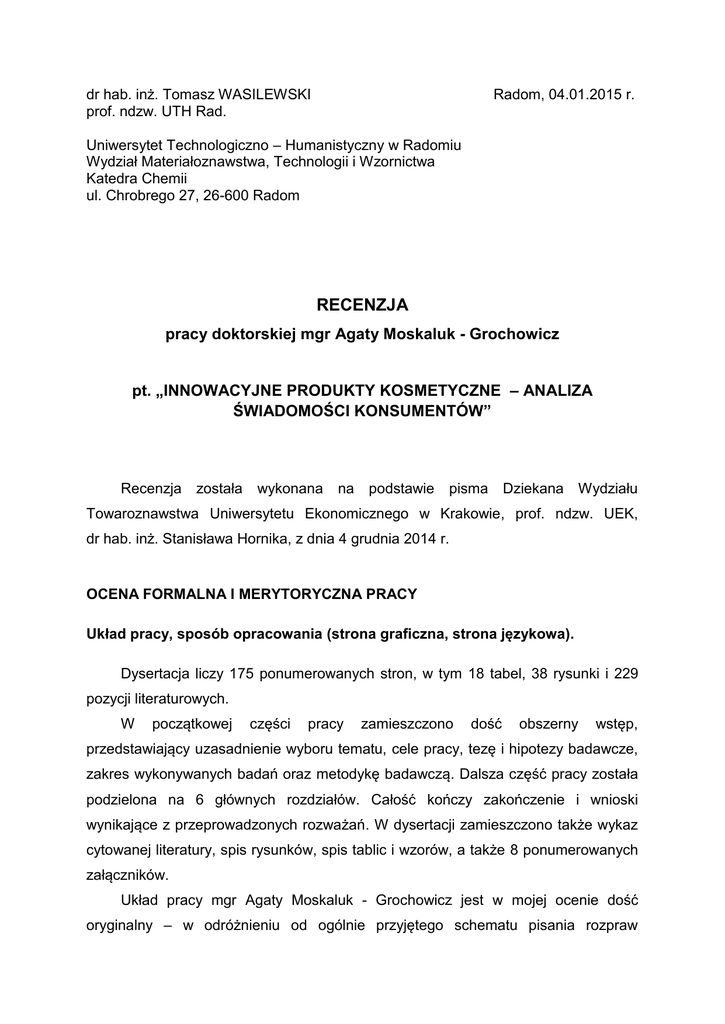 dr hab. inż. Tomasz WASILEWSKI prof. ndzw. UTH Rad. Radom, 04.01.2015 r. Uniwersytet Technologiczno – Humanistyczny w Radomiu Wydział Materiałoznawstwa, Technologii i Wzornictwa Katedra Chemii ul. Chrobrego 27, 26-600 Radom RECENZJA pracy doktorskiej mgr Agaty Moskaluk - Grochowicz pt. „INNOWACYJNE PRODUKTY KOSMETYCZNE – ANALIZA ŚWIADOMOŚCI KONSUMENTÓW” Recenzja została wykonana na podstawie pisma Dziekana Wydziału Towaroznawstwa Uniwersytetu Ekonomicznego w Krakowie, prof. ndzw. UEK, dr hab. inż. Stanisława Hornika, z dnia 4 grudnia 2014 r. OCENA FORMALNA I MERYTORYCZNA PRACY Układ pracy, sposób opracowania (strona graficzna, strona językowa). Dysertacja liczy 175 ponumerowanych stron, w tym 18 tabel, 38 rysunki i 229 pozycji literaturowych. W początkowej części pracy zamieszczono dość obszerny wstęp, przedstawiający uzasadnienie wyboru tematu, cele pracy, tezę i hipotezy badawcze, zakres wykonywanych badań oraz metodykę badawczą. Dalsza część pracy została podzielona na 6 głównych rozdziałów. Całość kończy zakończenie i wnioski wynikające z przeprowadzonych rozważań. W dysertacji zamieszczono także wykaz cytowanej literatury, spis rysunków, spis tablic i wzorów, a także 8 ponumerowanych załączników. Układ pracy mgr Agaty Moskaluk - Grochowicz jest w mojej ocenie dość oryginalny – w odróżnieniu od ogólnie przyjętego schematu pisania rozpraw doktorskich, w przedmiotowej dysertacji nie wyodrębniono wyraźnie części poświęconych na badania literaturowe oraz na badania empiryczne. Część rozdziałów, stanowiących zasadniczą część pracy, posiada charakter przeglądu literaturowego (Rozdz. 1 i 2). Dwa kolejne rozdziały (Rozdz. 3 i 4) prezentują badania prowadzone przez Autorkę – zawarto w nich zarówno opis metodyki badawczej jak i rezultaty badań z ich dyskusją. Z kolei, ostatnie dwa rozdziały (Rozdz. 5 i 6) zawierają zarówno typowy przegląd literatury fachowej jak i rezultaty badań własnych. Rozdziały, w których przedstawiono wyniki badań empirycznych, w niewielkim stopniu korespondują ze sobą – stanowią one raczej zbiór opracowań na różne tematy, przynależące jednak do obszaru tematycznego dysertacji. W mojej ocenie, układ pracy raczej przypomina pracę habilitacyjną a nie rozprawę doktorską. Biorąc pod uwagę układ pracy, chciałbym zwrócić uwagę na kilka aspektów, które mogłyby być w większym stopniu dopracowane w niniejszej rozprawie. Jest to istotne szczególnie w kontekście dalszej pracy naukowej Doktorantki. Zgodnie z zapisami przedstawionymi w Art.13 ust.1 Ustawy z dnia 14 marca 2003 r. (Dz.U. 2003 r., nr 65, poz. 595 z późn. zm.) o stopniach naukowych i tytule naukowym oraz o stopniach i tytule w zakresie sztuki, rozprawa doktorska powinna stanowić oryginalne rozwiązanie problemu badawczego. Wydaje się, że najdogodniejszym (z punktu widzenia przejrzystości pracy i łatwości przyswajania rezultatów pracy) byłoby wyraźne przedstawienie co stanowi problem badawczy oraz w jaki sposób Autorka ten problem rozwiązywała. O ile nie mam zastrzeżeń co do sposobu przedstawienia problemu badawczego (jest on w jasny sposób opisany we Wstępie), to zamieszczenie procedury badawczej w różnych miejscach pracy niepotrzebnie wprowadza zamieszanie i w pewnym stopniu utrudnia lekturę rozprawy. Uważam, że czytelne przedstawienie sposobu prowadzenia doświadczenia jest niezmiernie ważne i w pewnym stopniu świadczy o umiejętności prowadzenia badan naukowych przez ocenianą osobę. Druga uwaga jest związana z umiejscowieniem w rozprawie hipotez i celi pracy. W mojej ocenie, korzystniejsze jest ich przedstawianie dopiero po części literaturowej - umożliwia to czytelnikowi zapoznanie się z obecnym stanem wiedzy w zakresie przedmiotowego tematu, przyswojenie specyficznych sformułowań i określeń umożliwiających dokładne zrozumienie tematu, a następnie skonfrontowanie przemyśleń Autora Dysertacji z rezultatami już opublikowanych badań. Ponadto, przedstawienie celi i hipotez na tle innych doniesień literaturowych z tego zakresu 2 pozwala czytelnikowi na wstępną ocenę ważkości sformułowanego w pracy problemu badawczego. Nie mniej jednak, jest to sprawa dyskusyjna – w szeregu innych prac spotkałem się z konstrukcją prac analogiczną do dysertacji mgr Agaty Moskaluk - Grochowicz i rozwiązanie przyjęte w przedmiotowej pracy w pełni akceptuję. Strona graficzna recenzowanej dysertacji jest poprawna. Wykresy i tabele są czytelne. Strona językowa pracy jest także poprawna, chociaż Autorka nie ustrzegła się pewnych niedociągnięć (szczegółowe uwagi zostaną przedstawione w dalszej części recenzji). Usterki językowe nie mają większego wpływu na przyswajanie treści rozprawy. W recenzowanej pracy brak jest streszczenia w języku angielskim – jest to wymóg formalny zapisany w Art.13 ust. 6 cytowanej powyżej Ustawy. Podsumowując ten fragment recenzji uważam, że praca jest napisana w zrozumiały, czytelny i oczywiście możliwy do zaakceptowania sposób. Poza opisanymi powyżej uwagami i zaleceniami, nie mam większych zastrzeżeń co do sposobu opracowania i przygotowania dysertacji. Aktualność tematyki, tytuł, cel pracy, hipotezy badawcze W ostatnich kilkudziesięciu latach przemysł kosmetyczny uległ bardzo gwałtownemu rozwojowi. Związane jest to głównie z nieustannie rosnącymi wymaganiami konsumentów oraz olbrzymią konkurencją na rynku produktów przeznaczonych do higieny, pielęgnacji, upiększania, ochrony czy też perfumowania ciała. Czynniki te wymagają od producentów kosmetyków nieustannego rozwoju produktów i konieczność poszukiwania nowych rozwiązań. Wytwarzanie nowych, innowacyjnych preparatów związane jest najczęściej z wprowadzaniem do ich składu nowoczesnych komponentów, wykorzystywaniem naturalnych surowców lub substancji pozyskiwanych na drodze biotechnologii, opracowywaniem nowych fo
