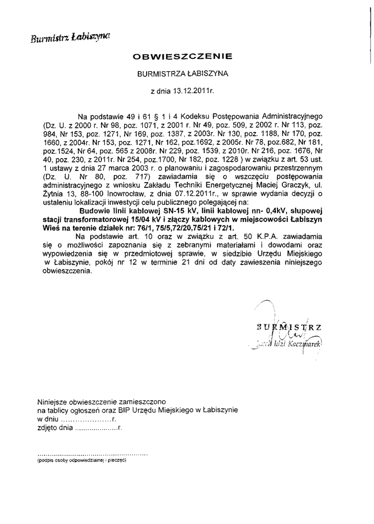 Burmistrz Łabisfffna OBWIESZCZENIE BURMISTRZA ŁABISZYNA zdnia13.12.2011r. Na podstawie 49 i 61 § 1 i 4 Kodeksu Postępowania Administracyjnego (Dz. U. z 2000 r. Nr 98, póz. 1071, z 2001 r. Nr 49, póz. 509, z 2002 r. Nr 113, póz. 984, Nr 153, póz. 1271, Nr 169, póz. 1387, z 2003r. Nr 130, póz. 1188, Nr 170, póz. 1660, z2004r. Nr 153, póz. 1271, Nr 162, poz.1692, z 2005r. Nr78, poz.682, Nr 181, poz.1524, Nr 64, póz. 565 z 2008r. Nr 229, póz. 1539, z 2010r. Nr 216, póz. 1676, Nr 40, póz. 230, z 2011 r. Nr 254, poz.1700, Nr 182, póz. 1228 ) w związku żart. 53 ust. 1 ustawy z dnia 27 marca 2003 r. o planowaniu i zagospodarowaniu przestrzennym (Dz. U. Nr 80, póz. 717) zawiadamia się o wszczęciu postępowania administracyjnego z wniosku Zakładu Techniki Energetycznej Maciej Graczyk, ul. Żytnia 13, 88-100 Inowrocław, z dnia 07.12.2011r., w sprawie wydania decyzji o ustaleniu lokalizacji inwestycji celu publicznego polegającej na: Budowie linii kablowej SN-15 kV, linii kablowej nn- 0,4kV, słupowej stacji transformatorowej 15/04 kV i złączy kablowych w miejscowości Łabiszyn Wieś na terenie działek nr: 76/1, 75/5,72/20,75/21 i 72/1. Na podstawie art. 10 oraz w związku z art. 50 K.P.A. zawiadamia się o możliwości zapoznania się z zebranymi materiałami i dowodami oraz wypowiedzenia się w przedmiotowej sprawie, w siedzibie Urzędu Miejskiego w Łabiszynie, pokój nr 12 w terminie 21 dni od daty zawieszenia niniejszego obwieszczenia. _ ,/ "i Idzi Kaczijtmreb Niniejsze obwieszczenie zamieszczono na tablicy ogłoszeń oraz BIP Urzędu Miejskiego w Łabiszynie w dniu r. zdjęto dnia r. (podpis osoby odpowiedzialnej i pieczęć)