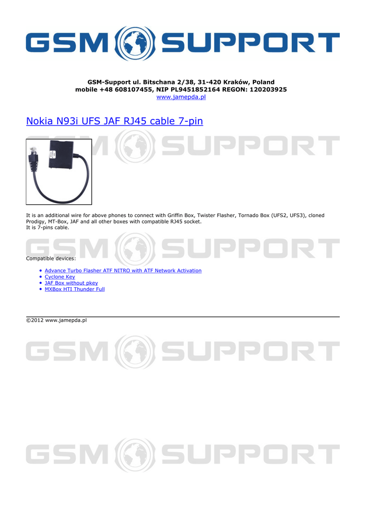GSM-Support ul. Bitschana 2/38, 31-420 Kraków, Poland mobile +48 608107455, NIP PL9451852164 REGON: 120203925 www.jamepda.pl Nokia N93i UFS JAF RJ45 cable 7-pin It is an additional wire for above phones to connect with Griffin Box, Twister Flasher, Tornado Box (UFS2, UFS3), cloned Prodigy, MT-Box, JAF and all other boxes with compatible RJ45 socket. It is 7-pins cable. Compatible devices: Advance Turbo Flasher ATF NITRO with ATF Network Activation Cyclone Key JAF Box without pkey MXBox HTI Thunder Full ©2012 www.jamepda.pl Powered by TCPDF (www.tcpdf.org)