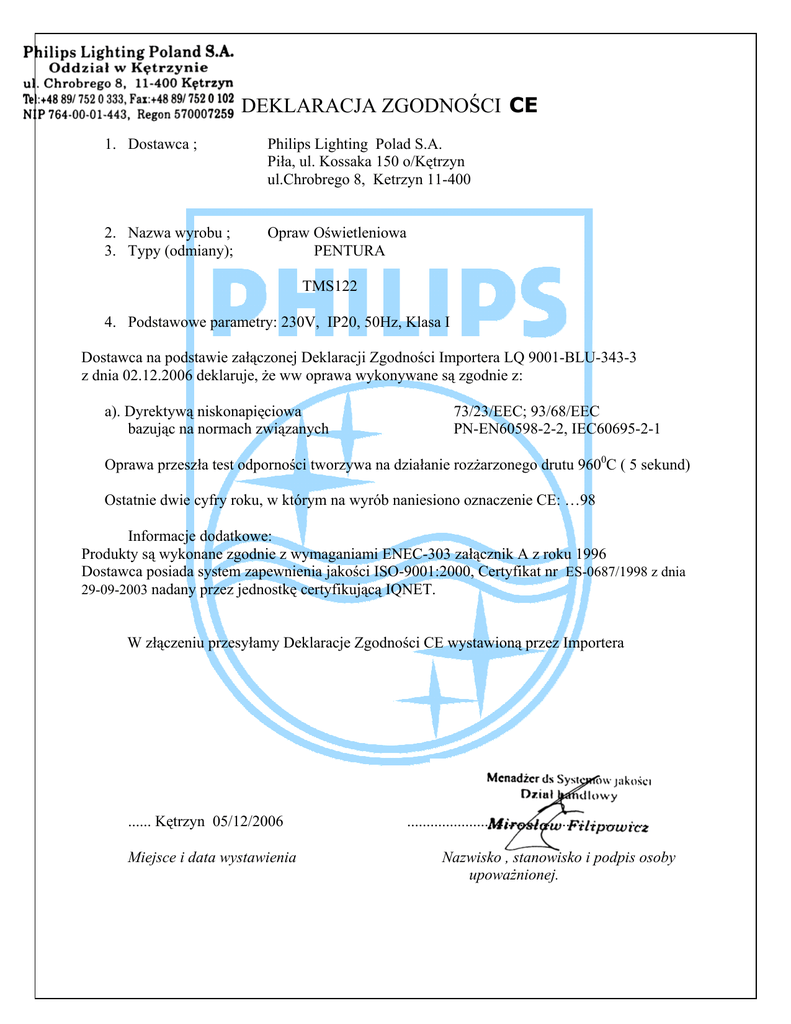 DEKLARACJA ZGODNOŚCI CE 1. Dostawca ; Philips Lighting Polad S.A. Piła, ul. Kossaka 150 o/Kętrzyn ul.Chrobrego 8, Ketrzyn 11-400 2. Nazwa wyrobu ; 3. Typy (odmiany); Opraw Oświetleniowa PENTURA TMS122 4. Podstawowe parametry: 230V, IP20, 50Hz, Klasa I Dostawca na podstawie załączonej Deklaracji Zgodności Importera LQ 9001-BLU-343-3 z dnia 02.12.2006 deklaruje, że ww oprawa wykonywane są zgodnie z: a). Dyrektywą niskonapięciowa bazując na normach związanych 73/23/EEC; 93/68/EEC PN-EN60598-2-2, IEC60695-2-1 Oprawa przeszła test odporności tworzywa na działanie rozżarzonego drutu 9600C ( 5 sekund) Ostatnie dwie cyfry roku, w którym na wyrób naniesiono oznaczenie CE: …98 Informacje dodatkowe: Produkty są wykonane zgodnie z wymaganiami ENEC-303 załącznik A z roku 1996 Dostawca posiada system zapewnienia jakości ISO-9001:2000, Certyfikat nr ES-0687/1998 z dnia 29-09-2003 nadany przez jednostkę certyfikującą IQNET. W złączeniu przesyłamy Deklaracje Zgodności CE wystawioną przez Importera ...... Kętrzyn 05/12/2006 Miejsce i data wystawienia .............................................................. Nazwisko , stanowisko i podpis osoby upoważnionej.
