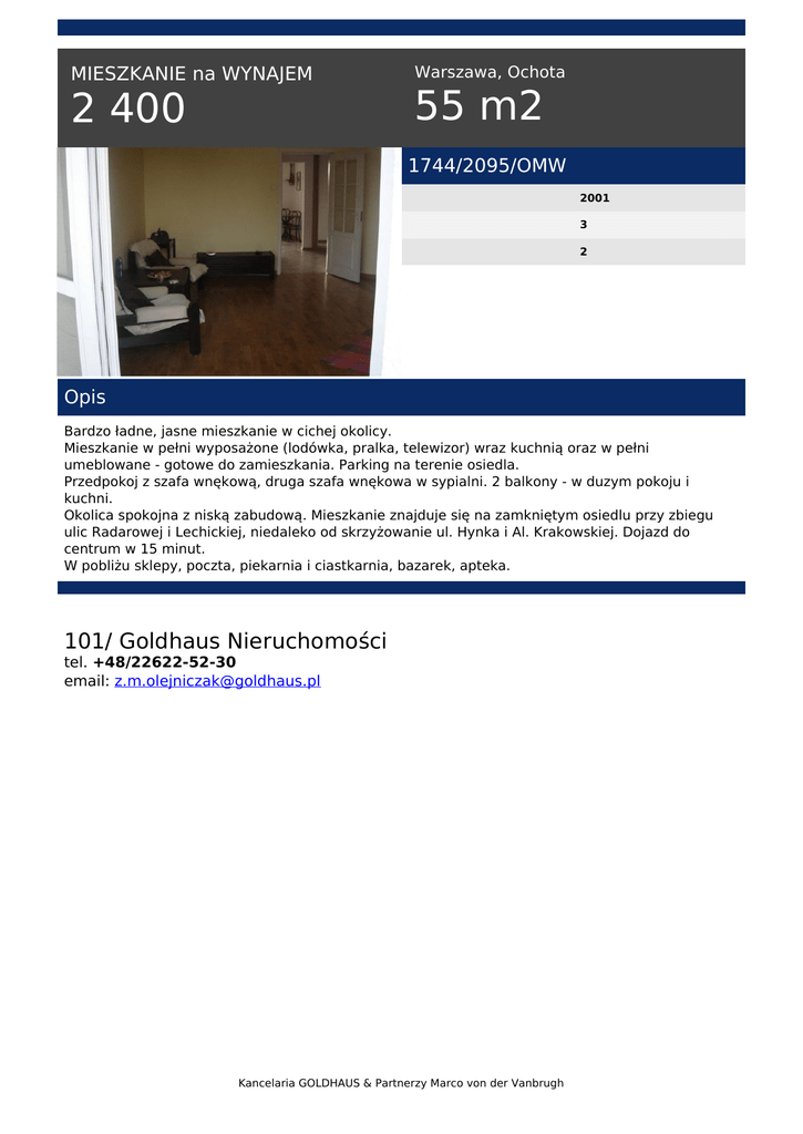 MIESZKANIE na WYNAJEM 2 400 Warszawa, Ochota 55 m2 1744/2095/OMW 2001 3 2 Opis Bardzo ładne, jasne mieszkanie w cichej okolicy. Mieszkanie w pełni wyposażone (lodówka, pralka, telewizor) wraz kuchnią oraz w pełni umeblowane - gotowe do zamieszkania. Parking na terenie osiedla. Przedpokoj z szafa wnękową, druga szafa wnękowa w sypialni. 2 balkony - w duzym pokoju i kuchni. Okolica spokojna z niską zabudową. Mieszkanie znajduje się na zamkniętym osiedlu przy zbiegu ulic Radarowej i Lechickiej, niedaleko od skrzyżowanie ul. Hynka i Al. Krakowskiej. Dojazd do centrum w 15 minut. W pobliżu sklepy, poczta, piekarnia i ciastkarnia, bazarek, apteka. 101/ Goldhaus Nieruchomości tel. +48/22622-52-30 email: [email protected] Kancelaria GOLDHAUS & Partnerzy Marco von der Vanbrugh Powered by TCPDF (www.tcpdf.org)