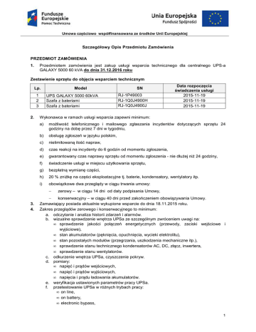 Umowa częściowo współfinansowana ze środków Unii Europejskiej Szczegółowy Opis Przedmiotu Zamówienia PRZEDMIOT ZAMÓWIENIA 1. Przedmiotem zamówienia jest zakup usługi wsparcia technicznego dla centralnego UPS-a GALAXY 5000 60 kVA do dnia 31.12.2016 roku Zestawienie sprzętu do objęcia wsparciem technicznym Lp. 1 2 3 2. Model UPS GALAXY 5000 60kVA Szafa z bateriami Szafa z bateriami RJ-1P49003 RJ-1Q0J4900H RJ-1Q0J4900J Data rozpoczęcia świadczenia usługi 2015-11-19 2015-11-19 2015-11-19 Wykonawca w ramach usługi wsparcia zapewni minimum: a) możliwość telefonicznego i mailowego zgłaszania incydentów dotyczących sprzętu 24 godziny na dobę przez 7 dni w tygodniu, b) obsługę zgłoszeń w języku polskim, c) nielimitowaną ilość napraw, d) czas reakcji na incydenty do 6 godzin od momentu zgłoszenia, e) gwarantowany czas naprawy sprzętu od momentu zgłoszenia - nie dłużej niż 24 godziny, f) świadczenie usługi w miejscu użytkowania sprzętu, g) bezpłatną wymianę części, h) 20 % zniżkę na części eksploatacyjne tj. baterie, kondensatory, wentylatory itp. i) obowiązkowe dwa przeglądy w ciągu trwania umowy: − 3. 4. SN zerowy – w ciągu 14 dni od daty podpisania Umowy, − konserwacyjny – w ciągu 40 dni przed zakończeniem obowiązywania Umowy. Zamawiający posiada aktualnie wykupione wsparcie do dnia 18.11.2015 roku. Zakres przeglądów zerowego i konserwacyjnego to minimum: a. odczytanie i analiza historii zdarzeń i alarmów. b. wizualne sprawdzenie wnętrza UPSa ze szczególnym zwróceniem uwagi na: • sprawdzenie jakości połączeń energetycznych (przewody, zaciski wejściowe i wyjściowe), • stan akumulatorów (pęknięcia, opuchnięcia, wycieki elektrolitu), • stan pozostałych modułów (przegrzania, uszkodzenia mechaniczne itp.), • sprawdzenie stanu technicznego kondensatorów AC, DC, złącz, inwertera, • sprawdzenie stanu wentylatorów. c. odkurzenie wnętrza UPSa, czyszczenie pokryw. d. pomiary: • napięć i prądów wejściowych, • napięć i prądów wyjściowych, • napięcia i prądu ładowania akumulatorów. e. weryfikacja ustawionych parametrów pracy UPSa. f. przetestowanie UPSa w różnych trybach pracy: • on line, • on battery, • electronic bypass, 1 Umowa częściowo współfinansowana ze środków Unii Europejskiej g. h. i. j. • manual bypass. test akumulatorów (pomiary parametrów baterii oraz przełączenie na pracę bateryjną). test bypassu zewnętrznego. test wyłącznika p.poż (za zgodą klienta). ponowne uruchomienie UPSa. W czasie przeglądu zasilacz pozostaje na bypassie konserwacyjnym (przełączenie odbywa się bez zaniku napięcia, a w czasie przeglądu odbiorniki pozostają na napięciu sieci). Po wykonaniu usługi należy dostarczyć szczegółowy Raport Serwisowy z wykonanych prac, wraz z ewentualnymi zaleceniami co do dalszego postepowania z jednostką. TERMIN REALIZACJI ZAMÓWIENIA 1. W terminie 14 dni od dnia podpisania Umowy Wykonawca przekaże Zamawiającemu dokument potwierdzający nabycie praw do korzystania z usług wsparcia technicznego dla sprzętu wymienionego w tabeli. 2. Płatności za w/w usługi będą realizowane w 4 równych ratach po uprzednim odbiorze zakończonego okresu świadczenia usługi potwierdzonego podpisanym przez Zamawiającego bez zastrzeżeń protokole odbioru usług: 2