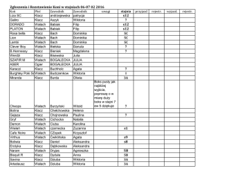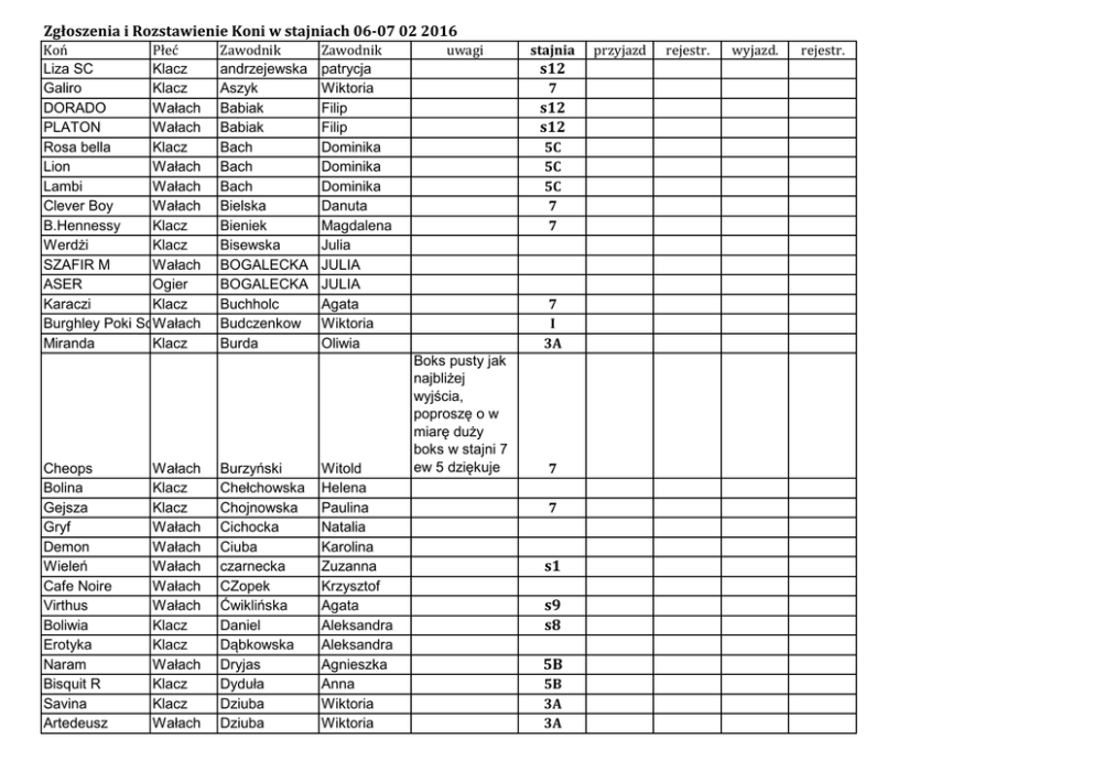 Zgłoszenia i Rozstawienie Koni w stajniach 06-07 02 2016 Koń Płeć Liza SC Klacz Galiro Klacz DORADO Wałach PLATON Wałach Rosa bella Klacz Lion Wałach Lambi Wałach Clever Boy Wałach B.Hennessy Klacz Werdżi Klacz SZAFIR M Wałach ASER Ogier Karaczi Klacz Burghley Poki Son W ałach Miranda Klacz Cheops Bolina Gejsza Gryf Demon Wieleń Cafe Noire Virthus Boliwia Erotyka Naram Bisquit R Savina Artedeusz Wałach Klacz Klacz Wałach Wałach Wałach Wałach Wałach Klacz Klacz Wałach Klacz Klacz Wałach Zawodnik andrzejewska Aszyk Babiak Babiak Bach Bach Bach Bielska Bieniek Bisewska BOGALECKA BOGALECKA Buchholc Budczenkow Burda Burzyński Chełchowska Chojnowska Cichocka Ciuba czarnecka CZopek Ćwiklińska Daniel Dąbkowska Dryjas Dyduła Dziuba Dziuba Zawodnik patrycja Wiktoria Filip Filip Dominika Dominika Dominika Danuta Magdalena Julia JULIA JULIA Agata Wiktoria Oliwia Witold Helena Paulina Natalia Karolina Zuzanna Krzysztof Agata Aleksandra Aleksandra Agnieszka Anna Wiktoria Wiktoria uwagi stajnia s12 7 s12 s12 5C 5C 5C 7 7 7 I 3A Boks pusty jak najbliżej wyjścia, poproszę o w miarę duży boks w stajni 7 ew 5 dziękuje 7 7 s1 s9 s8 5B 5B 3A 3A przyjazd rejestr. wyjazd. rejestr. flommy fly Wałach Lucky Comeback2 W ałach Gracja Klacz Zamelus W Ogier Cadoro Ogier Chuck Chin L.E Wałach Gordon Wałach Brylant Wałach Etos po santiego Ogier pipin Wałach Iron Wałach Lucky Look Wałach Ballantines Wałach Integro Wałach Ferra Klacz Doravella Klacz ZET- ZADLO Wałach Czako Wałach Arnika Klacz Kilimanjaro TS Ogier Tafla Klacz Era L Klacz Belcanto Wałach Bielik Wałach KOKAINA Klacz Senator Cassini Wałach Magnus Wałach Sweet Surprise Klacz Carmen LG Klacz Oktawa Klacz Dr Doolittle 32 Wałach Amorado Ogier CALA MILLOR Wałach Cyklon Wałach casanova Ogier kometa Klacz Szałwia Klacz elbl anna Elzanowska Julia Endraszka Paulina Endraszka Paulina Eron Krzysztof Gilla Błażej Gilla Błażej Głowacka Ewa golicka zuzanna golicka zuzanna Golisz Waldemar Golisz Waldemar Gromadzki Paweł Gryglewicz Anna Grzywacz Jacek Grzywacz Jacek Grzywacz Jacek Hadrysiak Anna Halama Aleksandra Jachlewska Katarzyna Jakubek Julia Joppek Marcin Joppek Marcin Kaczor Rafał KACZOROWSKA NATALIA Kałabun Jan Karlsson Julia Kazana Jagoda Kierznikiewicz Patrycja Klebba Natalia Klebba Natalia Kopeć Anna Kopeć Anna Kot Milena Kowalczyk Alicja Kropidłowska Monika Kropidłowska Marta s2 5B 7 7 5B 5B 3B 3B 5C s12 s12 s12 s12 7 s13 s13 s12 7 s9 5B J J s12 7 Calida Santhos 9 Leonardo Aurelian Kaktus Mantus Tulipan BY THE WAY CENTILLE S CEVILLA S Monsignore I Oskar Celit Nikifor boniek denzel son reasy easy Persja D Marco Maritza Lucky Lucka Kamerun Cannes La Crouse Cypr Panta Rhei Czardżil Pavius Linton SANTI Chram Brioni Kasthalia Windhayes Le Cou Cou Cristiano Westa Klacz Wałach Wałach Wałach Wałach Wałach Wałach Ogier Wałach Klacz Wałach Wałach Wałach Wałach Wałach Wałach Klacz Klacz Wałach Klacz Klacz Ogier Wałach Wałach Wałach Wałach Ogier Ogier Ogier Wałach Wałach Wałach Klacz Wałach Klacz Ogier Klacz Krupska Anna Kulczycka Joanna Laskowska Emilia Ledzion Marta Lost Dorota Lost Dorota Lost Dorota Łukasiak Zuzanna Łukasiak Zuzanna Łukasiak Zuzanna Macholla Aleksandra Masłowska-Szudrowicz Monika Miąskowska Zofia Milewska Julia Nicpoń Adam Nicpoń Adam Nicpoń Adam Ohler Natalia Orlowska Marta Orłowski Marcin Pańka Weronika Pastwa Tomasz Pawlak Leszek Pawlak Leszek Pawlik Agnieszka Pawlik Agnieszka Pellowki Janusz Pieniaszek Dominik Pieniaszek Diego Pokusa Agnieszka Polikowski Jacek Polikowski Jacek Południewska Aleksandra Pospieszna Sylwia Psiuk Grzegorrz Psiuk Grzegorz Psiuk Grzegorz s12 5A 5A 5A 7 s5 s13 5C 5C s13 s13 7 3A 3A s8 J J J hiden dream Wałach dux day Wałach celesto Wałach Donhuan Wałach Chiron Wałach Calhedron Wałach Chery Gold D Ogier Colado Wałach Robespierre Wałach Chingis Chan Wałach Rambo Wałach Kaktus Wałach Lubomir Wałach Tora Klacz Kania For Pleasure Klacz Montezuma Klacz Barrichello Wałach Ambra Klacz Bohun Wałach Gal Wałach Romeo Wałach Wiwa Klacz Dragon Wałach Dartago Z Ogier Paolla S Klacz Concord de Coeur Wałach Dilmar Ogier Dolce Vita Klacz Pillkallen HavbekKlacz Baltazar du RouetW ałach Ravella Klacz Lauderdale Ogier Racka Agnieszka Racka Agnieszka Racka Agnieszka Ramczyk Emilia S13 Rąbca Agnieszka s13 Rąbca Agnieszka s13 Rezmer Wiktoria 7 Rozbicka Ewa Rozbicka Rudasz Włodzimierz 7 Rudasz Włodzimierz 7 s13 Rudnicka Weronika Rzońca Zuzanna Skrzypek Patrycja 3A Smolarska Roksana Sosnowska Jesika STOLARSKA MAJA s13 Suminska Ewa 5A Szczeluszczenko Izabela zglaszalam na mail przyjazd s11 z koniem 01.02-07.02 Szczepankowska Aleksnadra Szymańska Barbara Tomporowski Marcin Wanta Alicja Wasiołek Daria 7 Włodarski Bartłomiej 5A Włodarski Bartłomiej 5A Wojcik-MatelskaRenata J Wojcik-MatelskaRenata J Wostal Natasza Wróblewski Bogdan J Żołądkiewicz Maciej s8 Żygowska Zuzanna Żygowska Zuzanna Zgłoszenia i Rozstawienie Koni w stajniach 06-07 02 2016 Koń Płeć Liza SC Klacz Galiro Klacz DORADO Wałach PLATON Wałach Rosa bella Klacz Lion Wałach Lambi Wałach Clever Boy Wałach B.Hennessy Klacz Werdżi Klacz SZAFIR M Wałach ASER Ogier Karaczi Klacz Burghley Poki Son W ałach Miranda Klacz Cheops Bolina Gejsza Gryf Demon Wieleń Cafe Noire Virthus Boliwia Erotyka Naram Bisquit R Savina Artedeusz Wałach Klacz Klacz Wałach Wałach Wałach Wałach Wałach Klacz Klacz Wałach Klacz Klacz Wałach Zawodnik andrzejewska Aszyk Babiak Babiak Bach Bach Bach Bielska Bieniek Bisewska BOGALECKA BOGALECKA Buchholc Budczenkow Burda Burzyński Chełchowska Chojnowska Cichocka Ciuba czarnecka CZopek Ćwiklińska Daniel Dąbkowska Dryjas Dyduła Dziuba Dziuba Zawodnik patrycja Wiktoria Filip Filip Dominika Dominika Dominika Danuta Magdalena Julia JULIA JULIA Agata Wiktoria Oliwia Witold Helena Paulina Natalia Karolina Zuzanna Krzysztof Agata Aleksandra Aleksandra Agnieszka Anna Wiktoria Wiktoria uwagi stajnia s12 7 s12 s12 5C 5C 5C 7 7 7 I