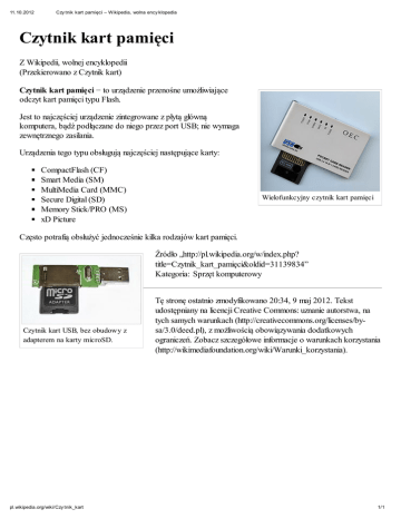 11.10.2012 Czy tnik kart pamięci – Wikipedia, wolna ency klopedia Czytnik kart pamięci Z Wikipedii, wolnej encyklopedii (Przekierowano z Czytnik kart) Czytnik kart pamięci − to urządzenie przenośne umożliwiające odczyt kart pamięci typu Flash. Jest to najczęściej urządzenie zintegrowane z płytą główną komputera, bądź podłączane do niego przez port USB; nie wymaga zewnętrznego zasilania. Urządzenia tego typu obsługują najczęściej następujące karty: CompactFlash (CF) Smart Media (SM) MultiMedia Card (MMC) Secure Digital (SD) Memory Stick/PRO (MS) xD Picture Wielofunkcyjny czytnik kart pamięci Często potrafią obsłużyć jednocześnie kilka rodzajów kart pamięci. Źródło „http://pl.wikipedia.org/w/index.php? title=Czytnik_kart_pamięci&oldid=31139834” Kategoria: Sprzęt komputerowy Czytnik kart USB, bez obudowy z adapterem na karty microSD. pl.wikipedia.org/wiki/Czy tnik_kart Tę stronę ostatnio zmodyfikowano 20:34, 9 maj 2012. Tekst udostępniany na licencji Creative Commons: uznanie autorstwa, na tych samych warunkach (http://creativecommons.org/licenses/bysa/3.0/deed.pl), z możliwością obowiązywania dodatkowych ograniczeń. Zobacz szczegółowe informacje o warunkach korzystania (http://wikimediafoundation.org/wiki/Warunki_korzystania). 1/1