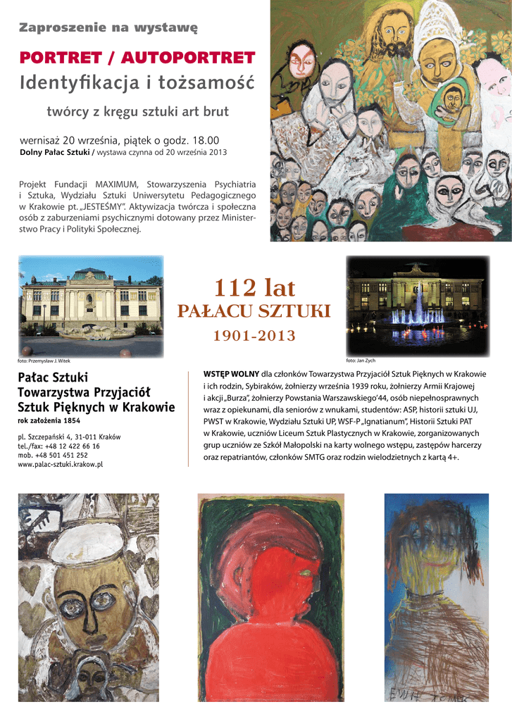 Zaproszenie na wystawę PORTRET / AUTOPORTRET Identyfikacja i tożsamość twórcy z kręgu sztuki art brut wernisaż 20 września, piątek o godz. 18.00 Dolny Pałac Sztuki / wystawa czynna od 20 września 2013 Projekt Fundacji MAXIMUM, Stowarzyszenia Psychiatria i Sztuka, Wydziału Sztuki Uniwersytetu Pedagogicznego w Krakowie pt. „JESTEŚMY”. Aktywizacja twórcza i społeczna osób z zaburzeniami psychicznymi dotowany przez Ministerstwo Pracy i Polityki Społecznej. 112 lat PAŁACU SZTUKI 1901-2013 foto: Przemysław J. Witek foto: Jan Zych WSTĘP WOLNY dla członków Towarzystwa Przyjaciół Sztuk Pięknych w Krakowie i ich rodzin, Sybiraków, żołnierzy września 1939 roku, żołnierzy Armii Krajowej i akcji „Burza”, żołnierzy Powstania Warszawskiego’44, osób niepełnosprawnych wraz z opiekunami, dla seniorów z wnukami, studentów: ASP, historii sztuki UJ, PWST w Krakowie, Wydziału Sztuki UP, WSF-P „Ignatianum”, Historii Sztuki PAT w Krakowie, uczniów Liceum Sztuk Plastycznych w Krakowie, zorganizowanych grup uczniów ze Szkół Małopolski na karty wolnego wstępu, zastępów harcerzy oraz repatriantów, członków SMTG oraz rodzin wielodzietnych z kartą 4+. Zbigniew Kazimierz Witek Prezes Towarzystwa Przyjaciół Sztuk Pięknych w Krakowie Ewa Sadowska i Iwona Siwek-Front Public Relations mają zaszczyt zaprosić na wystawę wernisaż 20 września 2013 piątek o godz. 18.00 godziny otwarcia: pon-pt.: 8.15 – 18.00 sob-nd.: 10.00 – 18.00 patronat medialny PORTRET / AUTOPORTRET Identyfikacja i tożsamość twórcy z kręgu sztuki art brut Organizatorzy: Pałac Sztuki Wydział Sztuki Uniwersytetu Pedagogicznego im. Komisji Edukacji Narodowej w Krakowie Stowarzyszenie Psychiatria i Sztuka Fundacja MAXIMUM Kurator wystawy: prof. UP Grażyna Borowik Od Kuratora wystawy: Przekształcenie obrazu zrodzonego w umyśle w konkretny, materialny fakt artystyczny: rysunkowy, malarski, rzeźbiarski, jest procesem złożonym, opartym na relacji twórca – odbiorca. Portret, obok pejzażu i martwej natury, należy do podstawowych tematów w sztukach wizualnych. Potrzeba zatrzymania wizerunku, przeniesienia go poza horyzont życia, ma swą wielotysięczną tradycję odzwierciedlającą oczekiwania społeczne i kulturowe. Portret, jako efekt doświadczenia ludzkiej twarzy o cechach osobowych, ukazywany jest w sztuce na wiele sposobów. Możemy odnaleźć przedstawienia iluzjonistyczne, karykaturalne, idealistyczne czy surrealistyczne. Porzucenie wartości fizjonomicznych na rzecz wizualnej ekspresji, symbolizacji, przekazu wstrząsającej prawdy o człowieku, który poddany oddziaływaniu niewidzialnych, wewnętrznych sił ulega deformacji, pojawia się w sztuce równolegle do przedstawień wystylizowanych, upiększonych, pompatycznych. W poczuciu wolności i wewnętrznej konieczności powstają realizacje artystów z kręgu art brut, którzy w portretach innych ukazują siebie, doświadczają relacji z drugim człowiekiem, ujawniają treści świadome i nieświadome, mają możliwość wejrzenia we własne problemy, pokazania tego, czego nie widać. Autoportret i portret to niepokojące podobizny, w których twórca szuka własnej tożsamości, własnego ja, z którym identyfikuje się bądź rozmija. Jako wypowiedź symboliczna portret pozwala na wgląd terapeutyczny, dostarczając informacji diagnostycznych, na wyrażenie doświadczeń, potrzeb, myśli i emocji, pomaga w samoidentyfikacji, w lepszym rozpoznaniu siebie i innych – odmiennych, obcych, nieznanych. Na wystawie zobaczymy ponad sto prac artystów z kręgu sztuki art brut, visionary art, outsider art, sztuki intuicyjnej zrodzonych z odmiennych doświadczeń osobistych, społecznych, mentalnych, kulturowych i religijnych. Prezentowanych na wystawie prac użyczyli: kolekcjoner: Leszek Macak (Kraków), Szpital Specjalistyczny im. dr Józefa Babińskiego w Krakowie (pracownie plastyczne, oddziałów rehabilitacyjnych, oddziału sądowego i wtz) Magdalena Tyszkiewicz, Klub Miłośników Sztuki (Gdynia)