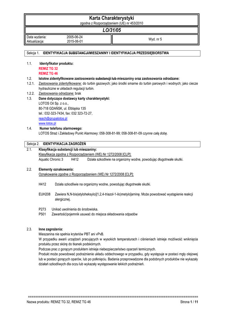 Karta Charakterystyki zgodna z Rozporządzeniem (UE) nr 453/2010 LO/31/05 Data wydania: Aktualizacja: 2005-06-24 2015-06-01 Wyd. nr 5 Sekcja 1. IDENTYFIKACJA SUBSTANCJI/MIESZANINY I IDENTYFIKACJA PRZEDSIĘBIORSTWA 1.1. 1.2. 1.2.1. 1.2.2. 1.3. 1.4. Identyfikator produktu: REMIZ TG 32 REMIZ TG 46 Istotne zidentyfikowane zastosowania substancji lub mieszaniny oraz zastosowania odradzane: Zastosowania zidentyfikowane: do turbin gazowych; jako środki smarne do turbin parowych i wodnych; jako ciecze hydrauliczne w układach regulacji turbin. Zastosowania odradzane: brak Dane dotyczące dostawcy karty charakterystyki: LOTOS Oil Sp. z o.o., 80-718 GDAŃSK, ul. Elbląska 135 tel.: 032-323-7434, fax: 032 323-72-27, [email protected] www.lotos.pl Numer telefonu alarmowego: LOTOS Straż i Zakładowy Punkt Alarmowy: 058-308-81-99; 058-308-81-09 czynne całą dobę. Sekcja 2. IDENTYFIKACJA ZAGROŻEŃ 2.1. Klasyfikacja substancji lub mieszaniny: Klasyfikacja zgodna z Rozporządzeniem (WE) Nr 1272/2008 [CLP]: Aquatic Chronic 3 H412 Działa szkodliwie na organizmy wodne, powodując długotrwałe skutki. 2.2. Elementy oznakowania: Oznakowanie zgodne z Rozporządzeniem (WE) Nr 1272/2008 [CLP]: H412 Działa szkodliwie na organizmy wodne, powodując długotrwałe skutki. EUH208 Zawiera N,N-bis(etyloheksylo)[1,2,4-triazol-1-ilo)metylo]aminę. Może powodować wystąpienie reakcji alergicznej. P273 P501 2.3. Unikać uwolnienia do środowiska. Zawartość/pojemnik usuwać do miejsca składowania odpadów Inne zagrożenia: Mieszanina nie spełnia kryteriów PBT ani vPvB. W przypadku awarii urządzeń pracujących w wysokich temperaturach i ciśnieniach istnieje możliwość wniknięcia produktu przez skórę do tkanek podskórnych. Podczas prac z gorącym produktem istnieje niebezpieczeństwo oparzeń termicznych. Produkt może powodować podrażnienie układu oddechowego w przypadku, gdy występuje w postaci mgły olejowej lub w postaci gorących oparów, lub po połknięciu. Badania przeprowadzone dla podobnych produktów nie wykazały działań szkodliwych dla oczu lub wykazały występowanie lekkich podrażnień. ============================================================================================== Nazwa produktu: REMIZ TG 32, REMIZ TG 46 Strona 1 / 11 Karta Charakterystyki zgodna z Rozporządzeniem (UE) nr 453/2010 LO/31/05 Data wydania: Aktualizacja: 2005-06-24 2015-06-01 Wyd. nr 5 Sekcja 3. SKŁAD / INFORMACJA O SKŁADNIKACH 3.1. Substancje: nie dotyczy 3.2. Mieszaniny: Numer Stężenie [%m/m] rejestracji CAS WE 01-2119490822-33128-39-2 204-884-0 < 0,45 0000 01-0000015116-780000; 01-2119930450-490000 Niedostępne Nazwa substancji 2,6-di-tert-butylofenol 91273-040 401-280-0 < 0,05 N,Nbis(etyloheksylo)[1,2,4triazol-1-ilo)metylo]amina 140-88-5 205-438-8 < 0,001 Akrylan etylu Klasyfikacja substancji zgodnie z Rozp. nr 1272/2008 Aquatic Acute 1, H400 Aquatic Chronic 1, H410 Skin Irrit. 2, H315 M acute = 1,00000 M chronic = 1,00000 Aquatic Chronic 2, H411 Skin Sens. 1A, H317 Skin Corr. 1B, H314 Flam. Liq. 2, H225 Acute Tox. 4, H302 Acute Tox. 4, H312 Acute Tox. 4, H332 Skin Irrit. 2, H315 Eye Irrit. 2, H319 Skin Sens. 1, H317 STOT SE 3, H335 Sekcja 4. ŚRODKI PIERWSZEJ POMOCY 4.1. Opis środków pierwszej pomocy: Przez drogi oddechowe: Wdychanie jest mało prawdopodobne ze względu na niską prężność par substancji w temperaturze otoczenia. Objawy: podrażnienie dróg oddechowych wywołane nadmiernym narażeniem na wyziewy, mgły lub opary. W przypadku objawów spowodowanych wdychaniem wyziewów, mgieł lub oparów produktu: O ile jest to bezpieczne, przenieść poszkodowanego do spokojnego i dobrze wentylowanego miejsca. Jeśli poszkodowany jest nieprzytomny i: - Poszkodowany nie oddycha - Upewnić się, czy nie ma przeszkód w oddychaniu i zapewnić sztuczne oddychanie w wykonaniu przeszkolonego personelu. W razie konieczności wykonać masaż serca i uzyskać pomoc medyczną. - W przypadku, gdy poszkodowany oddycha - Umieścić poszkodowanego w pozycji bezpiecznej. W razie potrzeby podać tlen. W przypadku utrzymujących się trudności z oddychaniem zwrócić się do lekarza. W przypadku kontaktu ze skórą: Objawy: sucha skóra, podrażnienie w przypadku powtarzającego się lub przedłużającego narażenia. W przypadku zetknięcia się z produktem o wysokiej temperaturze może dojść do oparzeń. Zdjąć skażoną odzież oraz obuwie i pozbyć się ich w sposób bezpieczny. Umyć skażoną część ciała wodą z mydłem. W przypadku wystąpienia i utrzymywania się podrażnienia, obrzmienia lub zaczerwienienia skóry zwrócić się do lekarza. ============================================================================================== Nazwa produktu: REMIZ TG 32, REMIZ TG 46 Strona 2 / 11 Karta Charakterystyki zgodna z Rozporządzeniem (UE) nr 453/2010 LO/31/05 Data wydania: Aktualizacja: 2005-06-24 2015-06-01 Wyd. nr 5 Podczas stosowania urządzeń wysokociśnieniowych może dojść do wstrzyknięcia przezskórnego. W przypadku obrażeń spowodowanych wysokim ciśnieniem niezwłocznie zwrócić się o pomoc medyczną. Nie czekać na pogłębienie się objawów. Lekkie poparzenia należy schłodzić: Trzymać poparzoną część ciała pod strumieniem zimnej wody przez przynajmniej pięć minut lub do momentu zelżenia bólu. Koniecznie zapobiec hipotermii. Nie okładać oparzeń lodem. Ostrożnie zdjąć nieprzywierającą odzież. NIE WOLNO próbować usuwać części odzieży przyklejonych do poparzonej skóry. Należy odcinać odzież wokół tych miejsc. W każdym przypadku poważnego oparzenia zwrócić się do lekarza. Po dostaniu się do oczu: Objawy: nieznaczne podrażnienie. W przypadku zetknięcia się z produktem o wysokiej temperaturze może dojść do oparzeń. Ostrożnie przepłukiwać wodą przez kilka minut. Jeśli to możliwe i łatwe do wykonania, wyjąć poszkodowanemu soczewki kontaktowe. Kontynuować płukanie. W przypadku wystąpienia i utrzymywania się podrażnie