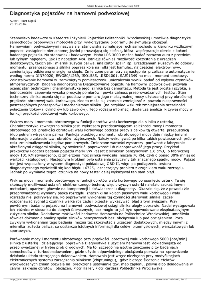 Polskie Towarzystwo Inżynierów Motoryzacji SIMP Diagnostyka pojazdów na hamowni podwoziowej Autor: Piort Gębiś 23.11.2016. Stanowisko badawcze w Katedrze Inżynierii Pojazdów Politechniki Wrocławskiej umożliwia diagnostykę samochodów osobowych i motocykli przy wykorzystaniu programu do symulacji obciążeń. Hamowniami podwoziowymi nazywa się stanowiska symulujące ruch samochodu w kierunku wzdłużnym poprzez zastąpienie nieruchomej jezdni poruszającą się bieżnią, która współpracuje ciernie z kołami badanego pojazdu. Na stanowisku badawczym Maha LPS 3000 można badać zarówno auta z przednim lub tylnym napędem, jak i z napędem 4x4. Istnieje również możliwość korzystania z urządzeń dodatkowych, takich jak: miernik zużycia paliwa, analizator spalin itp. Urządzeniem służącym do odbioru momentu przenoszonego z silnika poprzez koła na rolki jest hamulec, najczęściej elektrowirowy, zamieniający odbieraną energię na ciepło. Zmierzone parametry są następnie przeliczane automatycznie według norm: DIN70020, EWG80/1269, ISO1585, JISD1001, SAEJ1349 na moc i moment obrotowy. Zainstalowanie hamowni w zamkniętym pomieszczeniu uniezależnia wyniki badań od wpływu czynników atmosferycznych. Badania diagnostyczne Diagnozowanie pojazdu na hamowni podwoziowej pozwala ocenić stan techniczny i charakterystykę jego silnika bez demontażu. Metoda ta jest prosta i szybka, a jednocześnie zapewnia wysoką precyzję pomiarów i powtarzalność przeprowadzanych testów. Stan techniczny silnika ocenia się na podstawie pomiaru jego maksymalnej mocy użytecznej przy określonej prędkości obrotowej wału korbowego. Moc ta może się znacznie zmniejszać z powodu niesprawności poszczególnych podzespołów i mechanizmów silnika (na przykład wskutek zmniejszenia szczelności połączenia tłoków i cylindrów lub zaworów). Tego rodzaju informacji dostarcza analiza krzywej mocy w funkcji prędkości obrotowej wału korbowego. Wykres mocy i momentu obrotowego w funkcji obrotów wału korbowego dla silnika z usterką Charakterystyka zewnętrzna silnika jest wykresem przedstawiającym zależności mocy i momentu obrotowego od prędkości obrotowej wału korbowego podczas pracy z całkowitą otwartą przepustnicą i/lub pełnym wtryskiem paliwa. Funkcja przebiegu momentu obrotowego i mocy daje między innymi informacje o zakresie tzw. obrotów użytecznych. Należy wykonywać po kilka takich powtarzanych prób w celu zminimalizowania błędów pomiarowych. Zmierzone wartości wystarczy porównać z fabrycznie określonymi osiągami silnika, by stwierdzić poprawność lub niepoprawność jego pracy. Przykład praktyczny Podczas badania pojazdu marki VW Passat z silnikiem benzynowym 1.6 cm3, o fabrycznej mocy 101 KM stwierdzono, iż zmierzona moc silnika wynosiła niecałe 70 KM, czyli o ponad 30% mniej od wartości katalogowej. Następnym krokiem było ustalenie przyczyny tak znacznego spadku mocy. Pojazd ten jest wyposażony w system diagnostyki pokładowej OBD II, więc po podłączeniu testera diagnostycznego wyświetlił się kod błędu 16725, oznaczający problem z czujnikiem wału rozrządu. Jednak po wymianie tegoż czujnika na nowy tester dalej wykazywał ten sam błąd. Wykres mocy i momentu obrotowego w funkcji obrotów wału korbowego po usunięciu usterki Tu się skończyły możliwości ustaleń elektronicznego testera, więc przyczyn usterki należało szukać innymi metodami, opartymi głównie na kompetencji i doświadczeniu diagnosty. Okazało się, że z powodu źle przeprowadzonej wymiany paska rozrządu znaczniki na kołach pasowych wału korbowego i wału rozrządu nie pokrywały się. Po poprawnym wykonaniu tej czynności sterownik silnika zaczął rozpoznawać sygnał z czujnika wałka rozrządu i przestał wykazywać błąd z tym związany. Przy powtórnym badaniu pojazdu na hamowni podwoziowej osiągi silnika uległy poprawie. Nadal występowała ich różnica w stosunku do danych fabrycznych, lecz mogło to już być spowodowane eksploatacyjnym zużyciem silnika. Dodatkowe możliwości badawcze Hamownia na Politechnice Wrocławskiej umożliwia również dokonanie analizy spalin silników benzynowych bez obciążenia lub pod obciążeniem. Poza zwykłym wykonaniem tego badania można też skorzystać z urządzeń dodatkowych, między innymi z miernika zużycia paliwa, co dostarcza istotnych informacji dla celów przemysłowych, warsztatowych lub sportowych. Porównanie mocy i momentu obrotowego przy prędkości obrotowej wału korbowego 5000 [obr/min] silnika z usterką i działającego poprawnie Diagnostyka z użyciem hamowni jest dokładniejsza od przeprowadzanej w trybie prób drogowych. Ma to szczególnie istotne znaczenie przy badaniach samochodów z turbodoładowaniem, gdzie użycie odpowiedniego obciążenia pozwala na sprawdzenie działania układu sterującego doładowaniem. Hamownia jest wręcz niezbędna przy modyfikacjach elektronicznych systemu zarządzania silnikiem (chiptuningu), gdyż bieżące śledzenie efektów wprowadzanych zmian pozwala na precyzyjne ustawianie tzw. map zapłonu, paliwa albo doładowania w całym zakresie obrotów i obciążeń. Piotr Haller, Piotr Kardasz Politechnika Wrocławska http://ptim.simp.pl/ptim Kreator PDF Utworzono 7-03-2017, 20:10