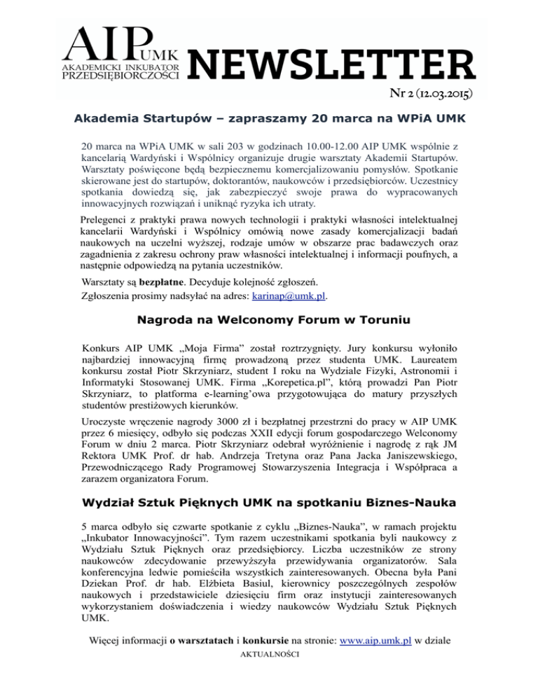 Akademia Startupów – zapraszamy 20 marca na WPiA UMK 20 marca na WPiA UMK w sali 203 w godzinach 10.00-12.00 AIP UMK wspólnie z kancelarią Wardyński i Wspólnicy organizuje drugie warsztaty Akademii Startupów. Warsztaty poświęcone będą bezpiecznemu komercjalizowaniu pomysłów. Spotkanie skierowane jest do startupów, doktorantów, naukowców i przedsiębiorców. Uczestnicy spotkania dowiedzą się, jak zabezpieczyć swoje prawa do wypracowanych innowacyjnych rozwiązań i uniknąć ryzyka ich utraty. Prelegenci z praktyki prawa nowych technologii i praktyki własności intelektualnej kancelarii Wardyński i Wspólnicy omówią nowe zasady komercjalizacji badań naukowych na uczelni wyższej, rodzaje umów w obszarze prac badawczych oraz zagadnienia z zakresu ochrony praw własności intelektualnej i informacji poufnych, a następnie odpowiedzą na pytania uczestników. Warsztaty są bezpłatne. Decyduje kolejność zgłoszeń. Zgłoszenia prosimy nadsyłać na adres: [email protected]. Nagroda na Welconomy Forum w Toruniu Konkurs AIP UMK „Moja Firma” został roztrzygnięty. Jury konkursu wyłoniło najbardziej innowacyjną firmę prowadzoną przez studenta UMK. Laureatem konkursu został Piotr Skrzyniarz, student I roku na Wydziale Fizyki, Astronomii i Informatyki Stosowanej UMK. Firma „Korepetica.pl”, którą prowadzi Pan Piotr Skrzyniarz, to platforma e-learning’owa przygotowująca do matury przyszłych studentów prestiżowych kierunków. Uroczyste wręczenie nagrody 3000 zł i bezpłatnej przestrzni do pracy w AIP UMK przez 6 miesięcy, odbyło się podczas XXII edycji forum gospodarczego Welconomy Forum w dniu 2 marca. Piotr Skrzyniarz odebrał wyróżnienie i nagrodę z rąk JM Rektora UMK Prof. dr hab. Andrzeja Tretyna oraz Pana Jacka Janiszewskiego, Przewodniczącego Rady Programowej Stowarzyszenia Integracja i Współpraca a zarazem organizatora Forum. Wydział Sztuk Pięknych UMK na spotkaniu Biznes-Nauka 5 marca odbyło się czwarte spotkanie z cyklu „Biznes-Nauka”, w ramach projektu „Inkubator Innowacyjności”. Tym razem uczestnikami spotkania byli naukowcy z Wydziału Sztuk Pięknych oraz przedsiębiorcy. Liczba uczestników ze strony naukowców zdecydowanie przewyższyła przewidywania organizatorów. Sala konferencyjna ledwie pomieściła wszystkich zainteresowanych. Obecna była Pani Dziekan Prof. dr hab. Elżbieta Basiul, kierownicy poszczególnych zespołów naukowych i przedstawiciele dziesięciu firm oraz instytucji zainteresowanych wykorzystaniem doświadczenia i wiedzy naukowców Wydziału Sztuk Pięknych UMK. Więcej informacji o warsztatach i konkursie na stronie: www.aip.umk.pl w dziale AKTUALNOŚCI