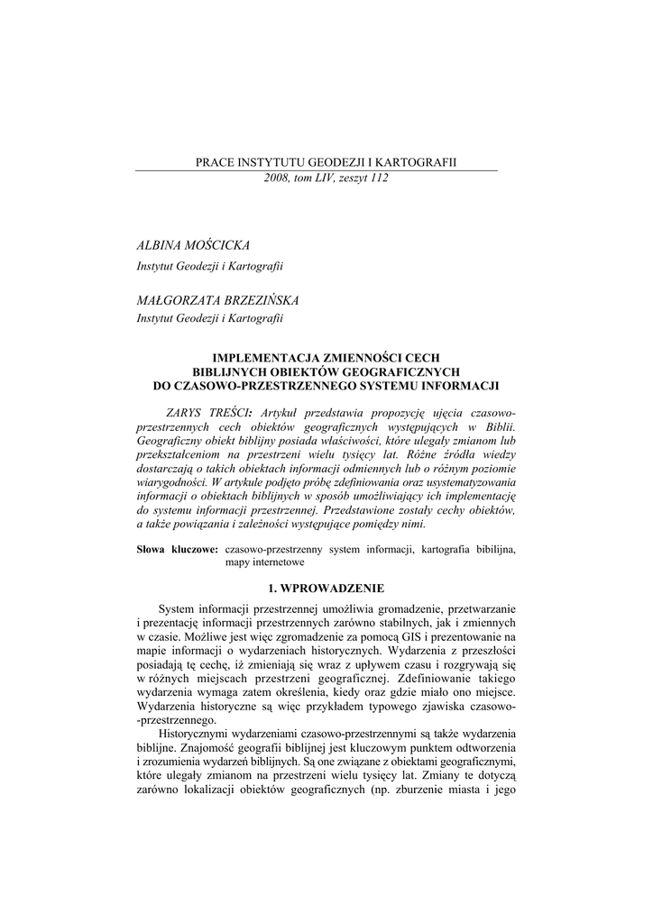 PRACE INSTYTUTU GEODEZJI I KARTOGRAFII 2008, tom LIV, zeszyt 112 ALBINA MOŚCICKA Instytut Geodezji i Kartografii MAŁGORZATA BRZEZIŃSKA Instytut Geodezji i Kartografii IMPLEMENTACJA ZMIENNOŚCI CECH BIBLIJNYCH OBIEKTÓW GEOGRAFICZNYCH DO CZASOWO-PRZESTRZENNEGO SYSTEMU INFORMACJI ZARYS TREŚCI: Artykuł przedstawia propozycję ujęcia czasowoprzestrzennych cech obiektów geograficznych występujących w Biblii. Geograficzny obiekt biblijny posiada właściwości, które ulegały zmianom lub przekształceniom na przestrzeni wielu tysięcy lat. Różne źródła wiedzy dostarczają o takich obiektach informacji odmiennych lub o różnym poziomie wiarygodności. W artykule podjęto próbę zdefiniowania oraz usystematyzowania informacji o obiektach biblijnych w sposób umożliwiający ich implementację do systemu informacji przestrzennej. Przedstawione zostały cechy obiektów, a także powiązania i zależności występujące pomiędzy nimi. Słowa kluczowe: czasowo-przestrzenny system informacji, kartografia bibilijna, mapy internetowe 1. WPROWADZENIE System informacji przestrzennej umożliwia gromadzenie, przetwarzanie i prezentację informacji przestrzennych zarówno stabilnych, jak i zmiennych w czasie. Możliwe jest więc zgromadzenie za pomocą GIS i prezentowanie na mapie informacji o wydarzeniach historycznych. Wydarzenia z przeszłości posiadają tę cechę, iż zmieniają się wraz z upływem czasu i rozgrywają się w różnych miejscach przestrzeni geograficznej. Zdefiniowanie takiego wydarzenia wymaga zatem określenia, kiedy oraz gdzie miało ono miejsce. Wydarzenia historyczne są więc przykładem typowego zjawiska czasowo-przestrzennego. Historycznymi wydarzeniami czasowo-przestrzennymi są także wydarzenia biblijne. Znajomość geografii biblijnej jest kluczowym punktem odtworzenia i zrozumienia wydarzeń biblijnych. Są one związane z obiektami geograficznymi, które ulegały zmianom na przestrzeni wielu tysięcy lat. Zmiany te dotyczą zarówno lokalizacji obiektów geograficznych (np. zburzenie miasta i jego 94 Albina Mościcka, Małgorzata Brzezińska odbudowanie w innym miejscu), jak i stosowanego nazewnictwa (np. zmiana nazwy miejscowości). Geograficzne obiekty biblijne, a co za tym idzie wydarzenia biblijne, są zatem typowym przykładem obiektów/zjawisk zmiennych w czasie i przestrzeni. W ramach projektu badawczego, finansowanego przez Ministerstwo Nauki i Szkolnictwa Wyższego, Instytut Geodezji i Kartografii wraz z Uniwersytetem Jagiellońskim oraz Uniwersytetem Kardynała Stefana Wyszyńskiego przystąpił do opracowania czasowo-przestrzennego systemu informacji przestrzennej o wydarzeniach i obiektach geograficznych. Głównym celem projektu było zaproponowanie koncepcji, rozwój metodologii planowania oraz realizacji czasowo zorientowanego systemu informacyjnego o wybranych wydarzeniach biblijnych opisanych na kartach Starego i Nowego Testamentu. Propozycja systemu zakłada opracowanie GIS obejmującego bazę referencyjną oraz bazy tematyczne. Baza referencyjna zawiera te elementy przestrzeni geograficznej, które składają się na mapę podkładową, wspólną dla wszystkich opracowywanych map tematycznych. Bazy tematyczne to m.in. baza obiektów geograficznych oraz baza zawierająca informacje niezbędne do przedstawienia konkretnych wydarzeń biblijnych, np. obszary zamieszkiwane przez różne plemiona, trasy wędrówek. 2. CECHY BIBLIJNEGO OBIEKTU GEOGRAFICZNEGO Zapisanie w GIS informacji o wydarzeniach historycznych wymaga określenia trzech komponentów analizowanych zjawisk: miejsca, czasu i atrybutów. Efektywne dokumentowanie informacji o wydarzeniach, które zmieniają się w czasie i przestrzeni, wymaga zatem takiego systemu informacji przestrzennej, którego architektura uwzględniać będzie czasowoprzestrzenny model danych. Opracowanie takiego modelu polega na opisaniu struktury danych poprzez specyfikację założeń, dozwolonych reprezentacji i związków w taki sposób, aby możliwe było wykorzystanie i zaprezentowanie tych informacji w zależności od potrzeb i przeznaczenia systemu. Z punktu widzenia dokumentowania wydarzeń biblijnych przyjęto, iż w projektowanym systemie czasowo-przestrzenna zmienność obiektów geograficznych będzie reprezentowana poprzez określenie jednoczasowych stanów obiektów, czyli ich form w poszczególnych okresach. W ramach jednego okresu (lub jednej daty) określone zostanie położenie i kształt obiektu oraz jego atrybuty. Czasowo-przestrzenny obiekt będzie zatem składał się z wielu jego stanów, zależnych od czasu, a co za tym idzie z wielu kształtów, położeń i atrybutów zmiennych w czasie. Opracowanie modelu czasowo-przestrzennych cech obiektu biblijnego wymaga więc zdefiniowania założeń i reguł zmienności właściwości tego obiektu w czasie. Przyjęto, że czasowo-przestrzenny obiekt geograficzny jest biblijnym obiektem geograficznym, który w różnych okresach mógł posiadać odmienne położenie lub atrybuty. Formę danego obiektu geograficznego, czyli Implementacja zmienności cech biblijnych obiektów geograficznych... 95 określone położenie geograficzne wraz z atrybutami w dowolnym przedziale czasu można zdefiniować jako stan obiektu w tym przedziale czasu. Stan obiektu geograficznego w jednym przedziale czasu nazywamy jednoczasowym stanem obiektu. Składają się na niego położenie geograficzne obiektu oraz jego atrybuty. Atrybuty te mogą być stałe lub zmienne. Atrybuty stałe obiektu geograficznego mogą być niezmienne w ramach jednego obiektu geograficznego lub w ramach jednego stanu obiektu. Atrybutem stałym dla danego stanu obiektu, czyli niezmiennym jedynie w konkretnym przedziale czasu, jest nazwa obiektu geograficznego. W wielu przypadkach nazwa obiektu geograficznego może być jednakowa w kilku (lub we wszystkich) stanach obiektu geograficznego. Atrybutami stałymi dla każdego obiektu geograficznego we wszystkich jego stanach są: rodzaj obie