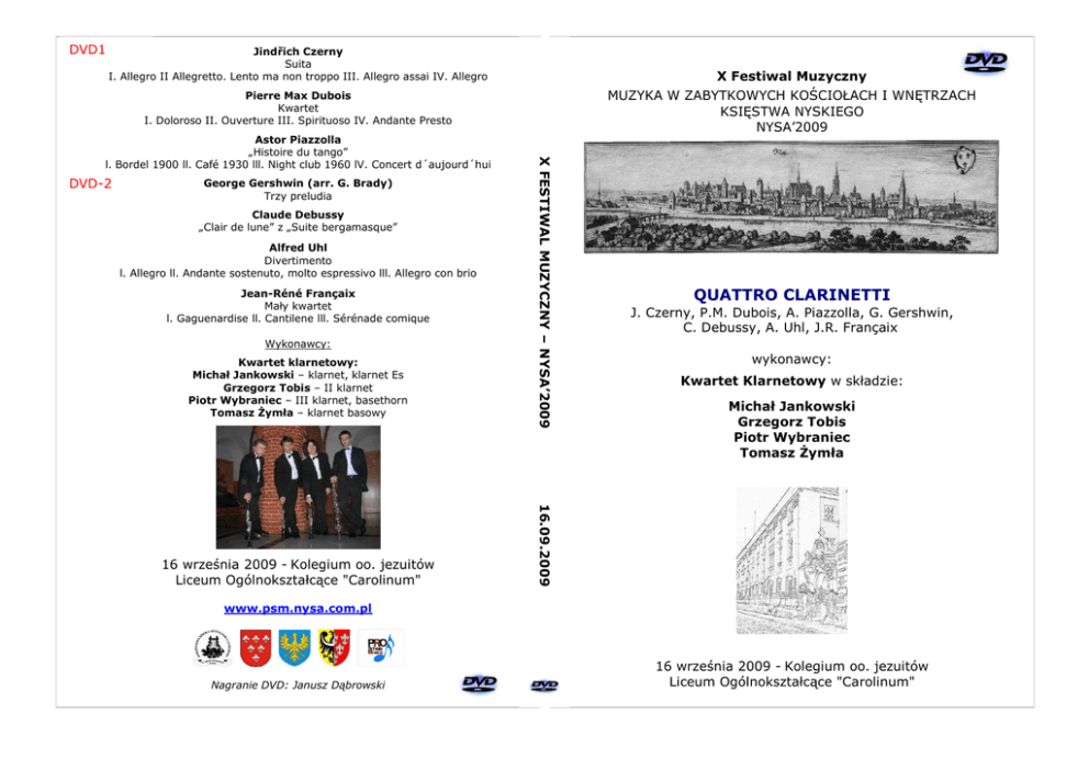 DVD1 Jindřich Czerny Suita I. Allegro II Allegretto. Lento ma non troppo III. Allegro assai IV. Allegro X Festiwal Muzyczny MUZYKA W ZABYTKOWYCH KOŚCIOŁACH I WNĘTRZACH KSIĘSTWA NYSKIEGO NYSA’2009 Pierre Max Dubois Kwartet I. Doloroso II. Ouverture III. Spirituoso IV. Andante Presto DVD-2 George Gershwin (arr. G. Brady) Trzy preludia Claude Debussy „Clair de lune” z „Suite bergamasque” Alfred Uhl Divertimento l. Allegro ll. Andante sostenuto, molto espressivo lll. Allegro con brio Jean-Réné Françaix Mały kwartet l. Gaguenardise ll. Cantilene lll. Sérénade comique Wykonawcy: Kwartet klarnetowy: Michał Jankowski – klarnet, klarnet Es Grzegorz Tobis – II klarnet Piotr Wybraniec – III klarnet, basethorn Tomasz Żymła – klarnet basowy QUATTRO CLARINETTI J. Czerny, P.M. Dubois, A. Piazzolla, G. Gershwin, C. Debussy, A. Uhl, J.R. Françaix wykonawcy: Kwartet Klarnetowy w składzie: Michał Jankowski Grzegorz Tobis Piotr Wybraniec Tomasz Żymła 16.09.2009 16 września 2009 - Kolegium oo. jezuitów Liceum Ogólnokształcące "Carolinum" X FESTIWAL MUZYCZNY – NYSA’2009 Astor Piazzolla „Histoire du tango” l. Bordel 1900 ll. Café 1930 lll. Night club 1960 lV. Concert d´aujourd´hui www.psm.nysa.com.pl Nagranie DVD: Janusz Dąbrowski 16 września 2009 - Kolegium oo. jezuitów Liceum Ogólnokształcące "Carolinum"