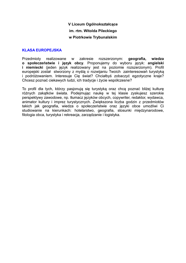 V Liceum Ogólnokształcące im. rtm. Witolda Pileckiego w Piotrkowie Trybunalskim KLASA EUROPEJSKA Przedmioty realizowane w zakresie rozszerzonym: geografia, wiedza o społeczeństwie i język obcy. Proponujemy do wyboru język: angielski i niemiecki (jeden język realizowany jest na poziomie rozszerzonym). Profil europejski został stworzony z myślą o rozwijaniu Twoich zainteresowań turystyką i podróżowaniem. Interesuje Cię świat? Chciałbyś zobaczyć egzotyczne kraje? Chcesz poznać ciekawych ludzi, ich tradycje i życie współczesne? To profil dla tych, którzy pasjonują się turystyką oraz chcą poznać bliżej kulturę różnych zakątków świata. Podejmując naukę w tej klasie zyskujesz szerokie perspektywy zawodowe, np. tłumacz języków obcych, copywriter, redaktor, wydawca, animator kultury i imprez turystycznych. Zwiększona liczba godzin z przedmiotów takich jak geografia, wiedza o społeczeństwie oraz języki obce umożliwi Ci studiowanie na kierunkach: hotelarstwo, geografia, stosunki międzynarodowe, filologia obca, turystyka i rekreacja, zarządzanie i logistyka.