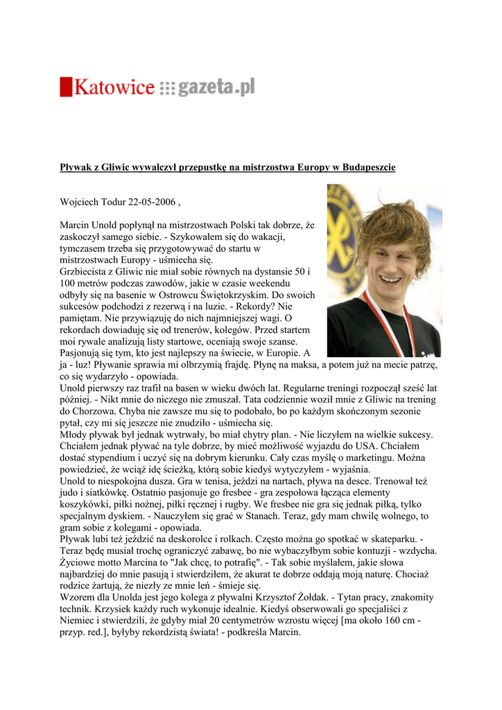 Pływak z Gliwic wywalczył przepustkę na mistrzostwa Europy w Budapeszcie Wojciech Todur 22-05-2006 , Marcin Unold popłynął na mistrzostwach Polski tak dobrze, Ŝe zaskoczył samego siebie. - Szykowałem się do wakacji, tymczasem trzeba się przygotowywać do startu w mistrzostwach Europy - uśmiecha się. Grzbiecista z Gliwic nie miał sobie równych na dystansie 50 i 100 metrów podczas zawodów, jakie w czasie weekendu odbyły się na basenie w Ostrowcu Świętokrzyskim. Do swoich sukcesów podchodzi z rezerwą i na luzie. - Rekordy? Nie pamiętam. Nie przywiązuję do nich najmniejszej wagi. O rekordach dowiaduję się od trenerów, kolegów. Przed startem moi rywale analizują listy startowe, oceniają swoje szanse. Pasjonują się tym, kto jest najlepszy na świecie, w Europie. A ja - luz! Pływanie sprawia mi olbrzymią frajdę. Płynę na maksa, a potem juŜ na mecie patrzę, co się wydarzyło - opowiada. Unold pierwszy raz trafił na basen w wieku dwóch lat. Regularne treningi rozpoczął sześć lat później. - Nikt mnie do niczego nie zmuszał. Tata codziennie woził mnie z Gliwic na trening do Chorzowa. Chyba nie zawsze mu się to podobało, bo po kaŜdym skończonym sezonie pytał, czy mi się jeszcze nie znudziło - uśmiecha się. Młody pływak był jednak wytrwały, bo miał chytry plan. - Nie liczyłem na wielkie sukcesy. Chciałem jednak pływać na tyle dobrze, by mieć moŜliwość wyjazdu do USA. Chciałem dostać stypendium i uczyć się na dobrym kierunku. Cały czas myślę o marketingu. MoŜna powiedzieć, Ŝe wciąŜ idę ścieŜką, którą sobie kiedyś wytyczyłem - wyjaśnia. Unold to niespokojna dusza. Gra w tenisa, jeździ na nartach, pływa na desce. Trenował teŜ judo i siatkówkę. Ostatnio pasjonuje go fresbee - gra zespołowa łącząca elementy koszykówki, piłki noŜnej, piłki ręcznej i rugby. We fresbee nie gra się jednak piłką, tylko specjalnym dyskiem. - Nauczyłem się grać w Stanach. Teraz, gdy mam chwilę wolnego, to gram sobie z kolegami - opowiada. Pływak lubi teŜ jeździć na deskorolce i rolkach. Często moŜna go spotkać w skateparku. Teraz będę musiał trochę ograniczyć zabawę, bo nie wybaczyłbym sobie kontuzji - wzdycha. śyciowe motto Marcina to "Jak chcę, to potrafię". - Tak sobie myślałem, jakie słowa najbardziej do mnie pasują i stwierdziłem, Ŝe akurat te dobrze oddają moją naturę. ChociaŜ rodzice Ŝartują, Ŝe niezły ze mnie leń - śmieje się. Wzorem dla Unolda jest jego kolega z pływalni Krzysztof śołdak. - Tytan pracy, znakomity technik. Krzysiek kaŜdy ruch wykonuje idealnie. Kiedyś obserwowali go specjaliści z Niemiec i stwierdzili, Ŝe gdyby miał 20 centymetrów wzrostu więcej [ma około 160 cm przyp. red.], byłyby rekordzistą świata! - podkreśla Marcin. W Ŝyciu Unolda wiele się ostatnio dzieje. Dwa dni przed startem w Ostrowcu zdał ostatni egzamin maturalny i zakończył naukę w oświęcimskiej Szkole Mistrzostwa Sportowego. Liczyłem na dwa miesiące luzu, a tu się trzeba zabrać do pracy - śmieje się. Złote medale dały pływakowi z Gliwic przepustkę do wyjazdu na mistrzostwa Europy w Budapeszcie (31 lipca 8 sierpnia), gliwiczanin popłynie w sztafetach. Jesienią zawodnik planuje rozpocząć studia na katowickim AWF-ie. Marcin Unold wiek: 20 lat wzrost: 187 cm waga: 75 kg kluby: Orka Zabrze, Pałac Katowice, Piast Gliwice, KUSY Chorzów, AZS AWF Katowice hobby: imprezy, sporty ekstremalne