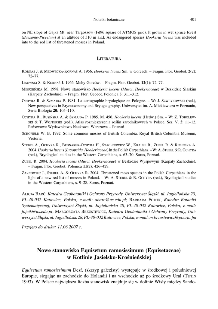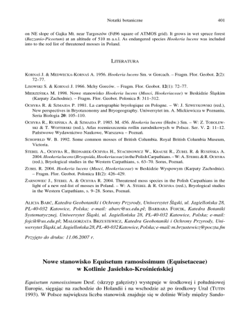 Notatki botaniczne 401 on NE slope of Gajka Mt. near Targoszów (Fd96 square of ATMOS grid). It grows in wet spruce forest (Bazzanio-Piceetum) at an altitude of 510 m a.s.l. As endangered species Hookeria lucens was included into to the red list of threatened mosses in Poland. LITERATURA KORNAŚ J. & MEDWECKA-KORNAŚ A. 1956. Hookeria lucens Sm. w Gorcach. – Fragm. Flor. Geobot. 2(2): 72–77. LISOWSKI S. & KORNAŚ J. 1966. Mchy Gorców. – Fragm. Flor. Geobot. 12(1): 72–77. MIERZEŃSKA M. 1998. Nowe stanowisko Hookeria lucens (Musci, Hookeriaceae) w Beskidzie Śląskim (Karpaty Zachodnie). – Fragm. Flor. Geobot. Polonica 5: 311–312. OCHYRA R. & SZMAJDA P. 1981. La cartographie bryologique en Pologne. – W: J. SZWEYKOWSKI (red.), New perspectives in Bryotaxonomy and Bryogeography. Uniwersytet im. A. Mickiewicza w Poznaniu, Seria Biologia 20: 105–110. OCHYRA R., RUSIŃSKA A. & SZMAJDA P. 1985. M. 456. Hookeria lucens (Hedw.) Sm. – W: Z. TOBOLEWSKI & T. WOJTERSKI (red.), Atlas rozmieszczenia roślin zarodnikowych w Polsce. Ser. V. 2: 11–12. Państwowe Wydawnictwo Naukowe, Warszawa – Poznań. SCHOFIELD W. B. 1992. Some common mosses of British Columbia. Royal British Columbia Museum, Victoria. STEBEL A., OCHYRA R., BEDNAREK-OCHYRA H., STACHNOWICZ W., KRAUSE R., ZUBEL R. & RUSIŃSKA A. 2004. Hookeria lucens (Bryopsida, Hookeriaceae) in the Polish Carpathians. – W: A. STEBEL & R. OCHYRA (red.), Bryological studies in the Western Carpathians, s. 63–70. Sorus, Poznań. ZUBEL R. 2004. Hookeria lucens (Musci, Hookeriaceae) w Beskidzie Wyspowym (Karpaty Zachodnie). – Fragm. Flor. Geobot. Polonica 11(2): 426–429. ŻARNOWIEC J., STEBEL A. & OCHYRA R. 2004. Threatened moss species in the Polish Carpathians in the light of a new red-list of mosses in Poland. – W: A. STEBEL & R. OCHYRA (red.), Bryological studies in the Western Carpathians, s. 9–28. Sorus, Poznań. ALICJA BARĆ, Katedra Geobotaniki i Ochrony Przyrody, Uniwersytet Śląski, ul. Jagiellońska 28, PL-40-032 Katowice, Polska; e-mail: [email protected]; BARBARA FOJCIK, Katedra Botaniki Systematycznej, Uniwersytet Śląski, ul. Jagiellońska 28, PL-40-032 Katowice, Polska; e-mail: [email protected]; MAŁGORZATA BRZUSTEWICZ, Katedra Geobotaniki i Ochrony Przyrody, Uniwersytet Śląski, ul. Jagiellońska 28, PL-40-032 Katowice, Polska; e-mail: [email protected] Przyjęto do druku: 11.06.2007 r. Nowe stanowisko Equisetum ramosissimum (Equisetaceae) w Kotlinie Jasielsko-Krośnieńskiej Equisetum ramosissimum Desf. (skrzyp gałęzisty) występuje w środkowej i południowej Europie, sięgając na zachodzie do Holandii i na wschodzie aż po środkowy Ural (TUTIN 1993). W Polsce największa liczba stanowisk znajduje się w dolinie Wisły między Sando- 402 Fragm. Flor. Geobot. Polonica 14(2), 2007 mierzem a Warszawą, poza tym skrzyp gałęzisty rośnie na rozproszonych stanowiskach, głównie w dolinach prawobrzeżnych dopływów Wisły (ZAJĄC & ZAJĄC 2001). Preferuje siedliska kserotermiczne, przede wszystkim płaty klasy Koelerio glaucae-Corynephoretea canescentis, rzędu Corynephoretalia canescentis, związku Vicio lathyroidis-Potentillion argenteae, w obrębie którego wyróżnia się od niedawna, słabo jeszcze poznany zespół Festuco rubrae-Equisetetum ramosissimi (MATUSZKIEWICZ 2001). Nowe stanowisko znajduje się w Trzcinicy koło Jasła (kwadrat ATPOL FF90), na nasypie nieużytkowanej bocznicy kolejowej. Equisetum ramosissimum występuje tam w dwóch subpopulacjach. Pierwsza z nich, obejmuje około 7 m2 na długości blisko 20 m wierzchniej części nasypu, głównie od strony południowej. Druga składa się z dwóch niewielkich kęp o łącznej powierzchni mniejszej niż 0,25 m2. Powstała prawdopodobnie w 2005 r. w trakcie rozbiórki torowiska. Jest to jedyne stanowisko tego gatunku w Kotlinie Jasielsko-Krośnieńskiej i jedyne pewne w polskich Karpatach środkowych i wschodnich (ZAJĄC & ZAJĄC 2001). Likwidacja bocznicy kolejowej połączona była z wycinką krzewów na zboczach nasypu, co prawdopodobnie poprawiło warunki występowania skrzypu gałęzistego w tym miejscu. Jednak dla zapewnienia pełnej ochrony konieczne jest otoczenie stanowiska ochroną rezerwatową lub w formie użytku ekologicznego. Przykładowe zdjęcie fitosocjologiczne. Data: 26.08.2006 r.; powierzchnia: 2,5 m2; ekspozycja: S; nachylenie: 5°; pokrycie warstwy zielnej: 75%; Ch. Cl. Artemisietea vulgaris: Tanacetum vulgare 2, Artemisia vulgaris 1, Rubus caesius +, Solidago gigantea +, Torilis japonica +, Inne: Equisetum ramosissimum 4, Equisetum arvense 1, Vicia sativa 1, Achillea millefolium +, Cerastium holosteoides +, Convolvulus arvensis +, Daucus carota +, Elymus repens +, Heracleum sphondylium +, Medicago lupulina +, Pimpinella saxifraga +, Poa compressa +, Taraxacum officinale +, Verbascum thapsus +, Vicia cracca +, Setaria viridis r. Summary. A new locality of Equisetum ramosissimum (Equisetaceae) in Jasło-Krosno Basin. The new locality of Equisetum ramosissimum Desf. has been found on the top part of the railway embankment in Trzcinica near Jasło (ATPOL square FF90) which is not used any more, in Jasło-Krosno Basin. There is the only unquestionable locality of E. ramosissimum in eastern and middle Polish Carpathians. LITERATURA MATUSZKIEWICZ W. 2001. Przewodnik do oznaczania zbiorowisk roślinnych Polski. Vademecum geobotanicum 3. s. 537. Wydawnictwo Naukowe PWN, Warszawa. TUTIN T. G. 1993. Equisetum L. – W: T. G. TUTIN, N. A. BURGES, A. O. CHATER, J. R. EDMONDSON, V. H. HEYWOOD, D. M. MOORE, D. H. VALENTINE, S. M. WALTERS & D. A. WEBB (red.), Flora Europaea, 2nd ed., 1. Psilotaceae to Platanaceae, s. 7–9. Cambridge Univ. Press, Cambridge. ZAJĄC A. & ZAJĄC M. (red.) 2001. Atlas rozmieszczenia roślin naczyniowych w Polsce. s. xii + 714. Nakładem Pracowni Chorologii Komputerowej Instytutu Botaniki Uniwersytetu Jagiellońskiego, Kraków. DOMINIK WRÓBEL, Instytut Botaniki im. W. Szafera, Polska Akademia Nauk, ul
