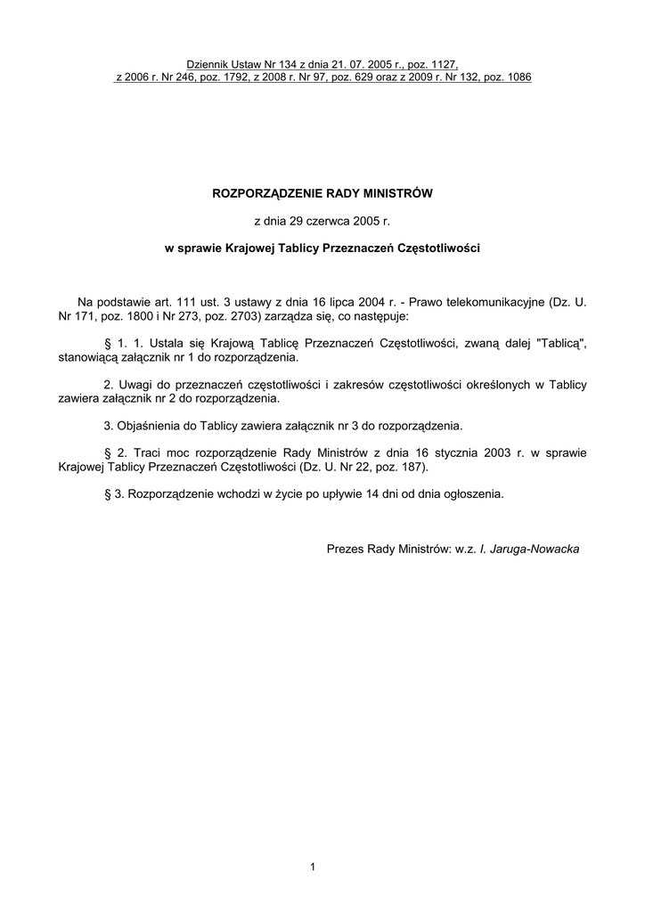 Dziennik Ustaw Nr 134 z dnia 21. 07. 2005 r., poz. 1127, z 2006 r. Nr 246, poz. 1792, z 2008 r. Nr 97, poz. 629 oraz z 2009 r. Nr 132, poz. 1086 ROZPORZĄDZENIE RADY MINISTRÓW z dnia 29 czerwca 2005 r. w sprawie Krajowej Tablicy Przeznaczeń Częstotliwości Na podstawie art. 111 ust. 3 ustawy z dnia 16 lipca 2004 r. - Prawo telekomunikacyjne (Dz. U. Nr 171, poz. 1800 i Nr 273, poz. 2703) zarządza się, co następuje: § 1. 1. Ustala się Krajową Tablicę Przeznaczeń Częstotliwości, zwaną dalej "Tablicą", stanowiącą załącznik nr 1 do rozporządzenia. 2. Uwagi do przeznaczeń częstotliwości i zakresów częstotliwości określonych w Tablicy zawiera załącznik nr 2 do rozporządzenia. 3. Objaśnienia do Tablicy zawiera załącznik nr 3 do rozporządzenia. § 2. Traci moc rozporządzenie Rady Ministrów z dnia 16 stycznia 2003 r. w sprawie Krajowej Tablicy Przeznaczeń Częstotliwości (Dz. U. Nr 22, poz. 187). § 3. Rozporządzenie wchodzi w Ŝycie po upływie 14 dni od dnia ogłoszenia. Prezes Rady Ministrów: w.z. I. Jaruga-Nowacka 1 2 Załączniki do rozporządzenia Rady Ministrów z dnia 29 czerwca 2005 r. (poz. 1127) Załącznik nr 1 KRAJOWA TABLICA PRZEZNACZEŃ CZĘSTOTLIWOŚCI L.p. 1 f dolna (kHz) f górna (kHz) PoniŜej 9 kHz 2 9 14 3 14,00 4 Przeznaczenie UŜytkowanie (Nie przeznaczono) 5.53 5.54 RADIONAWIGACJA cywilno-rządowe 19,95 STAŁA RUCHOMA MORSKA 5.57 5.56 cywilno-rządowe cywilno-rządowe 19,95 20,05 WZORCOWY SYGNAŁ CZĘSTOTLIWOŚCI I CZASU (20 kHz) cywilne 5 20,05 70,00 STAŁA RUCHOMA MORSKA 5.57 5.56 cywilno-rządowe cywilno-rządowe 6 70 72 RADIONAWIGACJA 5.60 rządowe 7 72 84 STAŁA RUCHOMA MORSKA 5.57 RADIONAWIGACJA 5.60 5.56 cywilno-rządowe cywilno-rządowe rządowe 8 84 86 RADIONAWIGACJA 5.60 cywilno-rządowe 9 86 90 STAŁA RUCHOMA MORSKA 5.57 RADIONAWIGACJA 5.56 cywilno-rządowe cywilno-rządowe rządowe 10 90 110 RADIONAWIGACJA 5.62 Stała 5.64 cywilno-rządowe cywilno-rządowe 11 110 112 STAŁA RUCHOMA MORSKA RADIONAWIGACJA 5.64 cywilne cywilno-rządowe cywilne 12 112 115 RADIONAWIGACJA 5.60 cywilno-rządowe 13 115,0 117,6 RADIONAWIGACJA 5.60 Stała Ruchoma morska 5.64 cywilno-rządowe cywilno-rządowe cywilno-rządowe 14 117,6 126,0 STAŁA RUCHOMA MORSKA RADIONAWIGACJA 5.60 5.64 cywilno-rządowe cywilno-rządowe cywilno-rządowe 15 126 129 RADIONAWIGACJA 5.60 cywilno-rządowe 16 129 130 STAŁA RUCHOMA MORSKA RADIONAWIGACJA 5.60 5.64 cywilno-rządowe cywilno-rządowe cywilno-rządowe 17 130,0 148,5 STAŁA RUCHOMA MORSKA 5.64 POL.1 cywilno-rządowe cywilno-rządowe 18 148,5 255,0 RADIODYFUZJA cywilne 19 255,0 283,5 RADIONAWIGACJA LOTNICZA RADIODYFUZJA cywilno-rządowe cywilne 3 L.p. f dolna (kHz) f górna (kHz) 20 283,5 315,0 21 315 22 Przeznaczenie UŜytkowanie RADIONAWIGACJA LOTNICZA RADIONAWIGACJA MORSKA (radiolatarnie) 5.73 5.74 cywilno-rządowe cywilno-rządowe 325 RADIONAWIGACJA LOTNICZA Radionawigacja morska (radiolatarnie) 5.73 cywilno-rządowe cywilno-rządowe 325 405 RADIONAWIGACJA LOTNICZA cywilno-rządowe 23 405 415 RADIONAWIGACJA 5.76 cywilno-rządowe 24 415 435 RUCHOMA MORSKA 5.79 RADIONAWIGACJA LOTNICZA cywilno-rządowe cywilno-rządowe 25 435 495 RUCHOMA MORSKA 5.79 5.79A Radionawigacja lotnicza 5.82 cywilno-rządowe cywilno-rządowe 26 495 505 RUCHOMA (ratunkowa i wywoławcza) 5.83 cywilno-rządowe 27 505,0 526,5 RUCHOMA MORSKA 5.79 5.79A 5.84 RADIONAWIGACJA LOTNICZA cywilno-rządowe cywilno-rządowe 28 526,5 1606,5 RADIODYFUZJA cywilne 29 1 606,5 1 625,0 STAŁA RUCHOMA LĄDOWA RUCHOMA MORSKA 5.90 cywilno-rządowe cywilno-rządowe cywilno-rządowe 30 1 625 1 635 STAŁA 5.93 RUCHOMA LĄDOWA 5.93 RADIOLOKALIZACJA rządowe rządowe cywilno-rządowe 31 1 635 1 800 STAŁA RUCHOMA LĄDOWA RUCHOMA MORSKA 5.90 cywilno-rządowe cywilno-rządowe cywilno-rządowe 32 1 800 1 810 STAŁA 5.93 RUCHOMA LĄDOWA 5.93 RADIOLOKALIZACJA rządowe rządowe cywilno-rządowe 33 1 810 1 850 AMATORSKA 5.100 cywilne 34 1 850 2 000 STAŁA RUCHOMA z wyjątkiem ruchomej lotniczej AMATORSKA 5.96 5.103 cywilno-rządowe cywilno-rządowe cywilne 35 2 000 2 025 STAŁA RUCHOMA z wyjątkiem ruchomej lotniczej (R) 5.103 cywilno-rządowe cywilno-rządowe 36 2 025 2 045 STAŁA RUCHOMA z wyjątkiem ruchomej lotniczej (R) 5.103 cywilno-rządowe cywilno-rządowe 37 2 045 2 160 STAŁA RUCHOMA LĄDOWA RUCHOMA MORSKA cywilno-rządowe cywilno-rządowe cywilno-rządowe 38 2 160 2 170 STAŁA 5.93 RUCHOMA LĄDOWA 5.93 RADIOLOKALIZACJA rządowe rządowe cywilno-rządowe 39 2 170,0 2 173,5 RUCHOMA MORSKA cywilne-rządowe 40 2 173,5 2 190,5 cywilno-rządowe 41 2 190,5 2 194,0 RUCHOMA (ratunkowa i wywoławcza) 5.108 5.109 5.110 5.111 RUCHOMA MORSKA 4 cywilne-rządowe L.p. f dolna (kHz) f górna (kHz) Przeznaczenie 42 2 194 2 300 STAŁA RUCHOMA z wyjątkiem ruchomej lotniczej (R) 5.103 cywilno-rządowe cywilno-rządowe 43 2 300 2 498 STAŁA RUCHOMA z wyjątkiem ruchomej lotniczej (R) 5.103 cywilno-rządowe cywilno-rządowe 44 2 498 2 501 WZORCOWY SYGNAŁ CZĘSTOTLIWOŚCI I CZASU (2500 kHz) cywilne 45 2 501 2 502 WZORCOWY SYGNAŁ CZĘSTOTLIWOŚCI I CZASU Badania kosmosu cywilne cywilne 46 2 502 2 625 STAŁA RUCHOMA z wyjątkiem ruchomej lotniczej (R) 5.103 cywilno-rządowe cywilno-rządowe 47 2 625 2 650 RUCHOMA MORSKA RADIONAWIGACJA MORSKA cywilno-rządowe cywilno-rządowe 48 2 650 2 850 STAŁA RUCHOMA z wyjątkiem ruchomej lotniczej (R) 5.103 cywilno-rządowe cywilno-rządowe 49 2 850 3 025 RUCHOMA LOTNICZA (R) 5.111 5.115 cywilno-rządowe 50 3 025 3 155 RUCHOMA LOTNICZA (OR) rządowe 51 3 155 3 200 STAŁA RUCHOMA z wyjątkiem ruchomej lotniczej (R) 5.116 cywilno-rządowe cywilno-rządowe 52 3 200 3 230 STAŁA RUCHOMA z wyjątkiem ruchomej lotniczej (R) 5.116 cywilno-rządowe cywilno-rządowe 53 3 230 3 400 STAŁA RUCHOMA z wyjątkiem ruchomej lotniczej 5.116 cywilno-rządowe cywilno-rządowe 54 3 400 3 500 RUCHOMA LOTNICZA (R) cywilno-rządowe 55 3 500 3 800 STAŁA RUCHOMA z wyjątkiem ruchomej lotniczej AMATORSKA cywilno-rządowe cywilno-rządowe cywilne 56 3 800 3 900 STAŁA RUC
